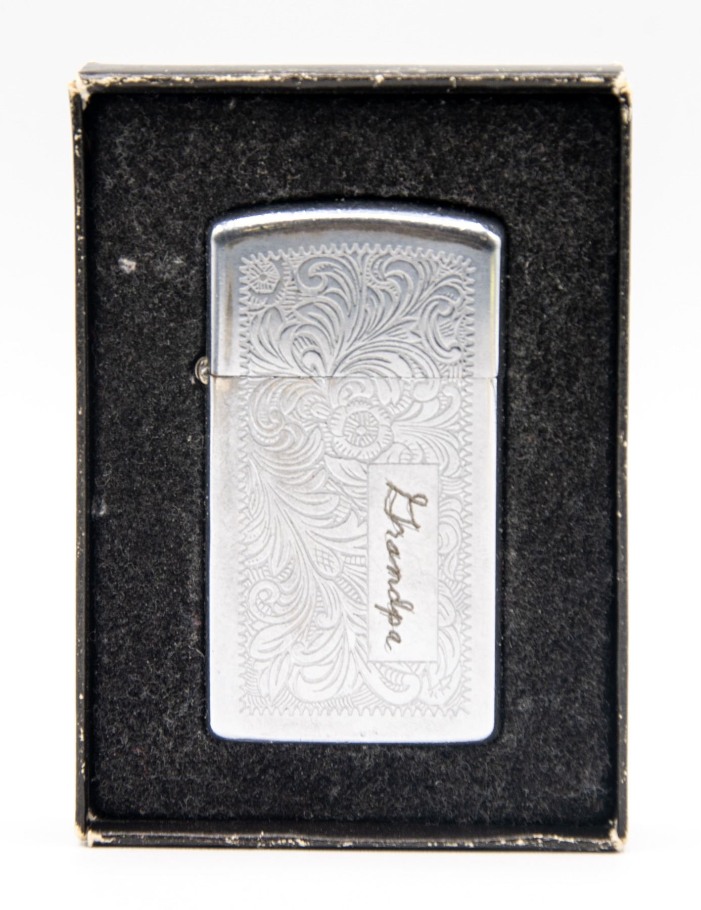 YUKON 1975 SLIM ZIPPO LIGHTER #1780 YUKON W/ ORIGINAL BOX CASE AND PAPER INSERT, ENGRAVED "GRANDPA"