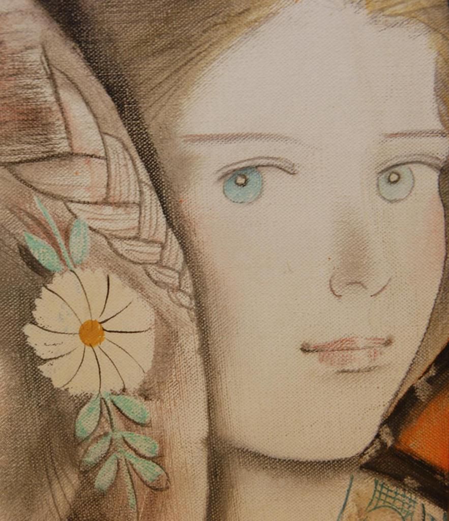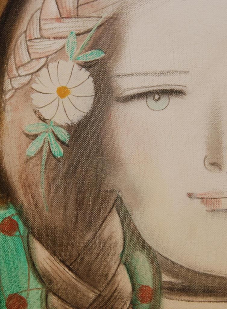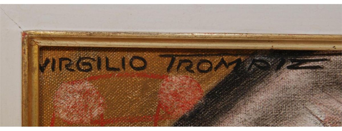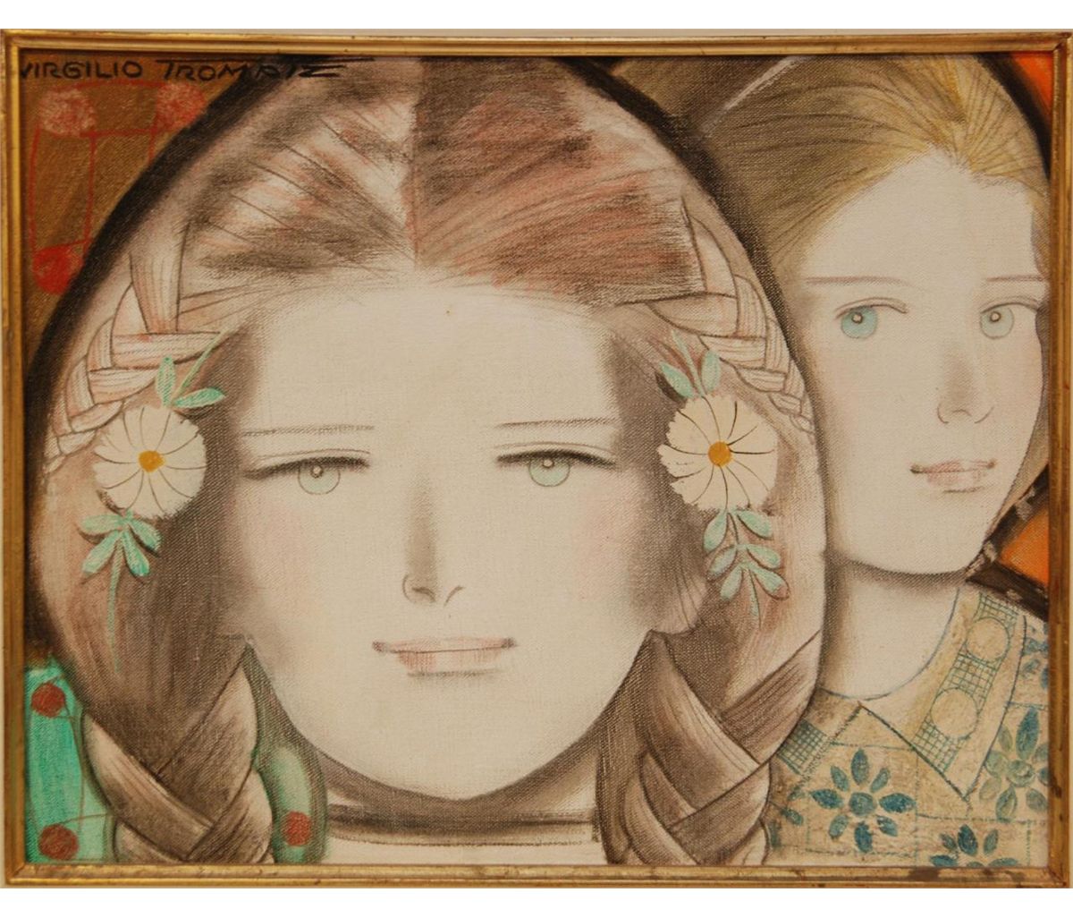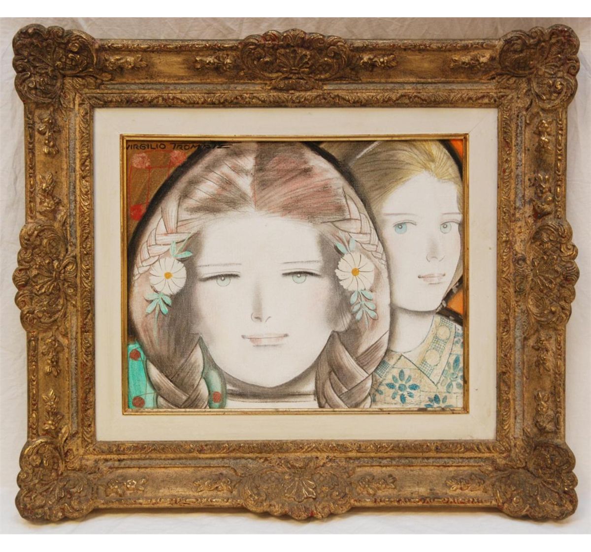 Virgilio Trompiz (VENEZUELAN, 1927) oil painting on canvas depicting two girls. Signed to upper left. Mounted in floral scrolled frame. Measures 13" height x 16 1/4" width + 4 1/4" mat & frame (33cm x 41.2cm + 10.7cm).