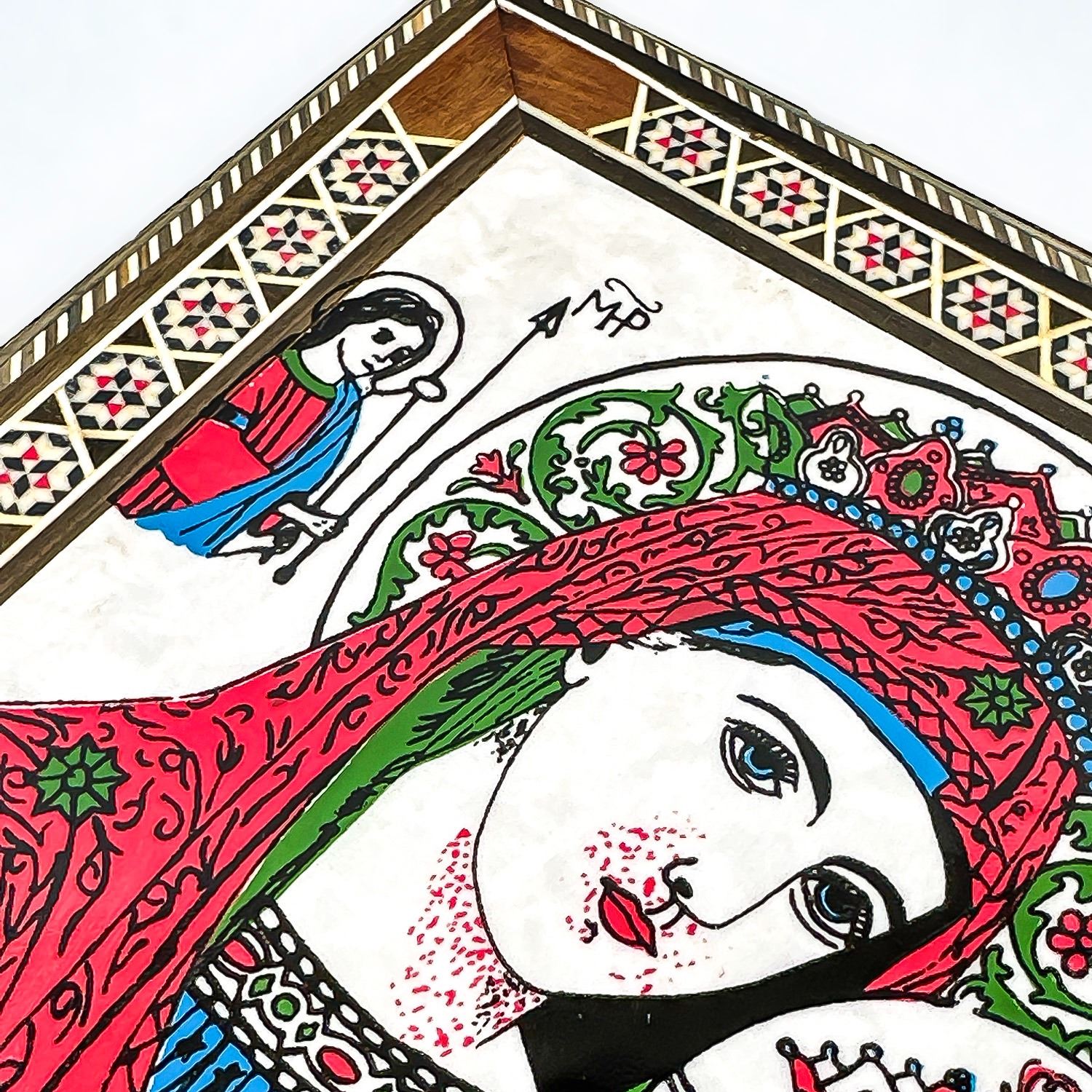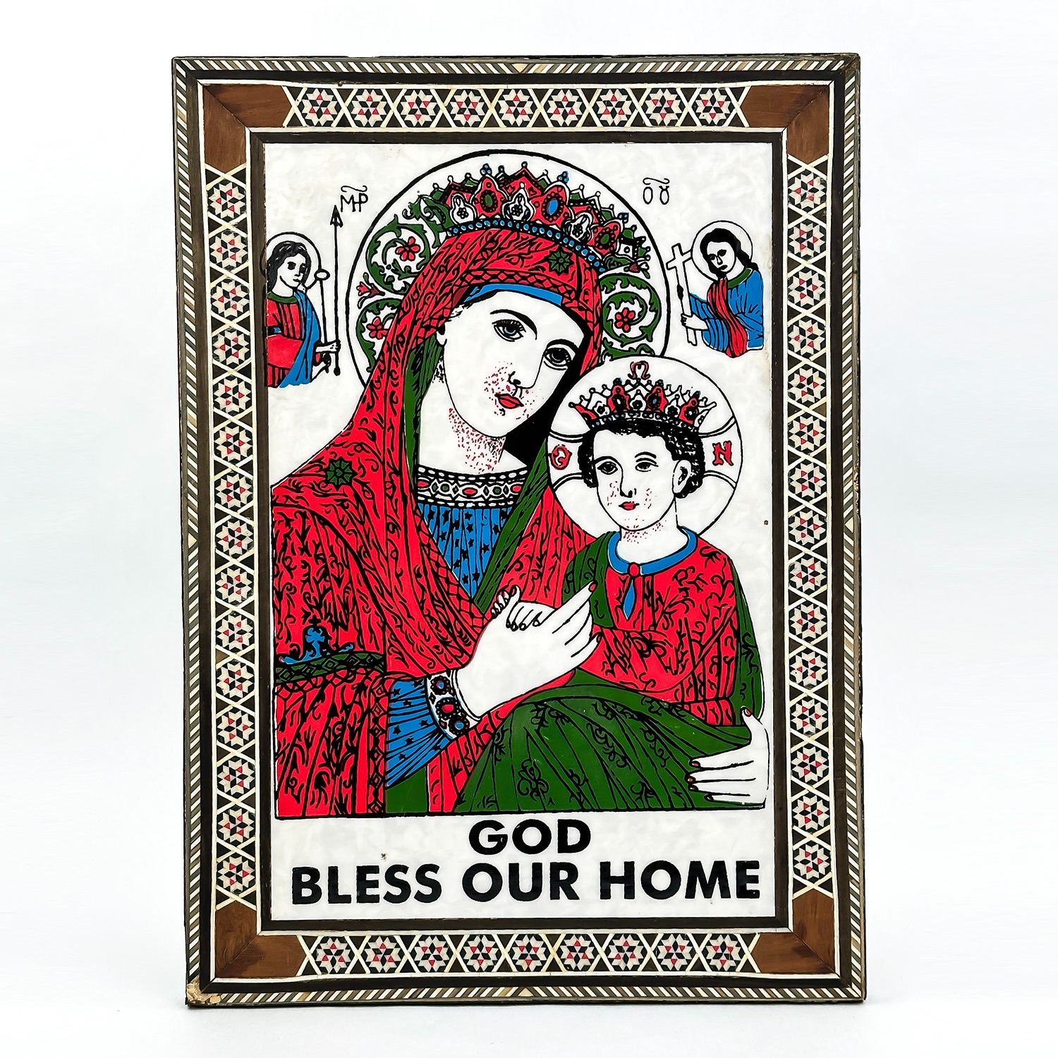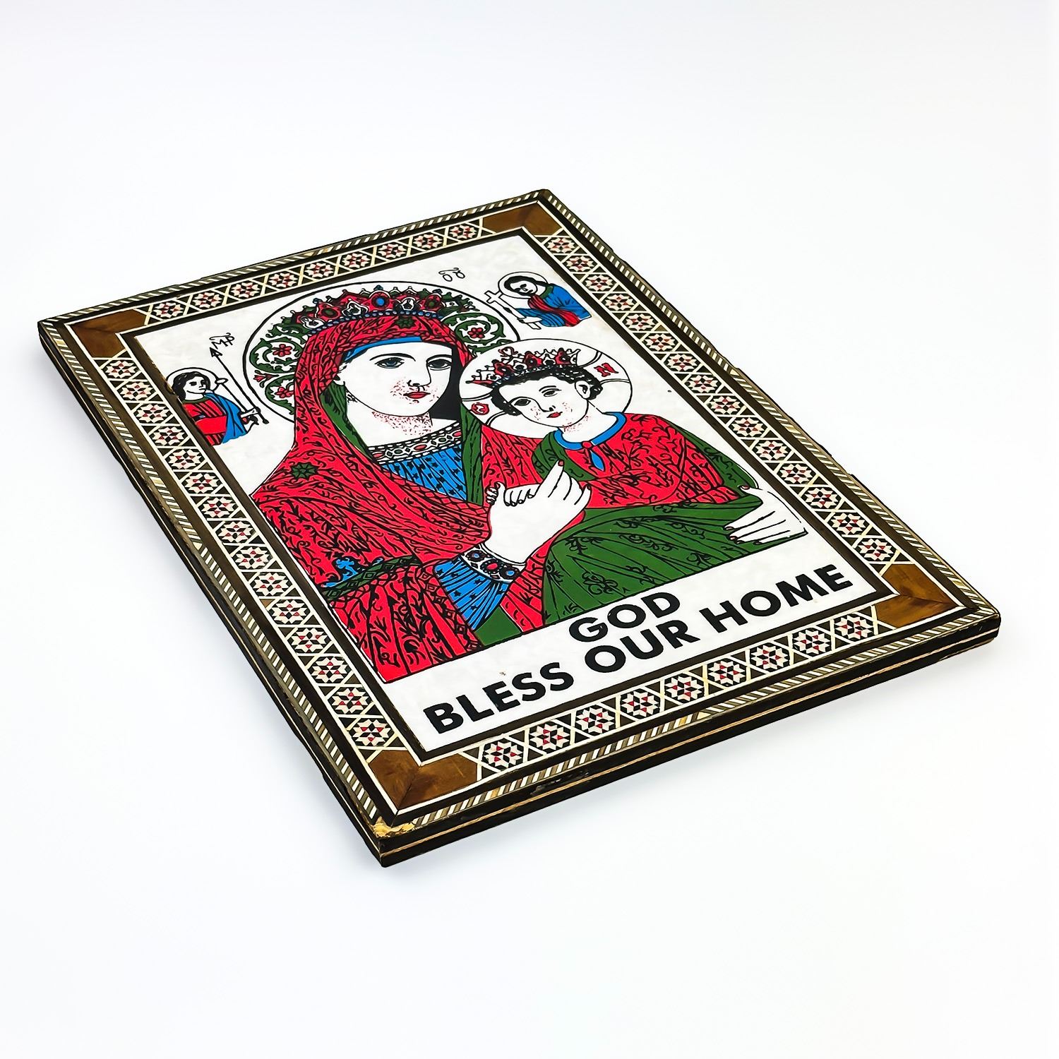 #8882 - VINTAGE HAND CRAFTED VIRGIN MARY AND BABY JESUS WOODEN WALL PLAQUE. SURFACE INLAY STYLE ART CREATION ON 1/2” BOARD. MEASURES: 13.75” (35 CM) BY 10” (25.5 CM)***ITEM(S) LOCATED IN LETHBRIDGE ALBERTA. FREE TRANSPORT TO EDMONTON OFFICE AVAILABLE FOR THIS AUCTION. WORLDWIDE SHIPPING IS AVAILABLE FOR ALL ITEMS
