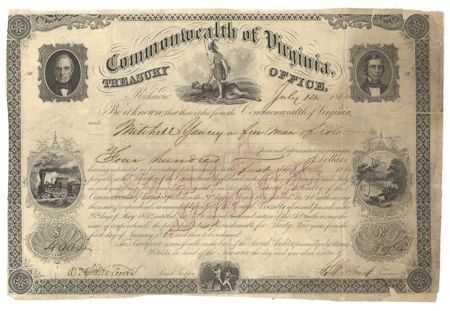 A most unusual Confederate bond, a Commonwealth of Virginia State Stock (in red) (Criswell #61A), July 14, 1860, incredibly made out to: "Mitchell Yancey a free man of color...". The bond, recovered from the Confederate Treasury only days after the city fell, bears an attached 2" x 8" section of the last flag to fly over the Confederate capitol building. The flag had been captured by American soldiers and divided among them with Union Chaplain John O. Foster, the first Union chaplain to preach a sermon in the newly-"liberated" city, also receiving a section of the huge flag. This stock certificate, along with many other stocks and bonds, was taken from the Confederate Treasury only days after the city fell by Foster, who had been present at Richmond's capitulation, and his visit to the Treasury is noted in his diary. Foster also noted that the section of fabric he had obtained had been part of the Confederate flag that had flown over the Confederacy's capitol building. Some staining at right with a weak, somewhat brittle fold thereat, hand-cut with uneven margins (as is usually the case), still quite good. Documents included picture Foster's note showing the flag's origin, with additional copies of his diary transcript, biography, analysis of the flag material, and so on. Our genealogical research shows that according to the 1880 census, a mulatto named Mitchell Yancey was born ca. 1834, most likely in Virginia, and in 1880 was employed as a "Waiter in Family". He was married to "Charlot" and had four children between the ages of 7 and 21.
