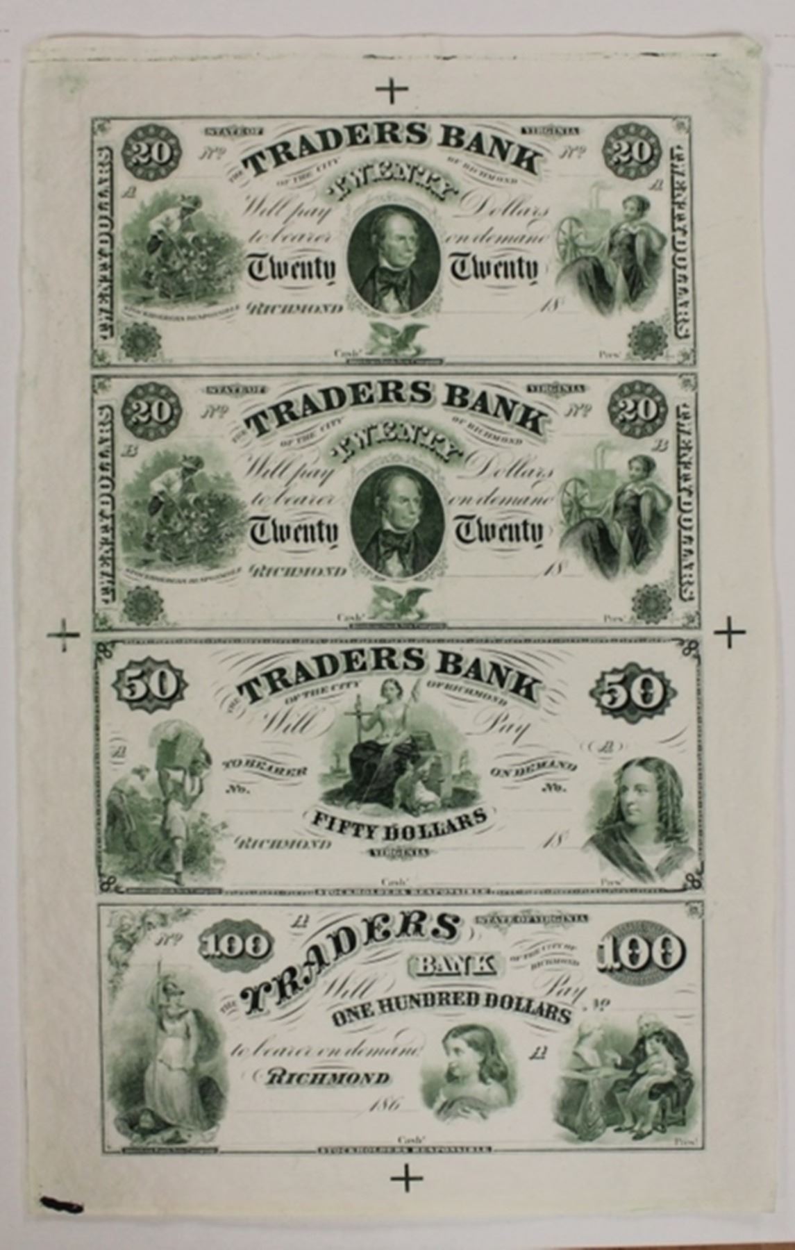 TRADERS BANK OF RICHMOND. MINT CONDITION. 2- $20, $50 AND $100. ESTIMATE: $200-$250