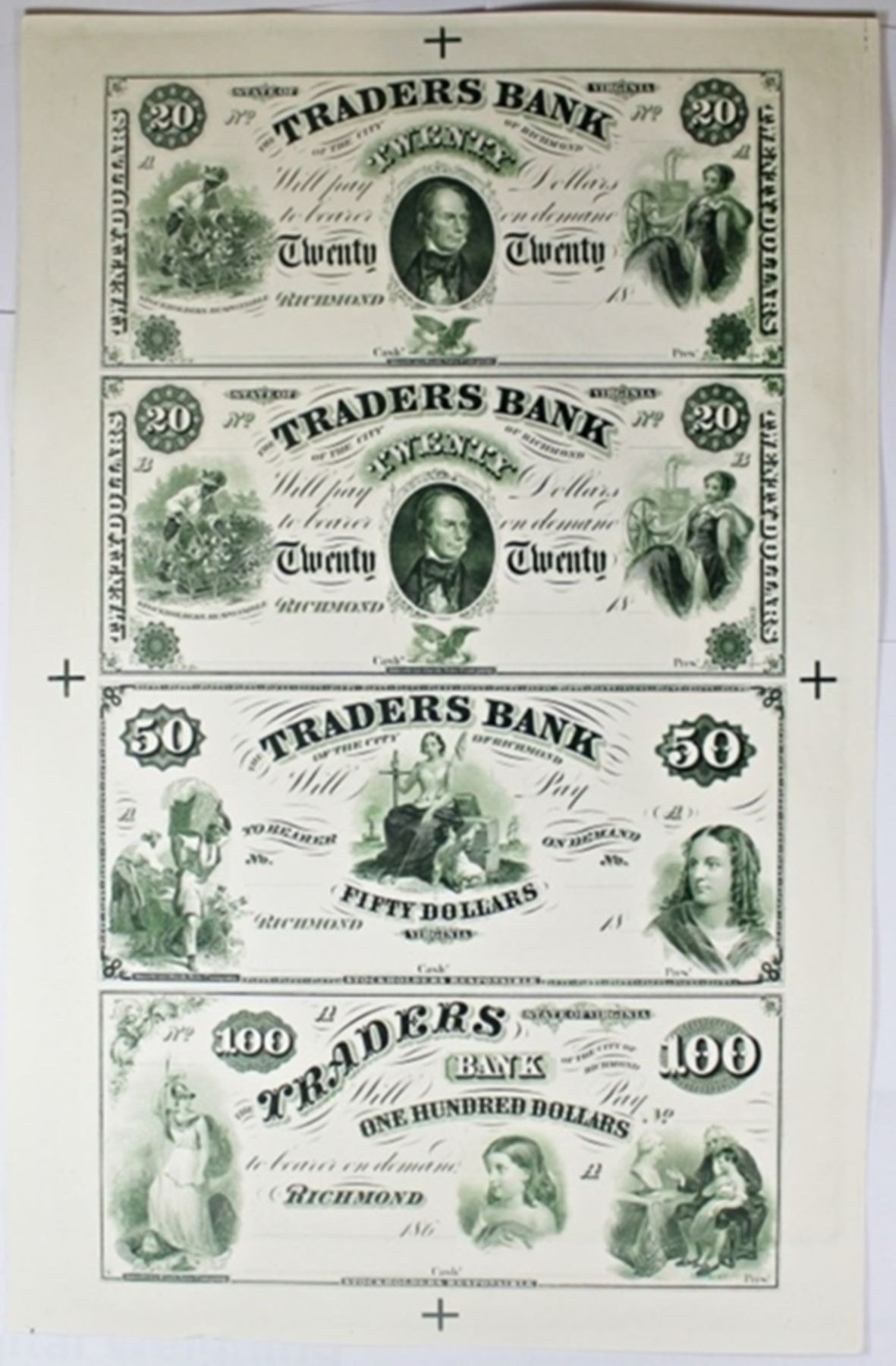 TRADERS BANK OF RICHMOND. MINT CONDITION. 2- $20, $50 AND $100. ESTIMATE: $200-$250
