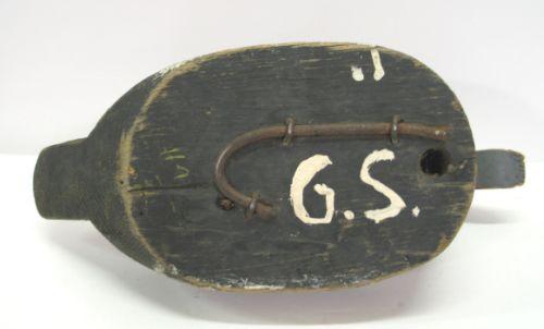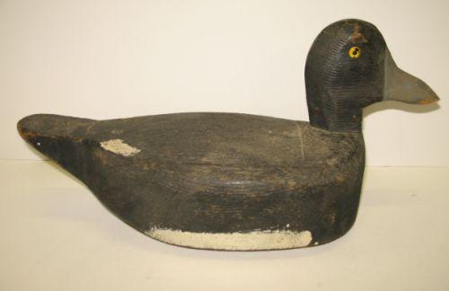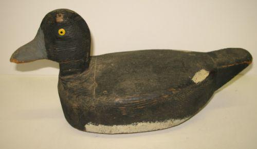 EASTERN SHORE, VIRGINIA BLUEBILL WORKING DECOY. Shows some wear and loss to paint. Unknown carver. Tack eyes. Initialed on bottom “G.S.”