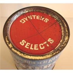 RAPPAHANNOCK RIVER BRAND OYSTER TIN. 1 gallon. Marked on body with blue sailboat decoration "Rappahannock River Brand Oysters-J.W. Ferguson Seafood Co.-Remlik, Virginia". Minor denting and rusting to top lid.