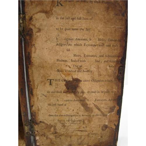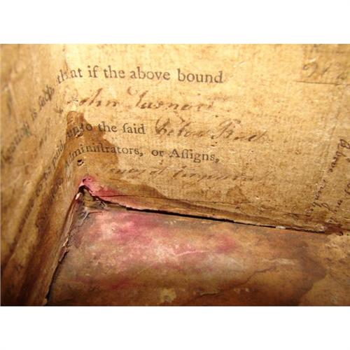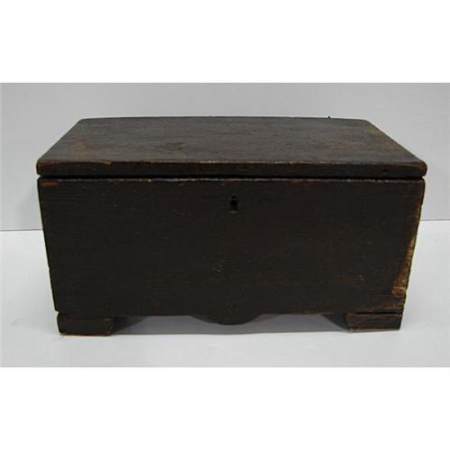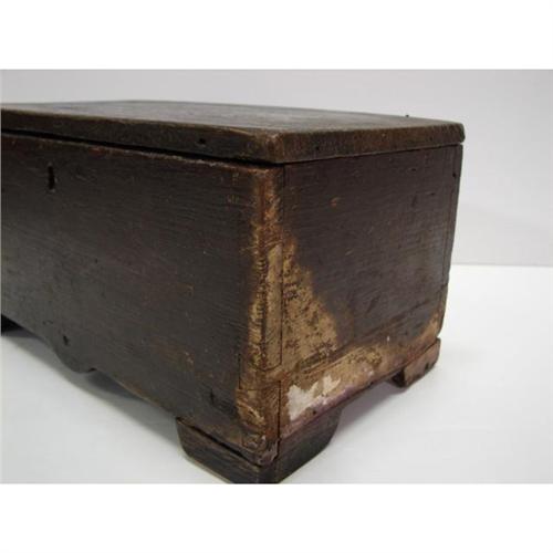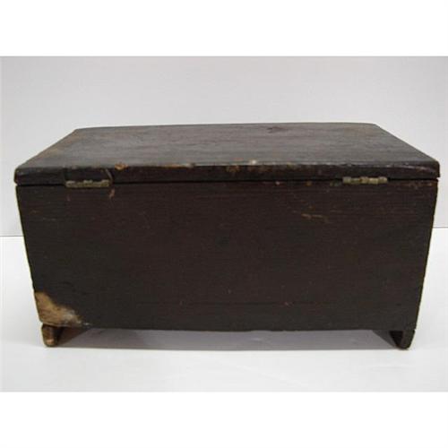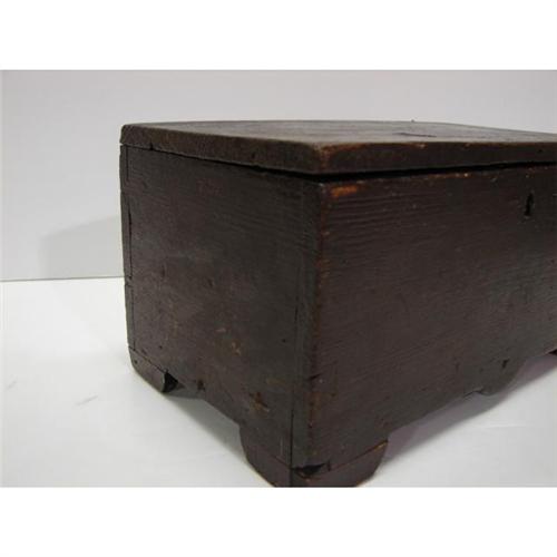 VIRGINIA PAINTED YELLOW PINE DOCUMENT BOX. Paper lined with 1770’s partially printed last will and testament. Inside the front right corner of the box, on the reverse of the front board, “of Virginia” is legible. Dovetailed case. Mid 19th century. Feet replaced, central drop probably original. Brown paint over earlier ochre paint. Gouge to front right edge near bottom. 10.25” wide.