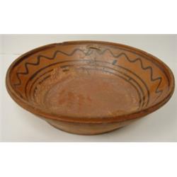 VIRIGINA REDWARE MILK BOWL. Has brown slip decoration on inside. Has crack extending from top to middle of bottom and chip along inside edge of rim measuring 1" L. 3.75" H, 13.5" Dia.
