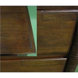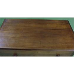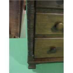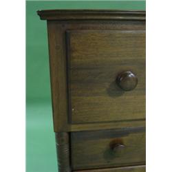 VIRGINIA WALNUT 4 DRAWER CHEST. Columns on front. Thumb molding around top. Replaced bracket feet. Paneled sides. 4 dovetailed drawers. Pegged construction. Two drawer fronts are repaired. 42.5" H, 38.5" W, 19.75" D