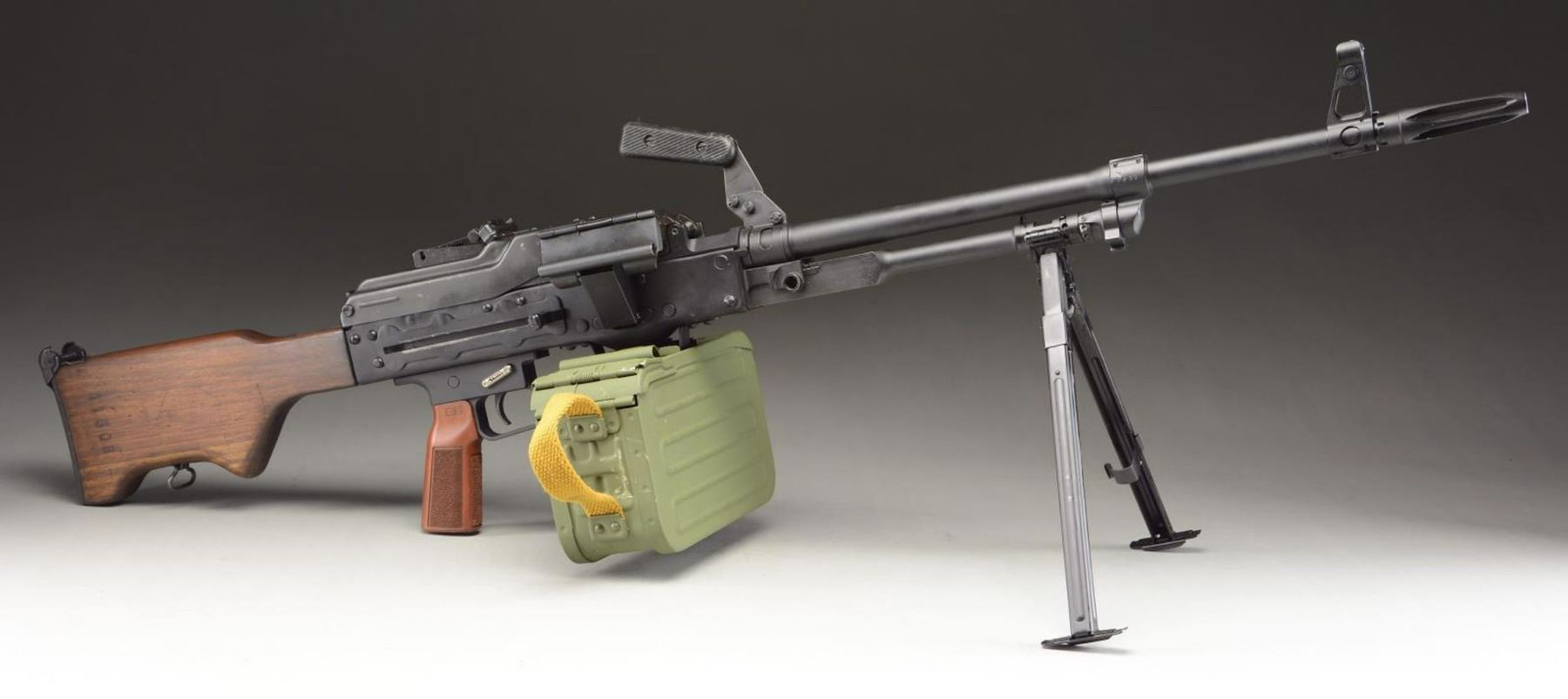 Cal. 7.62x54R. S# 11508. Bbl. 23.75". The Zastava Arms M84 is a variation of the Russian PKM Light Machine Gun intended for infantry units, also excelling at long distance precision. This particular example was built by Visionary Arms as a semiautomatic only version, & utilizes a modified AR-15 type trigger group. Closed bolt, gas operated mechanism, charged w/ right side reciprocating charging handle. Dark matte black finish on all exposed metal surfaces. Barrel is terminated w/ correct M60 style flash hider. Protected post front sight. Tangent rear sight adjustable to 1500 meters as well as windage adjustable. Folding bipod attaches rear of gas regulator below barrel. Left side folding carry handle forward of front trunnion w/ black plastic handle. Left side safety selector. Red/brown dyed pistol grip to match wood finish. Solid, hardwood shoulder stock w/ flip up shoulder support. Sling swivels front & rear. Left side receiver scope mount. Left side spring loaded dust cover. UNATTACHED ACCESSORIES: 100 round belt box, green w/ tan canvas strap. CONDITION: Finish coverage is complete & consistent. Only thinning is in areas of mechanical intervention & a few high spots. It doesn't appear to have been used much, if at all. Pistol grip looks beautiful & wood shoulder stock only has a few typical impressions. Bore is bright w/ strong rifling. Fire control mechanism appears to function correctly when cycled by hand. (23-2391/JZ). MODERN. $7,000-9,000.