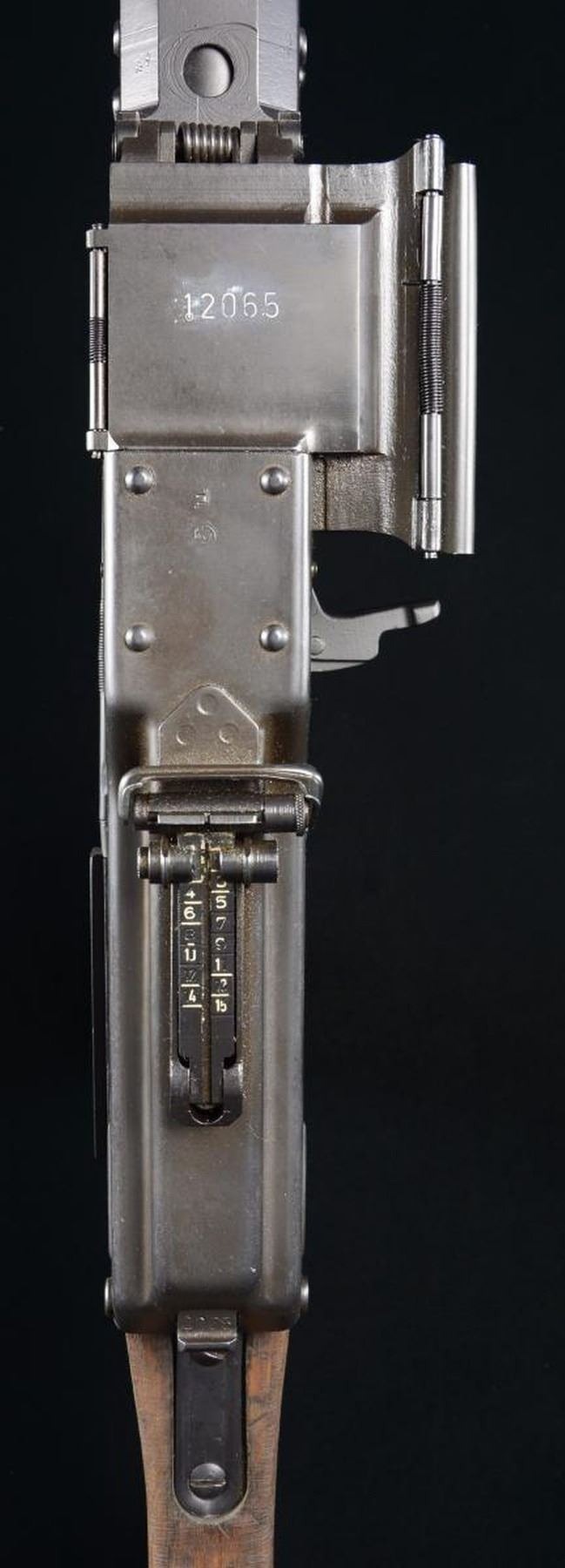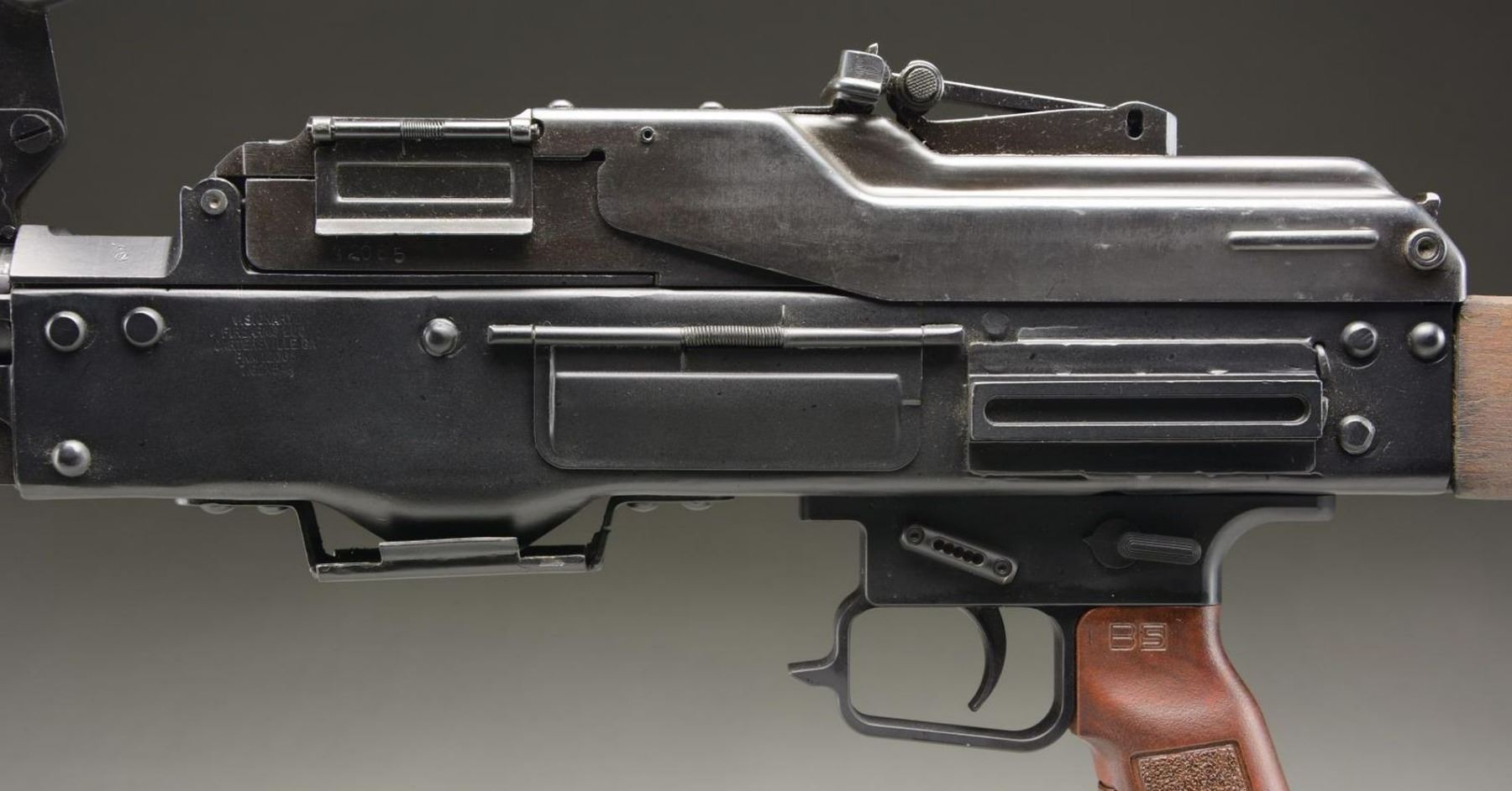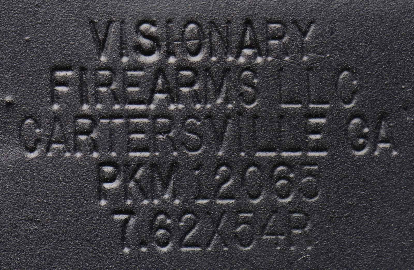 Cal. 7.62x54R. S# 12065. Bbl. 23.75". The Zastava Arms M84 is a variation of the Russian PKM Light Machine Gun intended for infantry units, also excelling at long distance precision. This particular example was built by Visionary Arms as a semiautomatic only version & utilizes a modified AR-15 type trigger group. Closed bolt, gas operated mechanism, charged w/ right side reciprocating charging handle. Dark matte black finish on all exposed metal surfaces. Barrel is terminated w/ correct M60 style flash hider. Protected post front sight. Tangent rear sight adjustable to 1500 meters as well as windage adjustable. Folding bipod attaches rear of gas regulator below barrel. Left side folding carry handle forward of front trunnion w/ black plastic handle. Left side safety selector. Red/brown dyed pistol grip to match wood finish. Solid, hardwood shoulder stock w/ flip up shoulder support. Sling swivels front & rear. Left side receiver scope mount. Left side spring loaded dust cover. MAGS: 1 original 100 rd belt. UNATTACHED ACCESSORIES: 100 round belt box, green w/ tan canvas strap. CONDITION: finish coverage is complete & consistent. Only thinning is in areas of mechanical intervention & a few high spots. It doesn't appear to have been used much, if at all. Pistol grip looks beautiful & wood shoulder stock only has a few typical impressions. Bore is bright w/ strong rifling. Fire control mechanism appears to function correctly when cycled by hand. (23-2360/JZ). MODERN. $7,000-9,000.