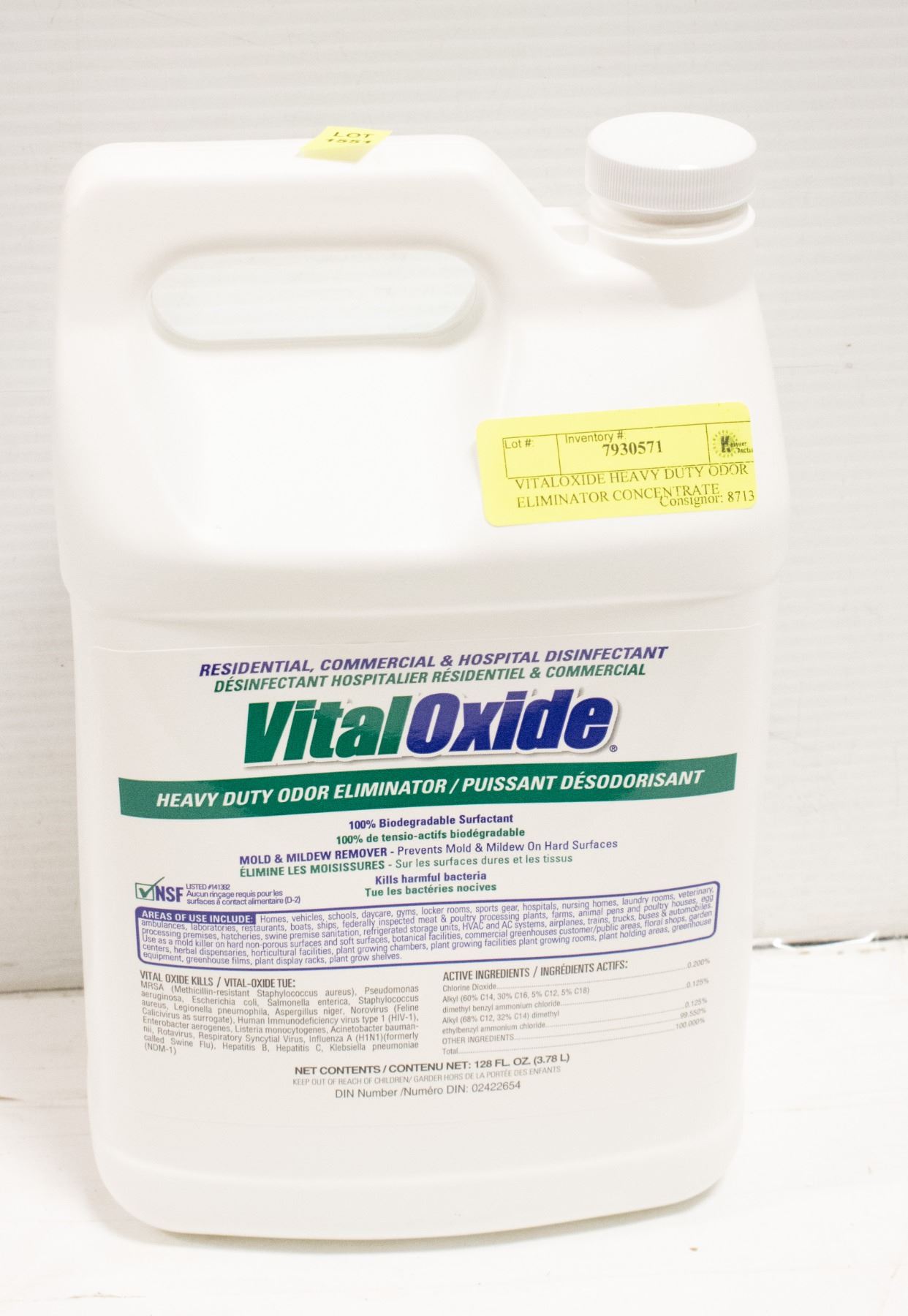 NON CORROSIVE, 100% BIODEGRADABLE, MOLD AND MILDEW REMOVER. FOR RESIDENTIAL, COMMERCIAL AND HOSPITAL DISINFECTING USES. 3.78L BOTTLE **SHIPPING NOT AVAILABLE** **ALL ITEMS MUST BE REMOVED BY 5PM SATURDAY, FEBRUARY 4TH 2023.** ALL REMAINING ITEMS WILL BE SUBJECT TO A $6.00 PER DAY STORAGE CHARGE. ANY ITEMS REMAINING AFTER MONDAY, FEBRUARY 20TH, 2023 WILL BE CONSIDERED FORFEITED. NO REFUNDS WILL BE ISSUED FOR FORFEITED ITEMS. TO SCHEDULE A PICK UP APPOINTMENT CLICK HERE
