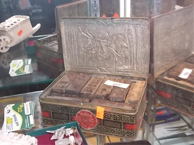 VITNAGE METAL TIN WITH VERY OLD SET OF PROBABLY HAND MADE DOMINO'S