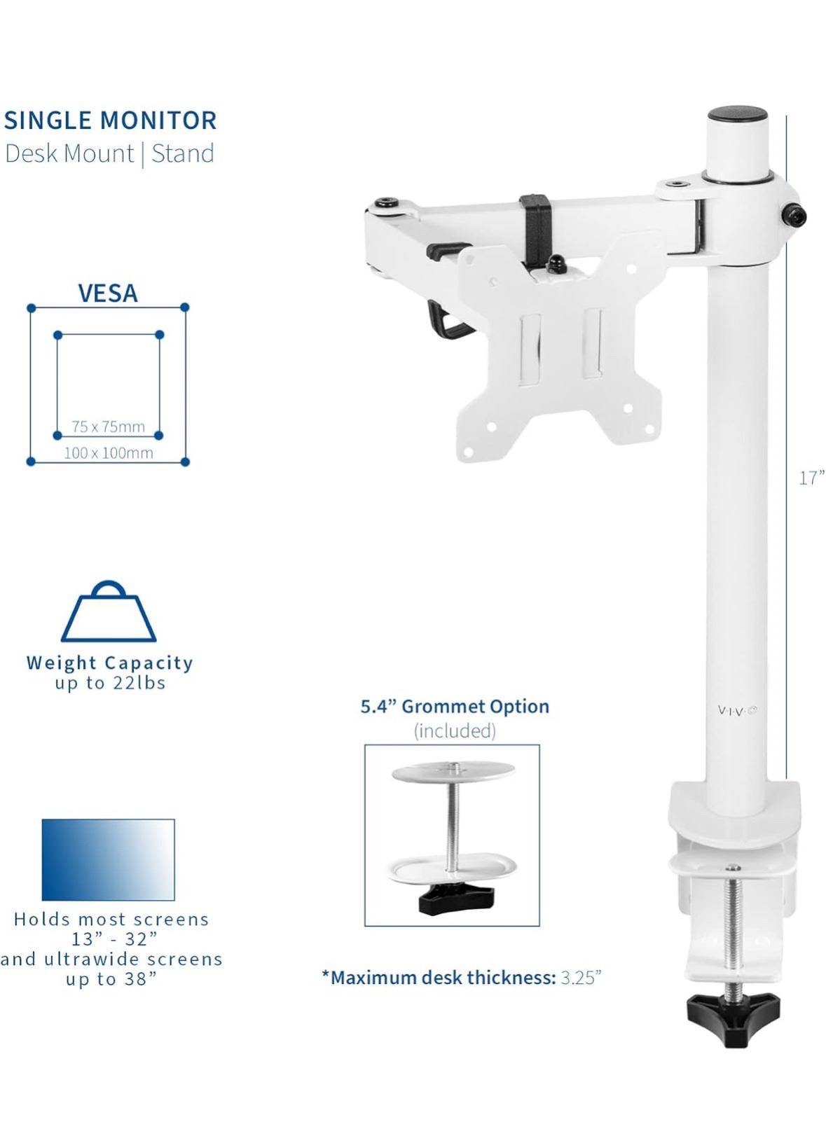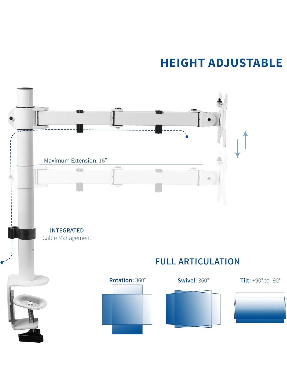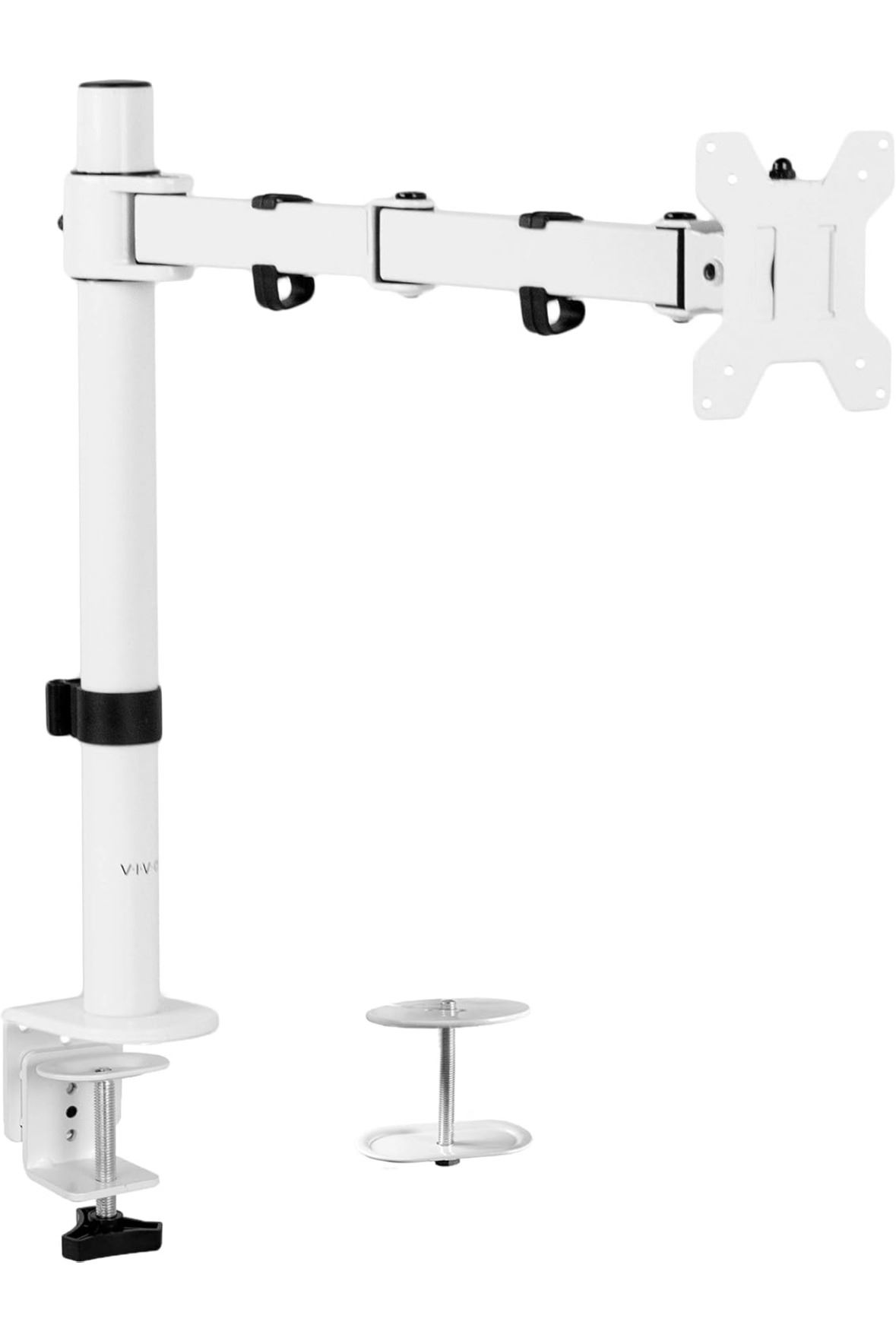 VIVO single monitor arm desk mount, holds screens up to 32in regular and 38in ultrawide, fully adjustable with c-clamp, color white, model STAND-V001W (refurbished in box), retail $44.99 per piece, total lot retail $629.86