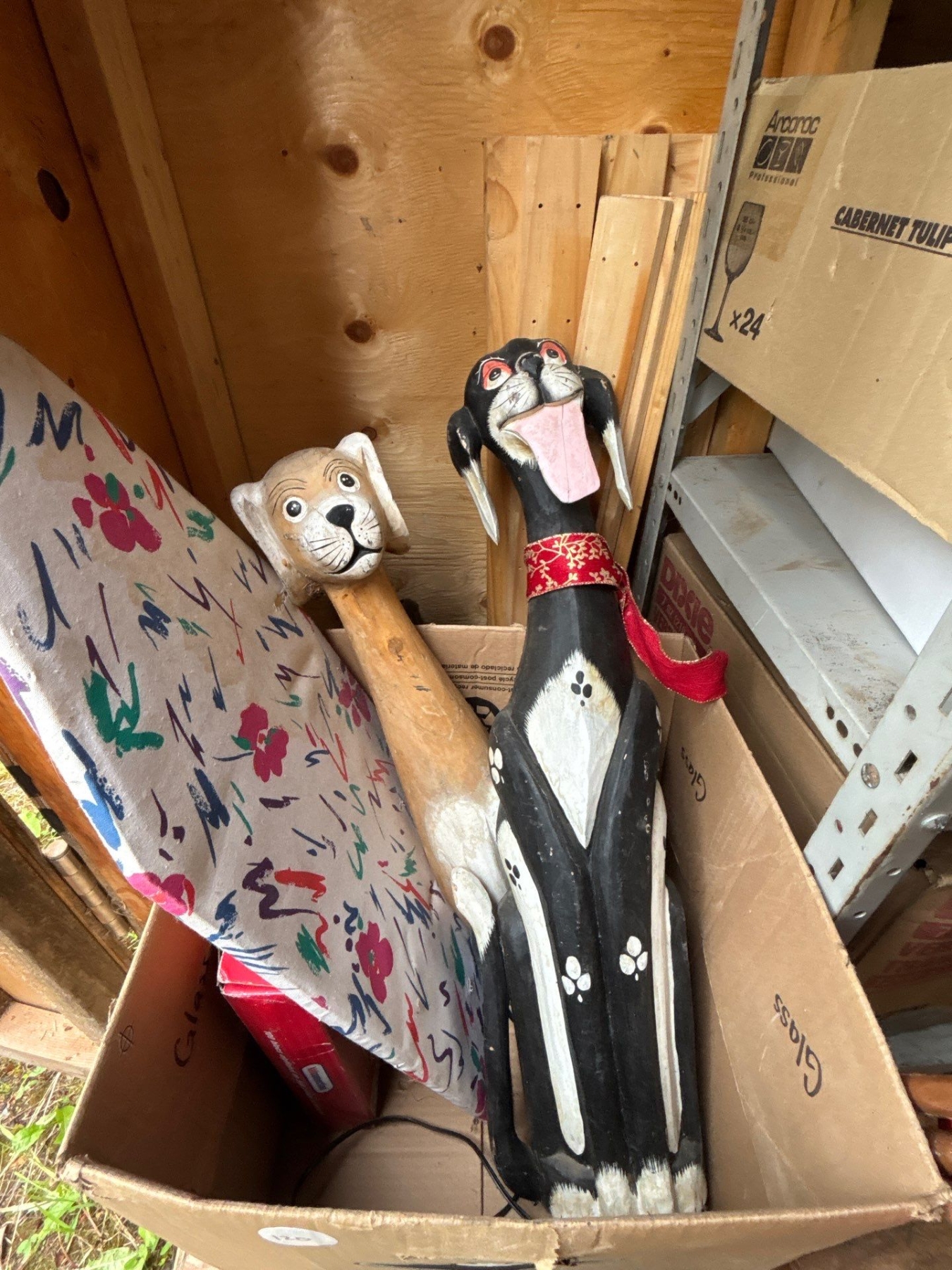 VIntage orange, stacking stools, diecast John Deere tractor two wooden cat sculptures, and small iro