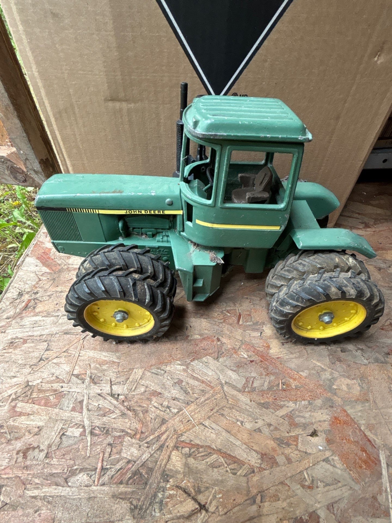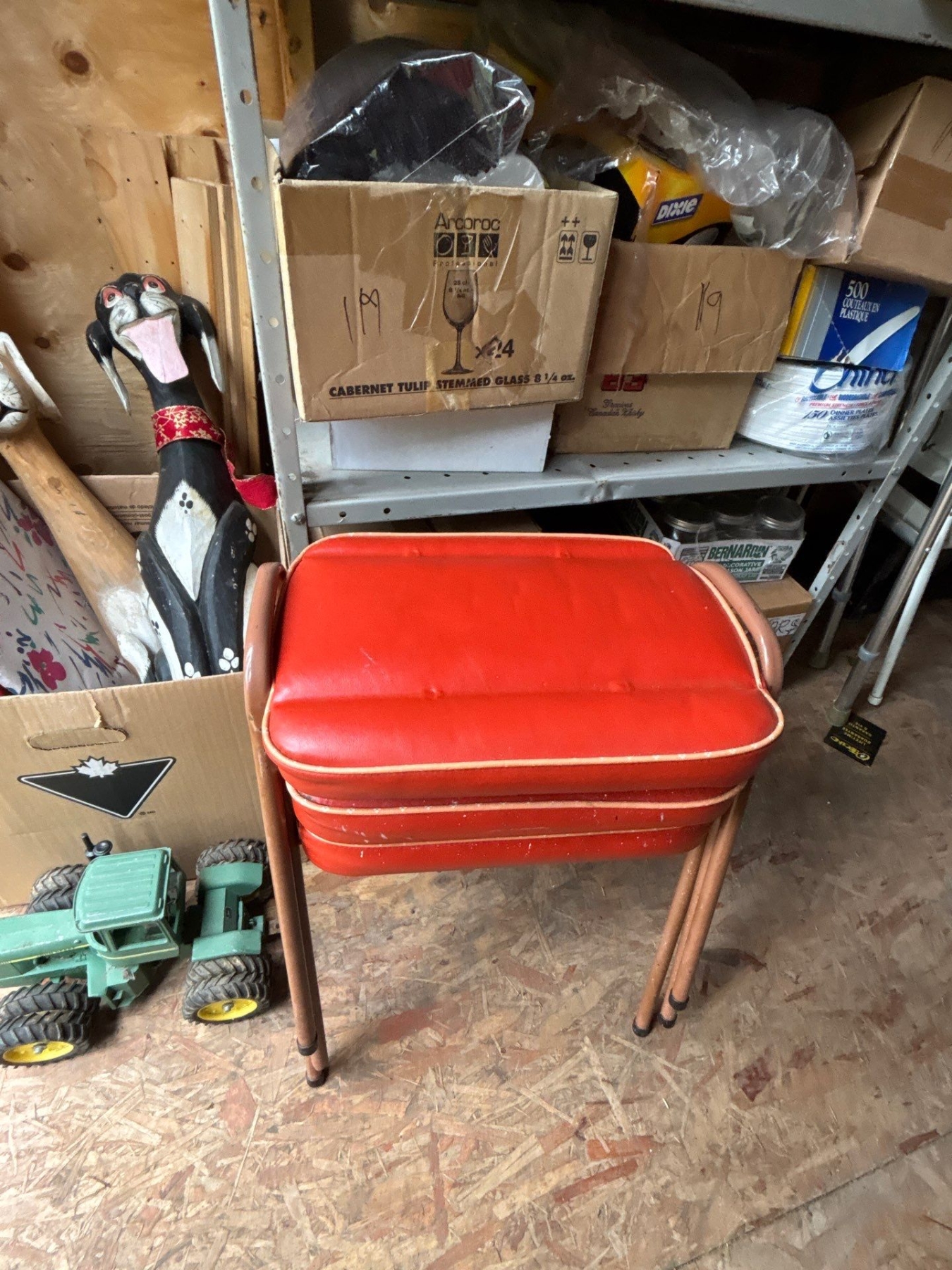 VIntage orange, stacking stools, diecast John Deere tractor two wooden cat sculptures, and small ironing board
