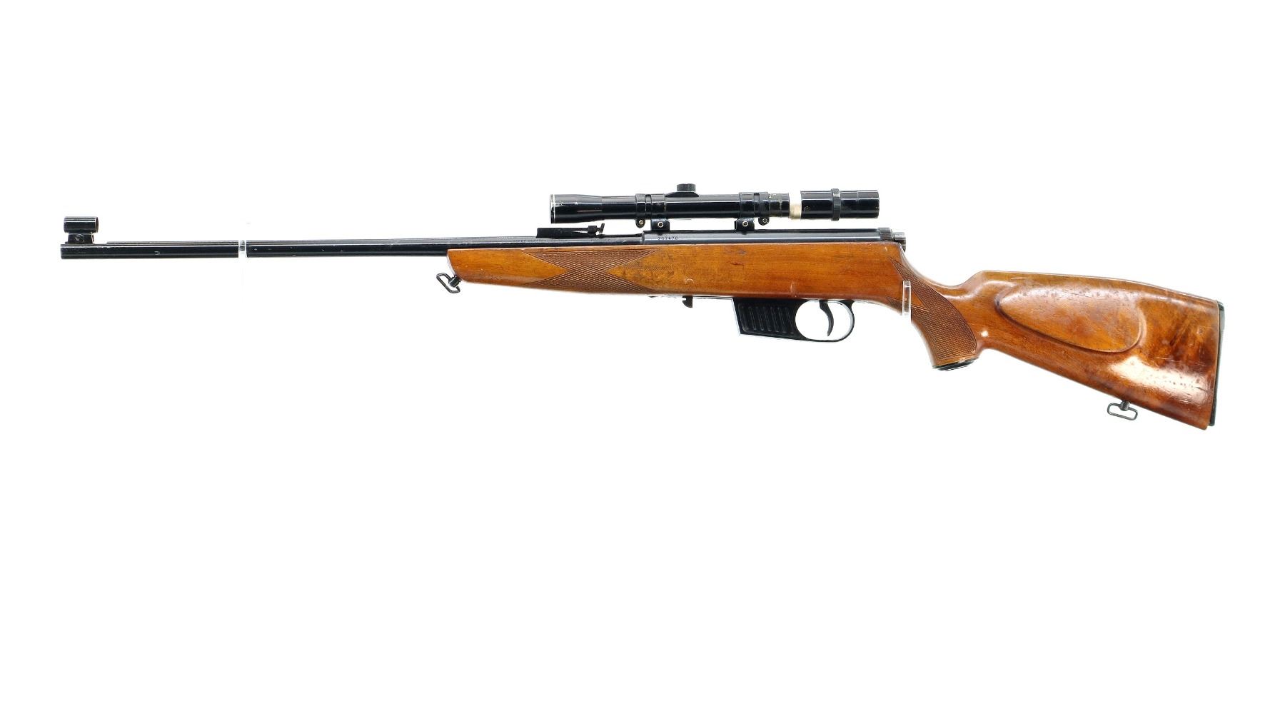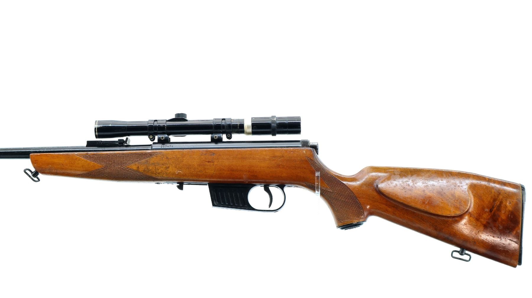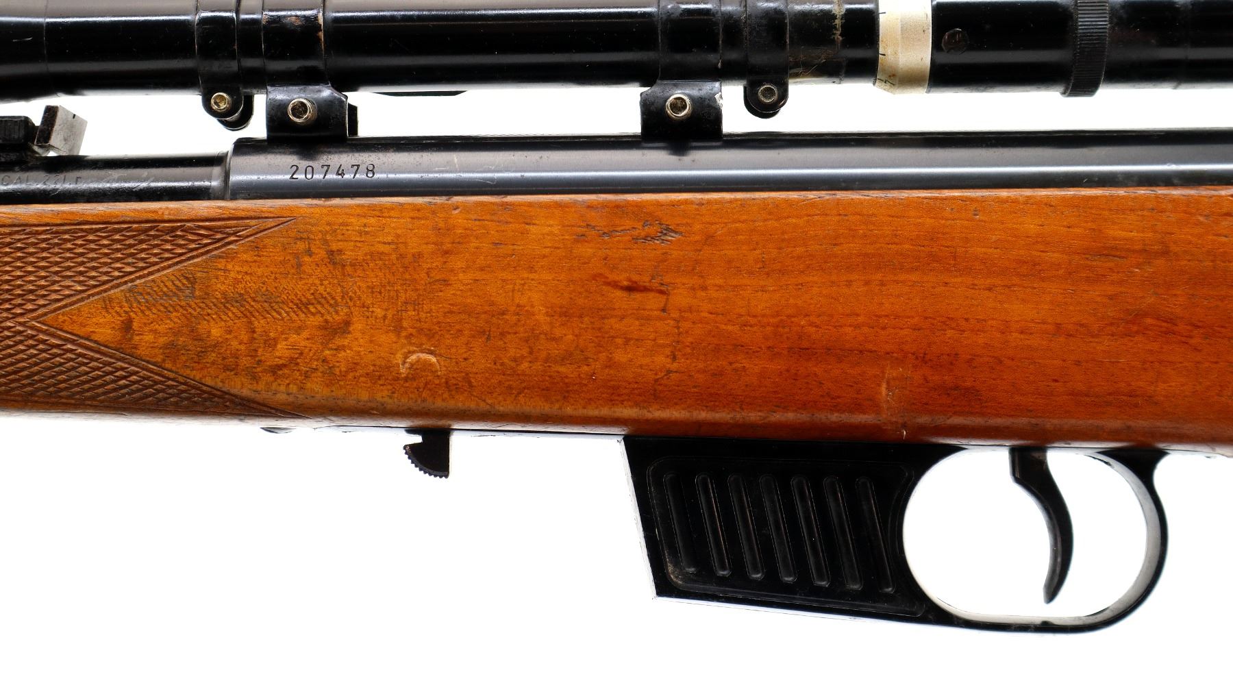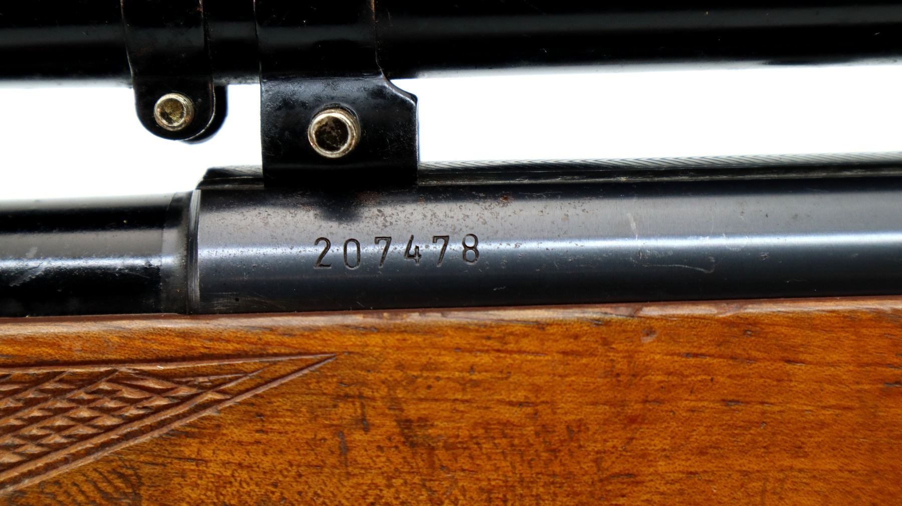 Main Description: Post front sight with hood and ramp, adjustable u notched rear sight, black painted barrel, blued grooved receiver with 3-7x20 scope installed, clear optics with fine crosshair. One piece wood stock, checkered forearm and pistol grip, cheek rest, grooved black polymer butt plate broken at toe, grip cap, sling swivels.