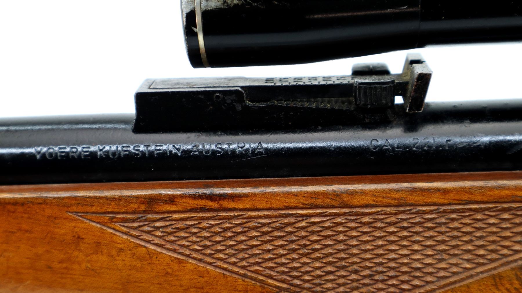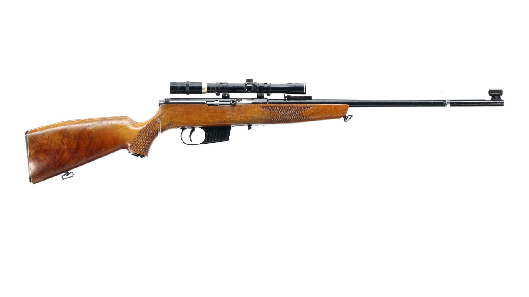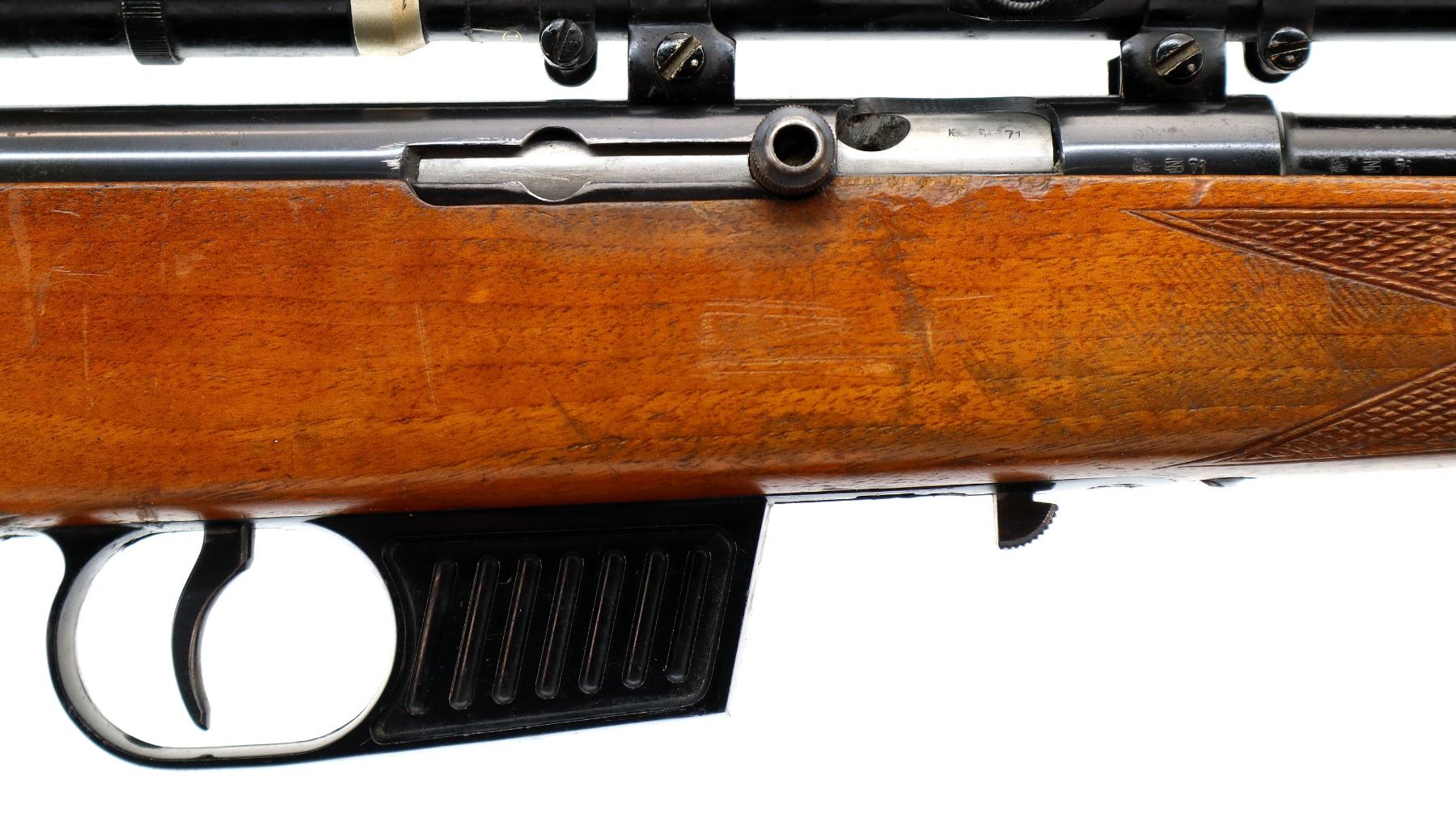 Main Description: Post front sight with hood and ramp, adjustable u notched rear sight, black painted barrel, blued grooved receiver with 3-7x20 scope installed, clear optics with fine crosshair. One piece wood stock, checkered forearm and pistol grip, cheek rest, grooved black polymer butt plate broken at toe, grip cap, sling swivels.
