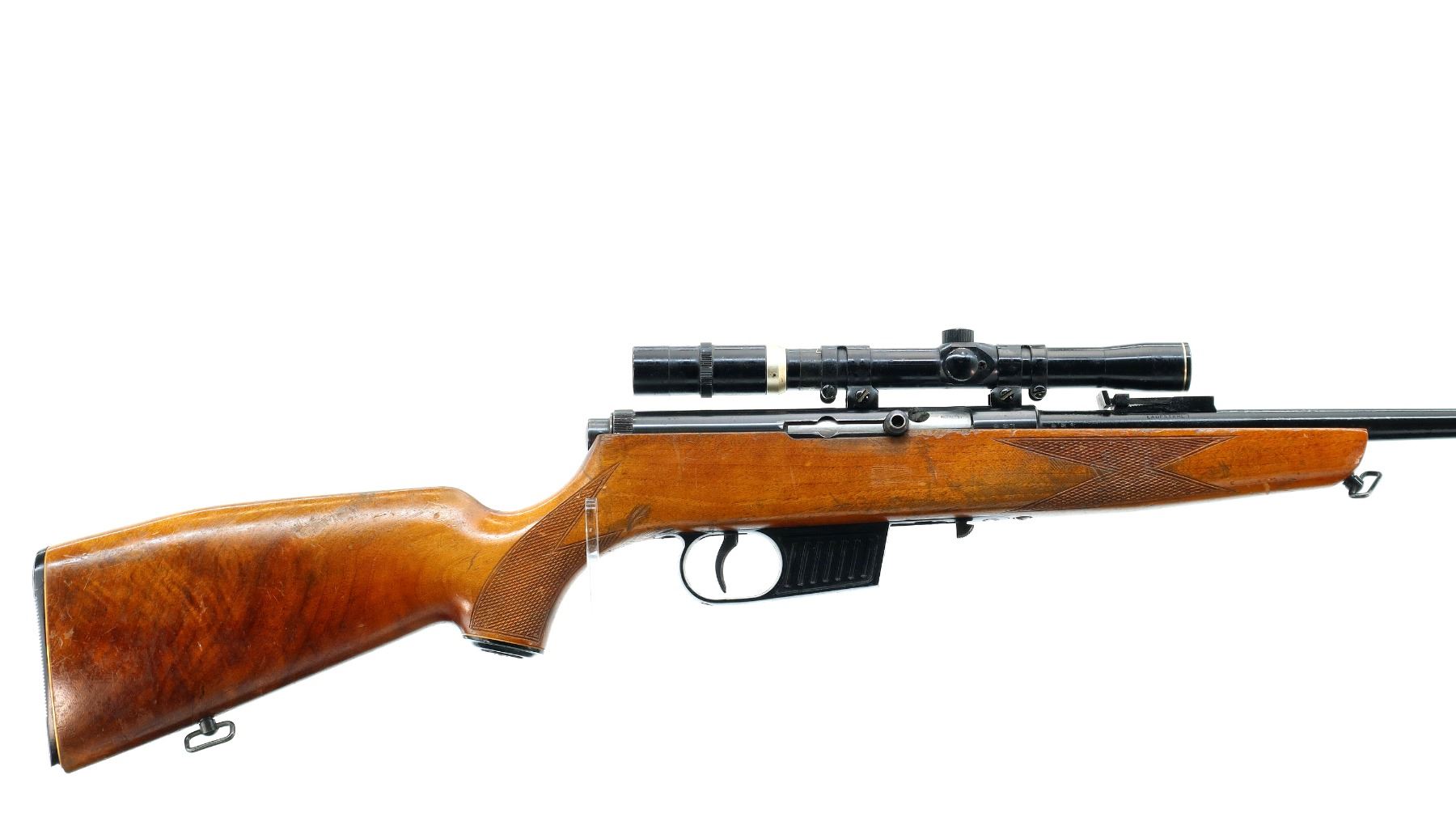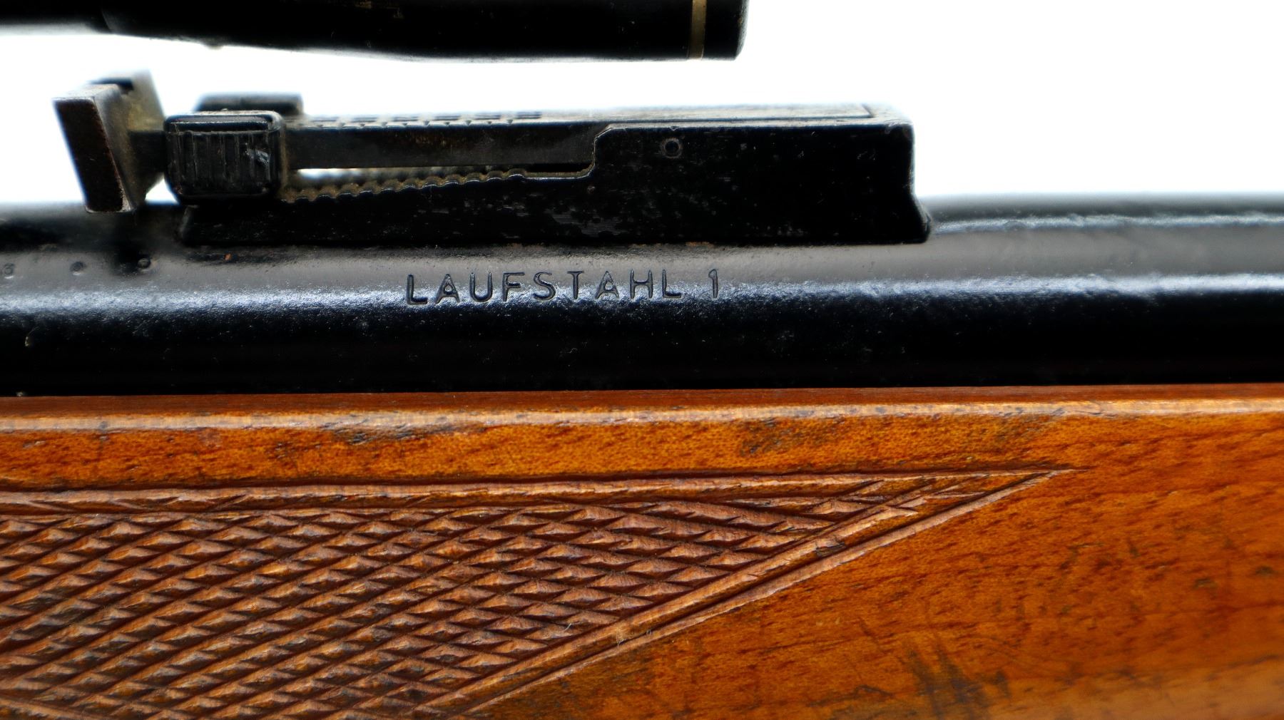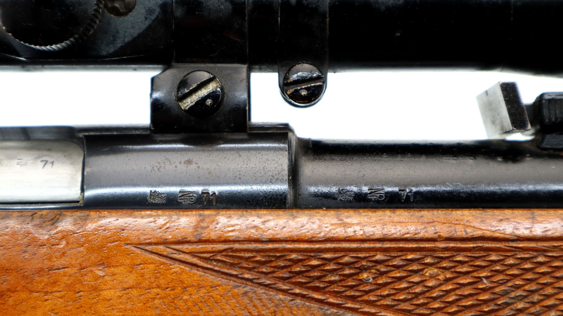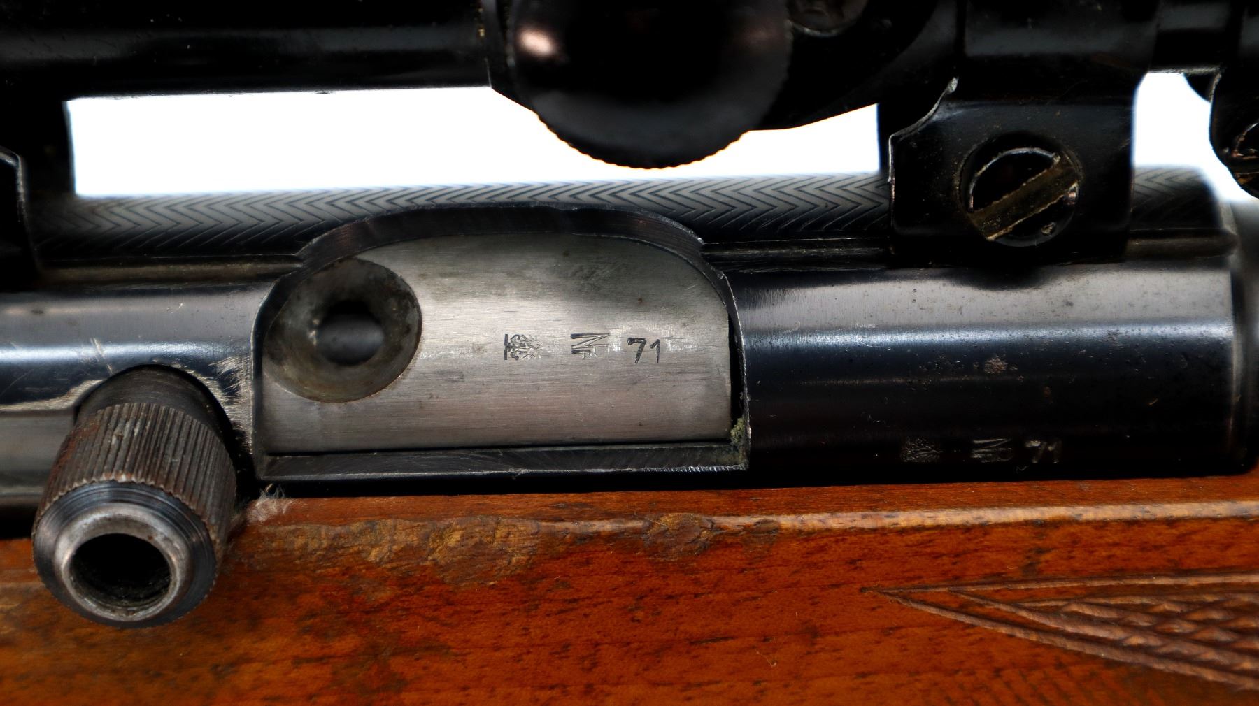 Main Description: Post front sight with hood and ramp, adjustable u notched rear sight, black painted barrel, blued grooved receiver with 3-7x20 scope installed, clear optics with fine crosshair. One piece wood stock, checkered forearm and pistol grip, cheek rest, grooved black polymer butt plate broken at toe, grip cap, sling swivels.