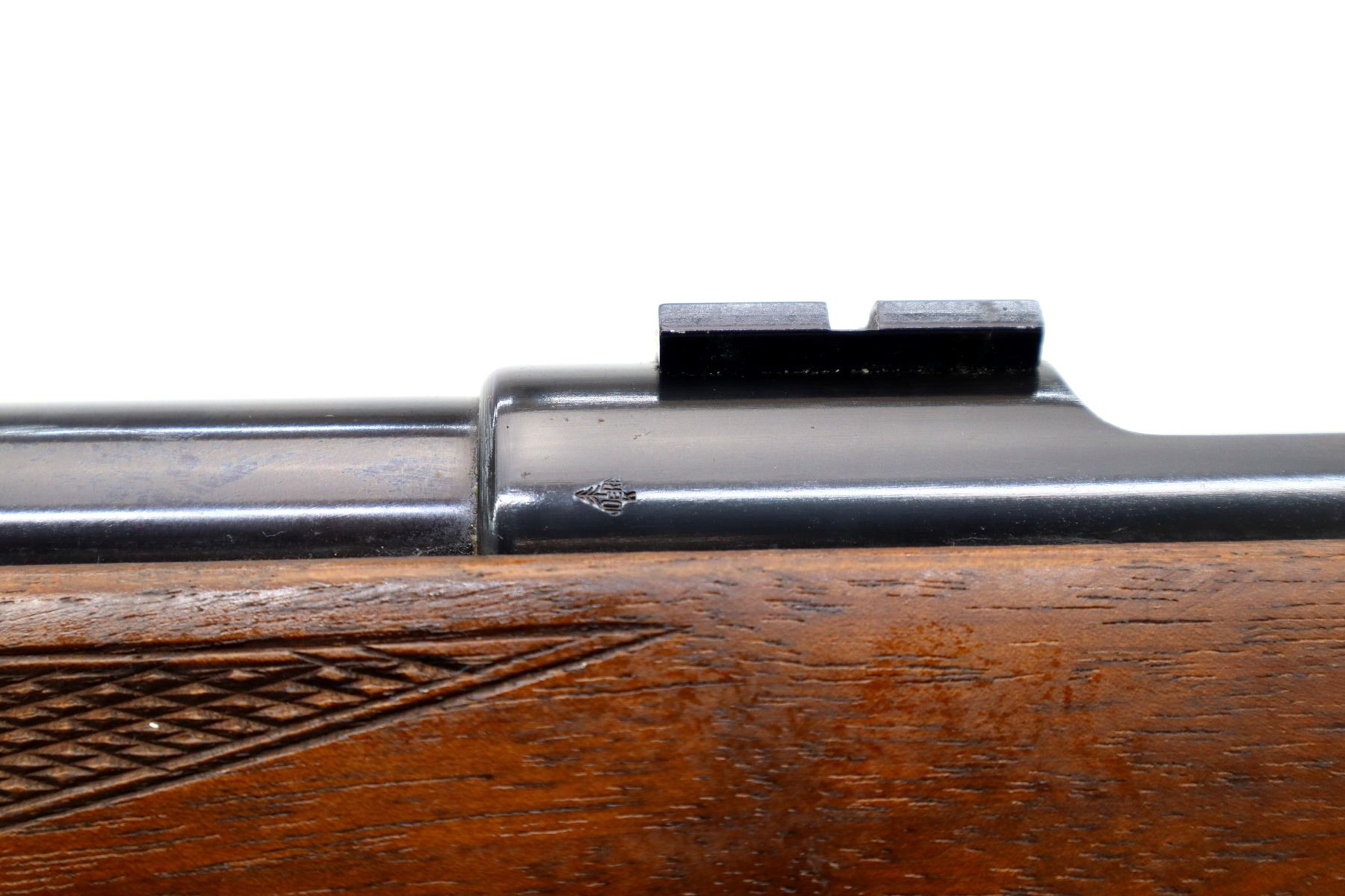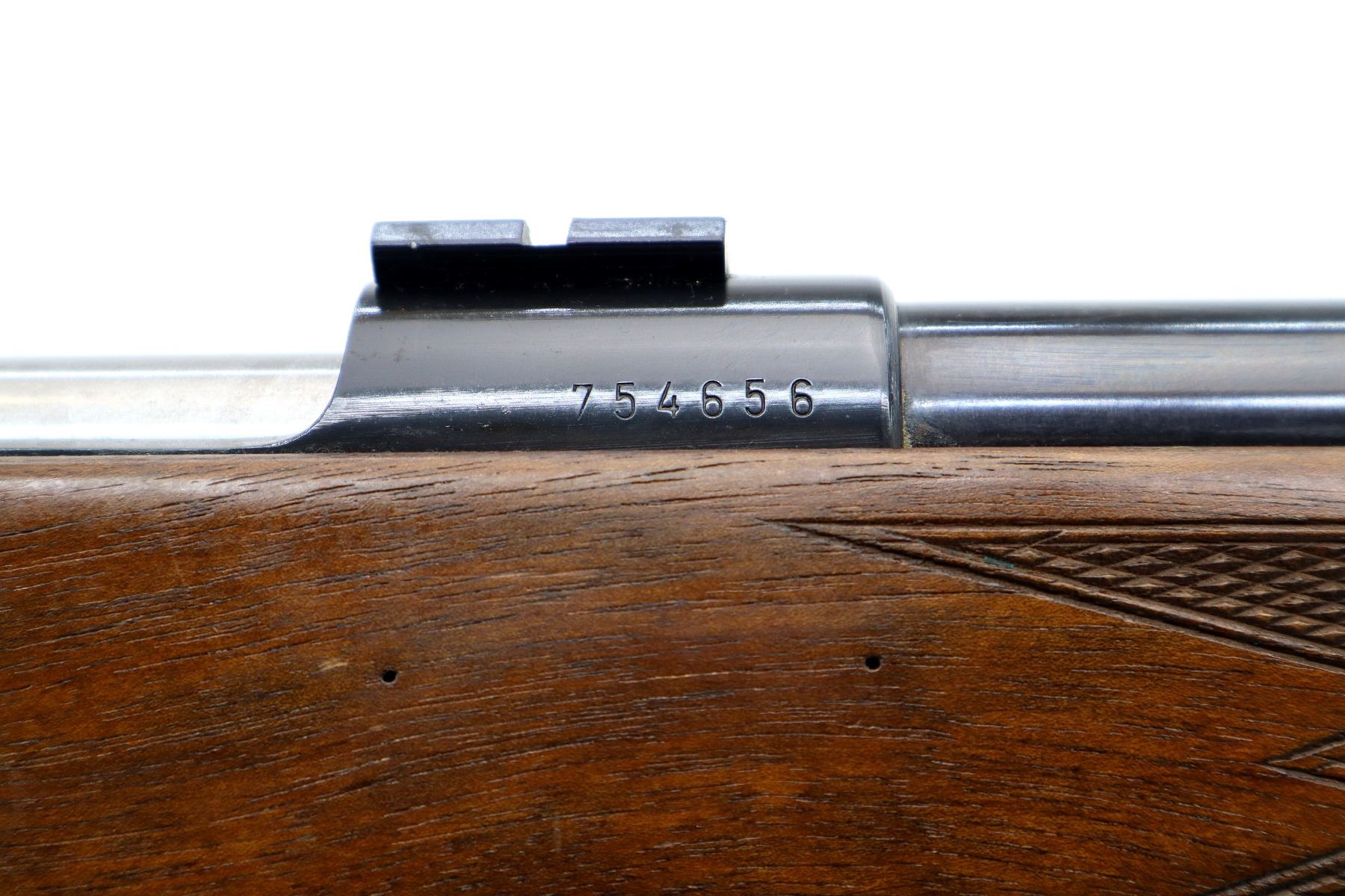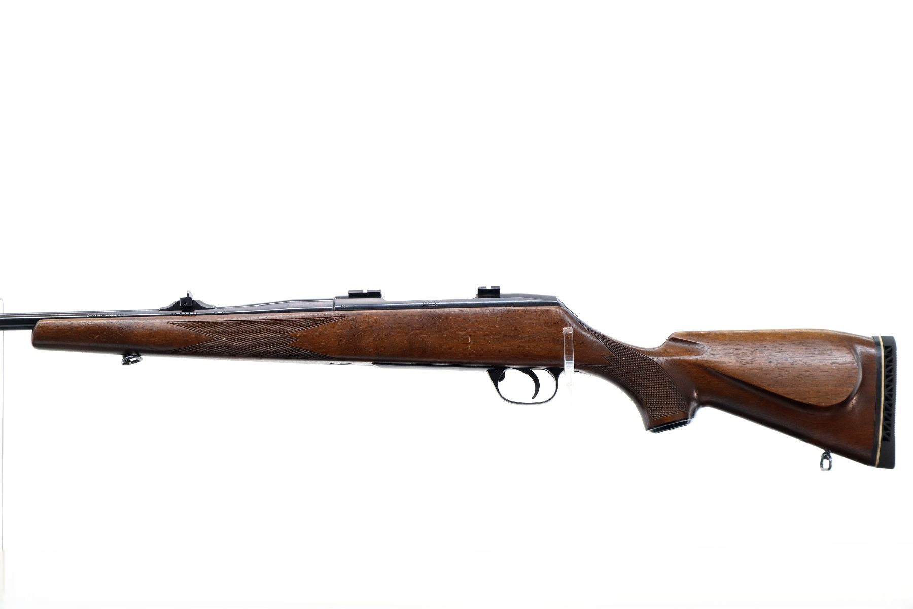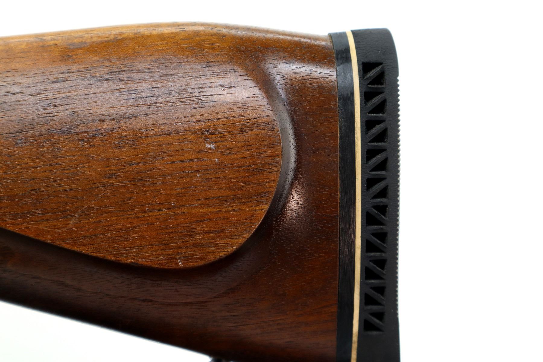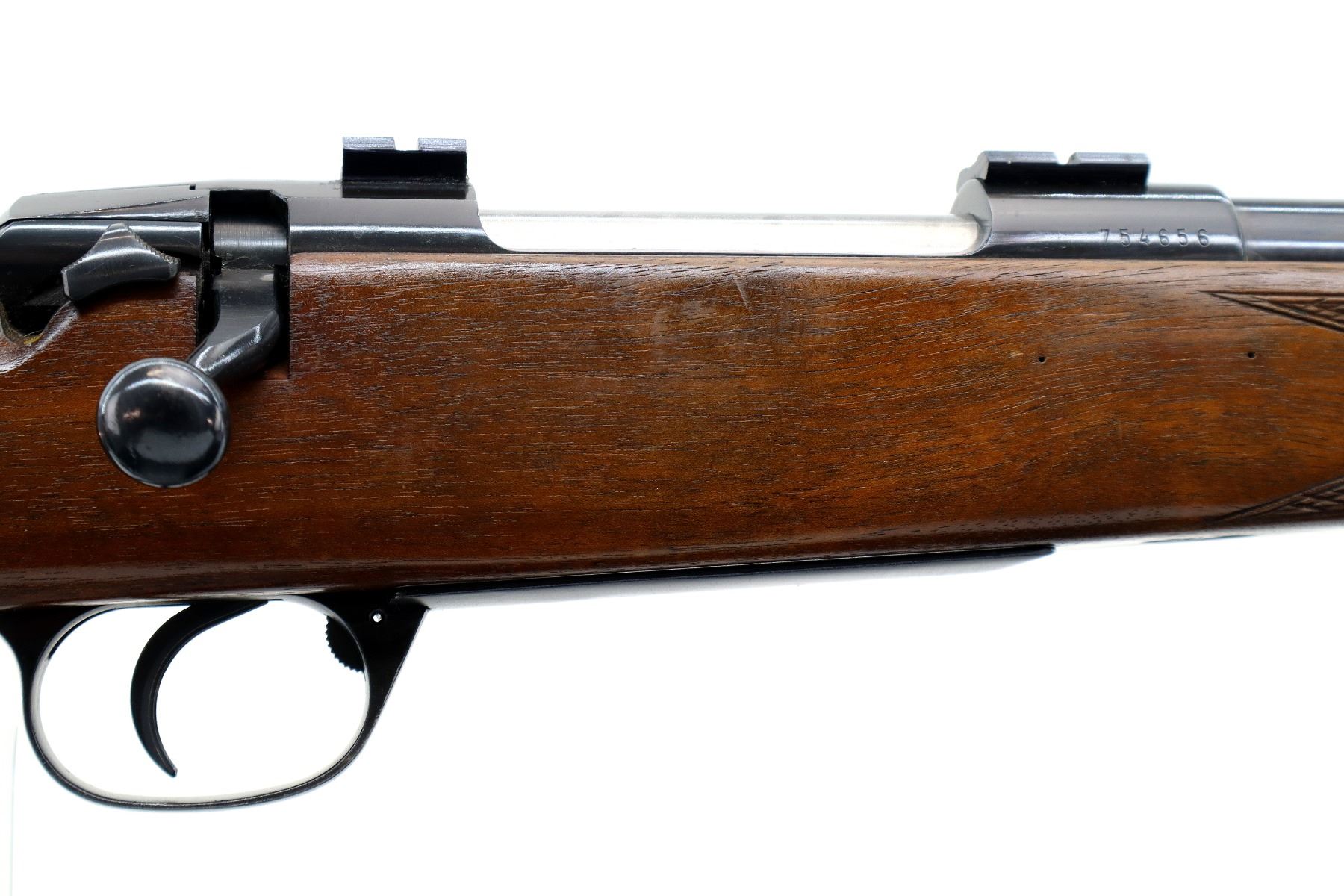 Main Description: Blade front sight with ramp, adjustable u notched rear sight with ramp, blued finish, receiver drilled and tapped with two piece scope bases installed, smooth bolt knob. One piece wood stock, checkered forearm and pistol grip with right hand palm swell, cheek rest, black vented rubber recoil pad, LOP 13", grip cap, trigger guard is hinged to alloy installation or removal of magazine, sling swivels.