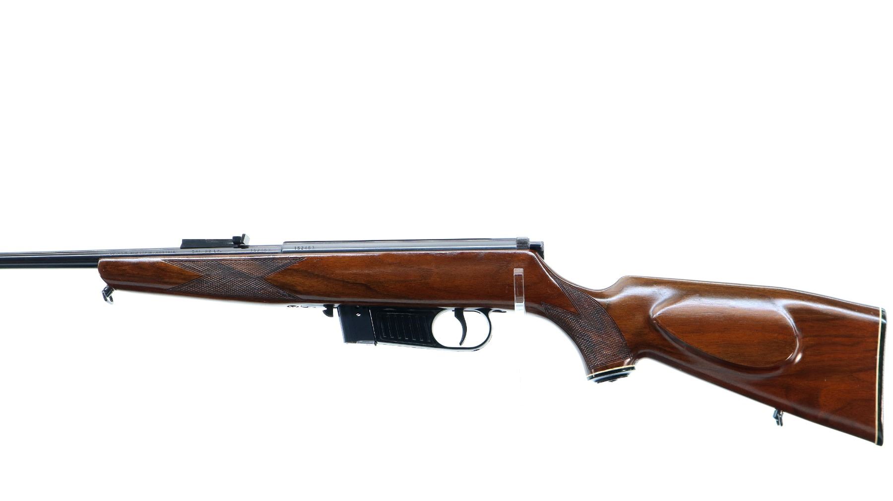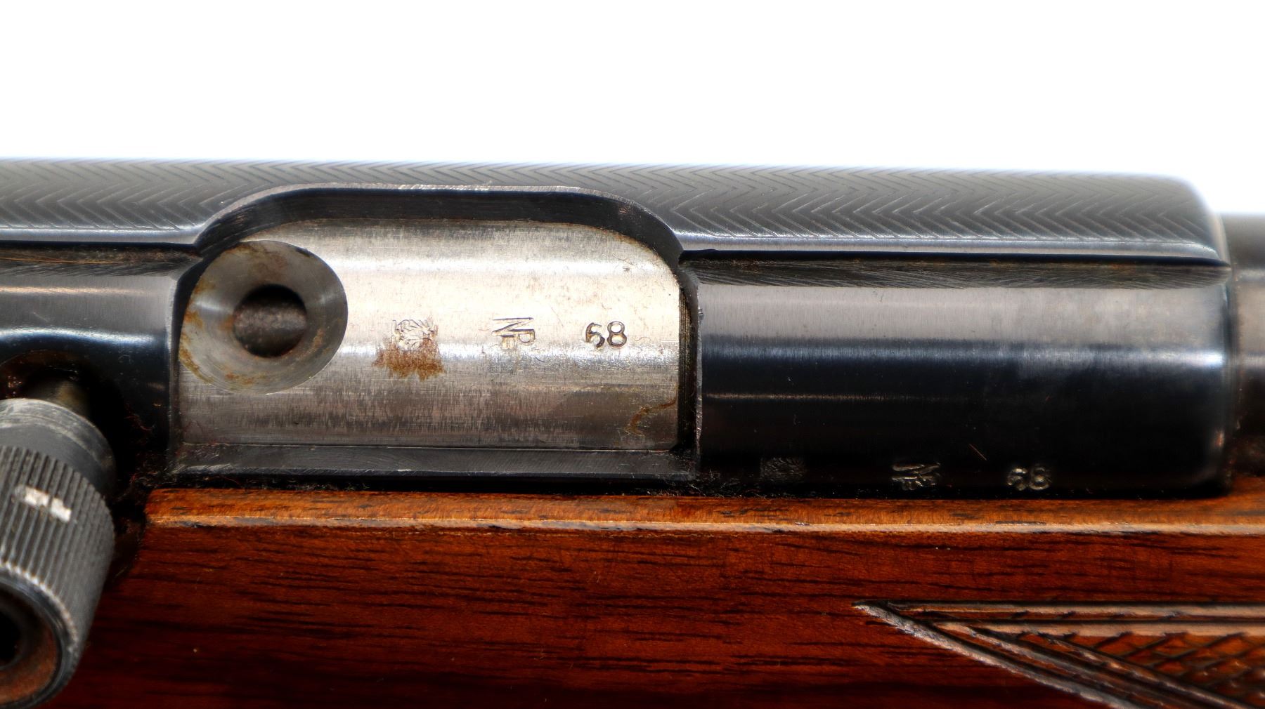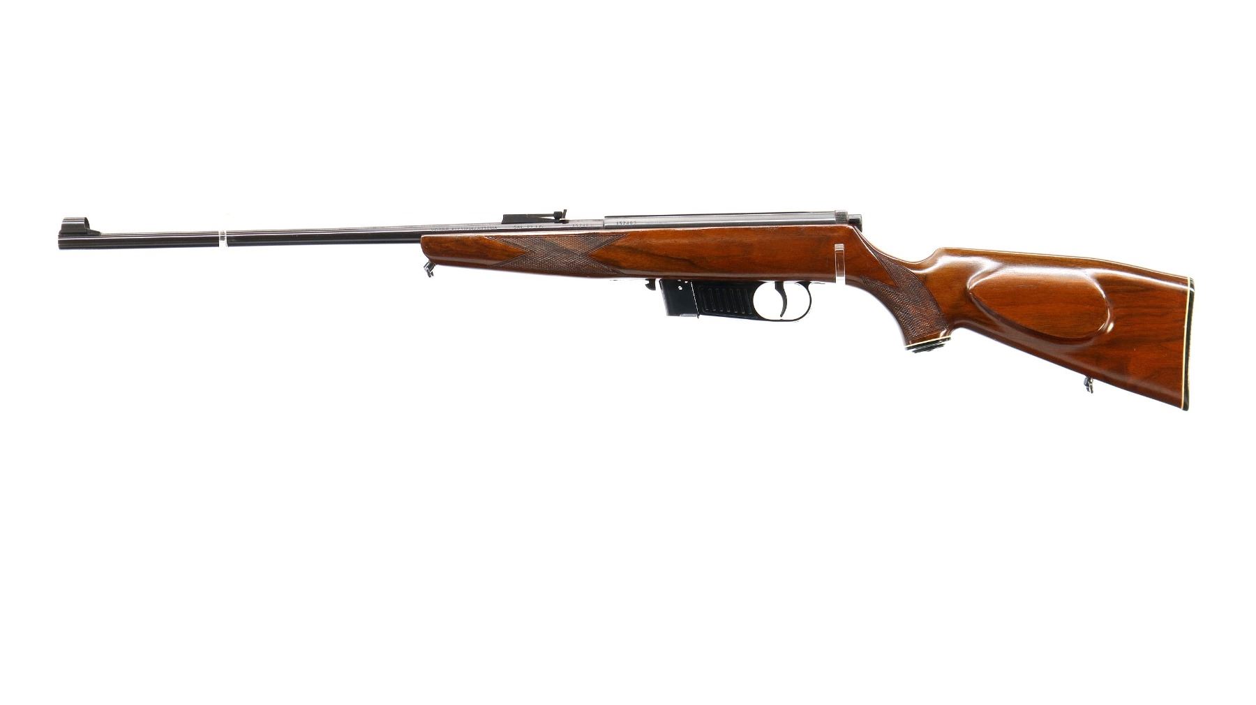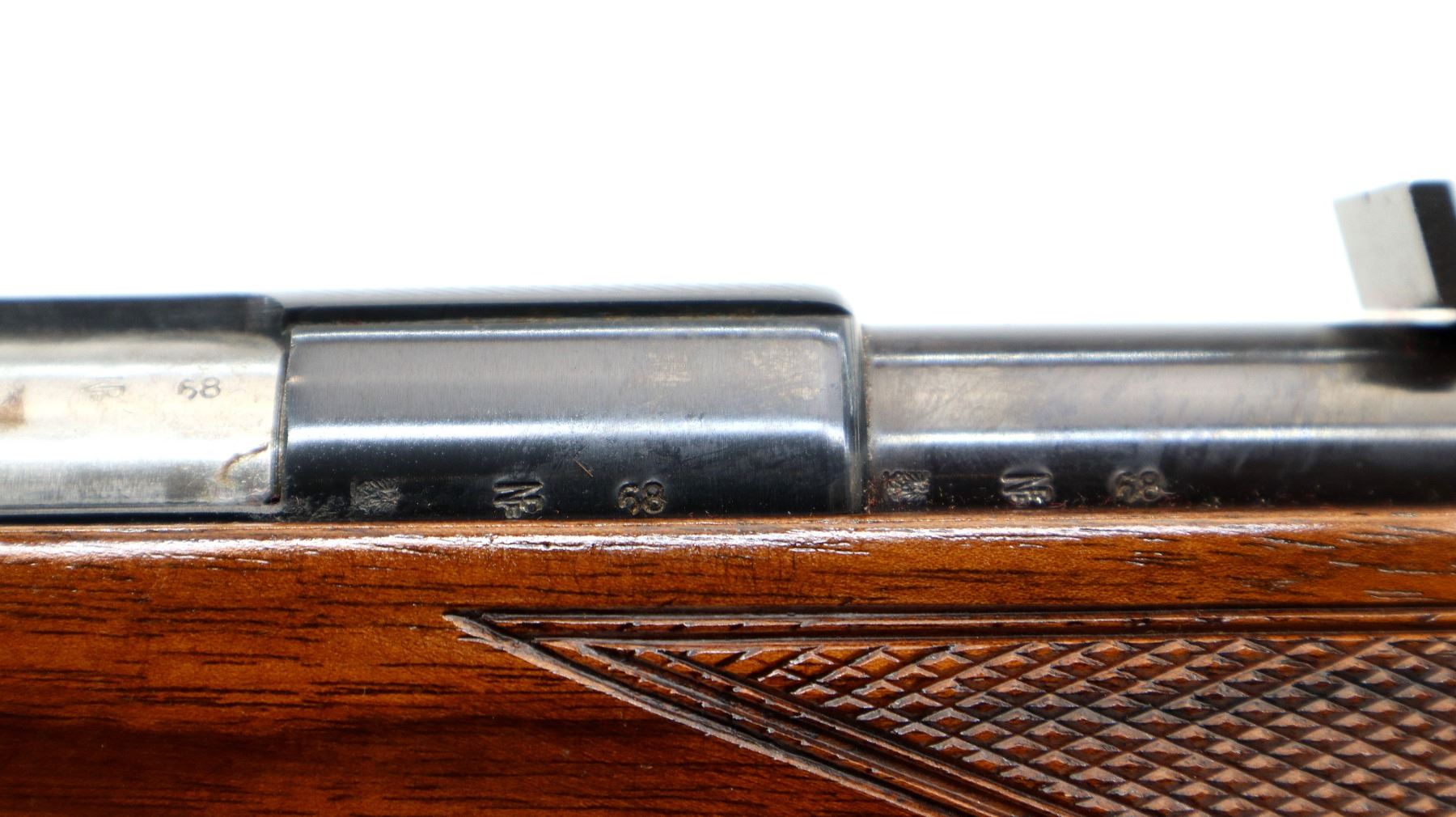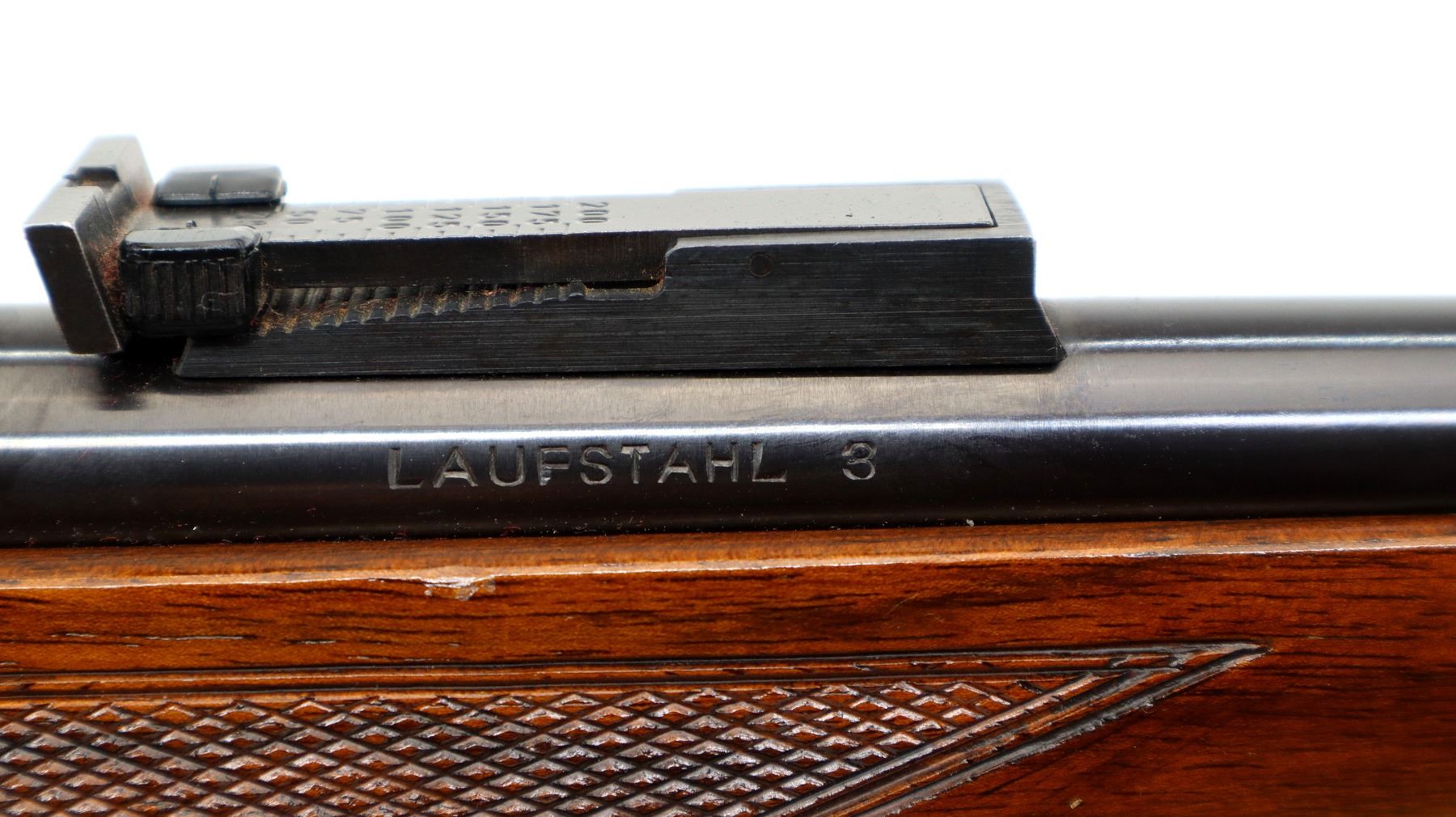 Main Description: Blade front sight with hood and ramp, adjustable u notched rear sight, blued finish, grooved receiver, note: bolt and safety do not move, appear to be old oil which has seized the parts cannot check bore requires cleaning or repair. One piece wood stock, checkered forearm, pistol grip and black polymer butt plate, European cheek rest, grip cap, sling swivels.
