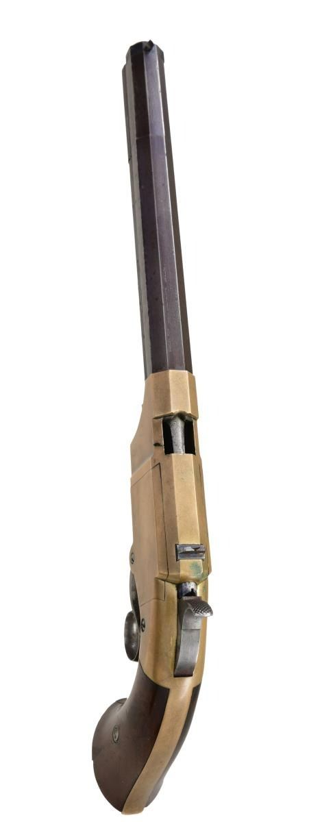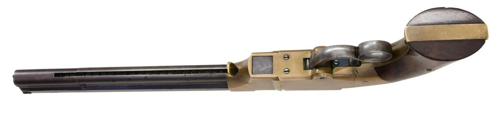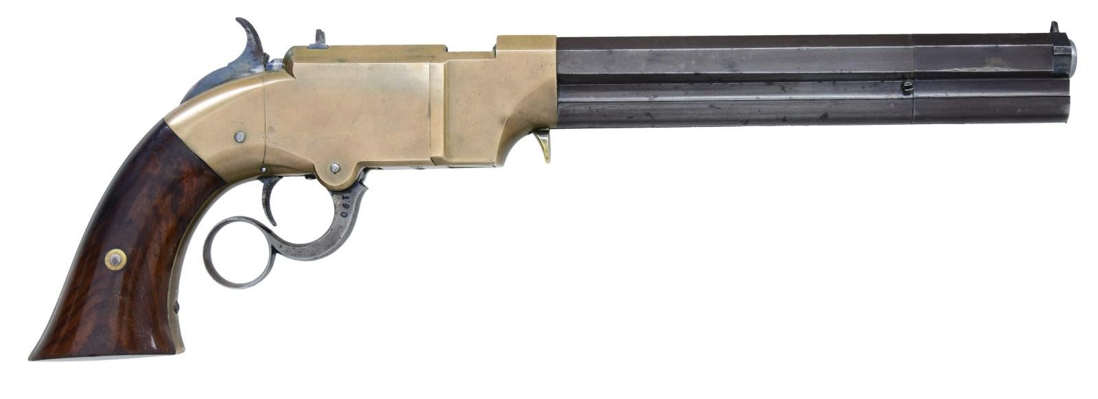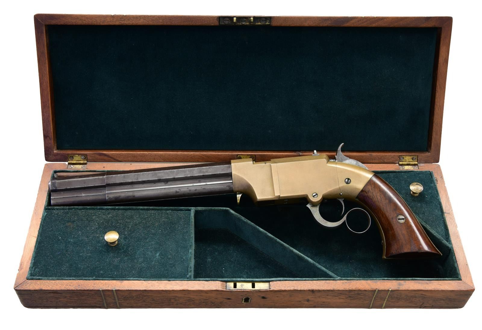 ACTION PISTOL. Caliber: 41. Serial Number: 190. In July, 1855, the company name was changed to Volcanic Repeating Arms from Smith & Wesson. Barrel: 8" octagon. Top barrel flat is marked "THE VOLCANIC / REPEATING ARMS CO. / PATENT NEW HAVEN, CONN. FEB. 14, 1854". Magazine loads by sliding brass follower forward and rotating the barrel shroud. Lever operated brass action. Blade front sight with fixed U notch rear sight. 2 piece walnut grips. Approximately 1,500 of these pistols were manufactured with 8" barrels, 1855-57. UNATTACHED ACCESSORIES: wood presentation box. Lid has brass oval plate with straight line brass inlay highlights. Green velour fitted interior. Casing is in good condition showing handling marks on exterior. CONDITION: barrel and magazine tube have dull blue in protected areas fading to brown showing scattered spots of corrosion. Brass frame shows a very light patina. Original grip finish shows wear spot with scattered scratches and marks. Bore retains strong rifling. (01-25251/DS). ANTIQUE. $12,000-18,000.