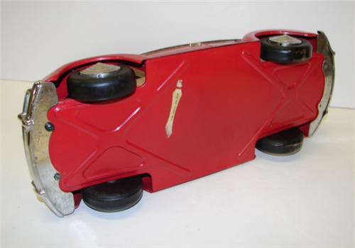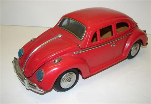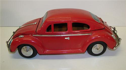 VOLKSWAGEN BEETLE TOY CAR. Red painted. Top and trunk lid are unattached. 14.75” L