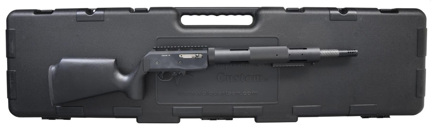 WITH SHIPPING BOX & FACTORY HARD CASE. Cal. 17 HMR / 22 WMR. S# TD00811. Bbl. 17". Fusion semi-automatic takedown rifle mfg. by Volquartzen. Left side of the receiver is marked with the S#, followed by the Volquartzen "VC" logo and "Volquartzen FUSION". Matte black anodized aluminum receiver and checkered handguard. Black composite pistol grip buttstock. Carbon fiber wrapped quick change bbl. with threaded radial muzzle brake. MAGS: 1 10-rd. UNATTACHED ACCESSORIES: shipping box and factory hard case containing a 22 WMR bbl. CONDITION: near new, with metal components retaining virtually all of their original factory finishes overall. Mirror bore, exhibiting well defined rifling throughout. Composite buttstock is excellent. Shipping box shows exterior wear, but remains sturdy and serviceable. PROVENANCE: The Collection of Gun Sport Ltd owned by Jon R. Thomas. (23-3800/MLW). MODERN. $1,000-1,500.