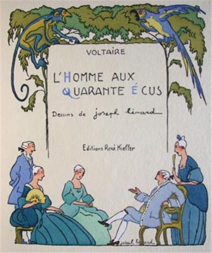VOLTAIRE.- L' Homme aux quarante écus. [Dessins de Joseph Hémard]. Paris, René Kieffer, 1925. In-8°. Reliure d'édition d'après une maquette [de René Kieffer] : plein maroquin noir, plats ornés d'une plaque gaufrée à froid (silhouettes de 2 femmes nues sur fond boisé), dos orné en long à froid, tête dorée, couv. et dos cons. (très léger frott. sur le bas et haut du dos).
