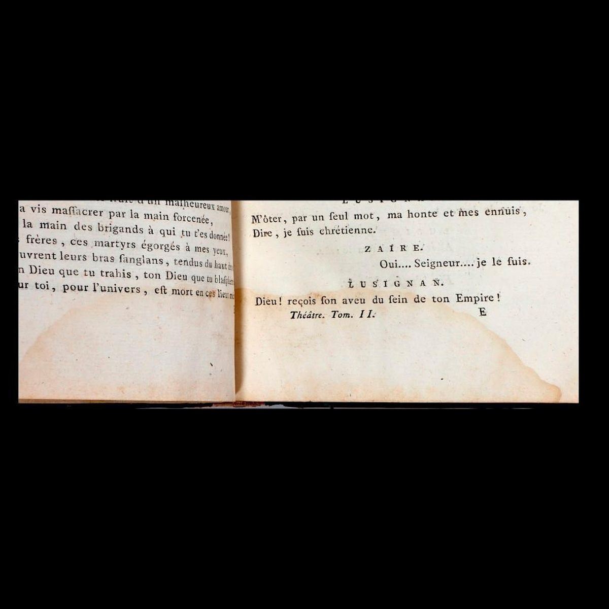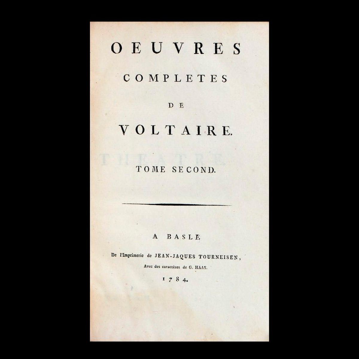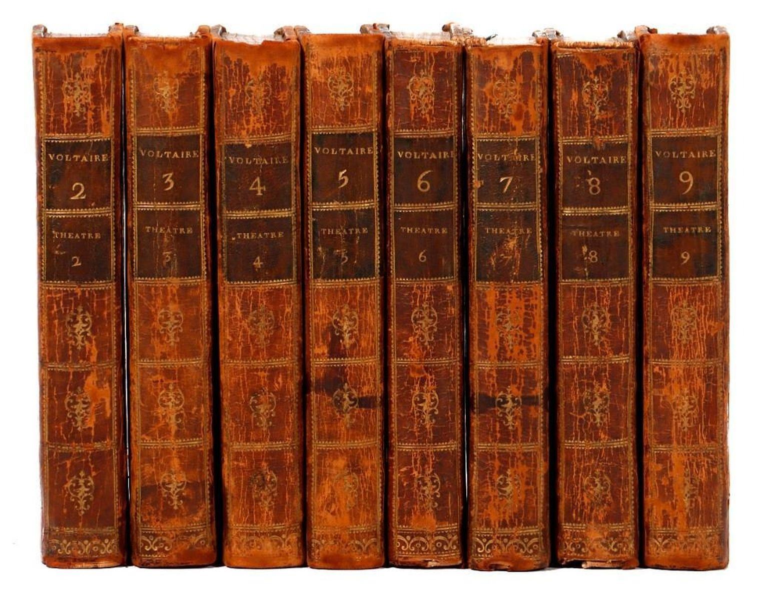 Oeuvres Completes de Voltaire. Basle: De l'Imprimerie de Jean-Jaques Tourneisen, Avec des caracteres de G. Haas, 1784. 8vo. Full speckled calf, gilt-blocked covers, gilt spine with brown leather labels, marbled endpapers, Eight volumes (Vols. 2-9), from a large set of 70(?). Condition: Fair-Good; all with surface cracking/wear to spines; scuffing, staining, edge and corner wear, toning/soiling, some spotting; Vol. 2 has a significant dampstain extending from title page throughout, and Vols. 3, 8, 9 to a lesser degree extending from about midway throughout.