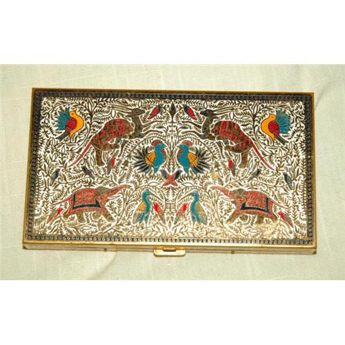 VOLUPTÉ USA. Large compact of brass and enamel similar to that of cloisonnes. It has several compartments and a shiny metal divider that serves as a mirror. It comes in a black cloth case. It measure 3” x 5 ¼ and is 9/16th deep.</P> <P>The design is incredible. With all shorts of Asian Animals. The top and the bottom are equal. </P> <P>The condition is great. The is a three very small dents on the bottom side. They have not marred the design. The corner of the black cloths case show a slight amount of wear. </P> </P> <P>
