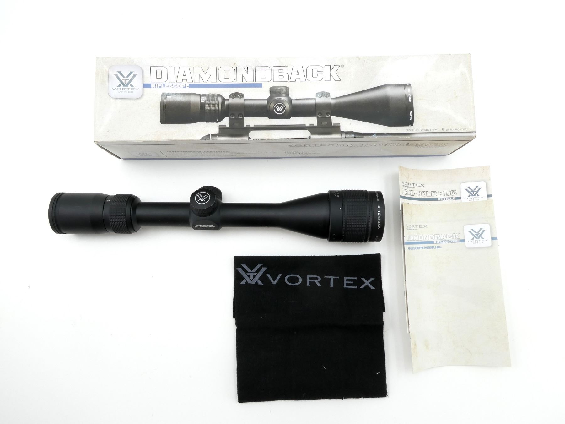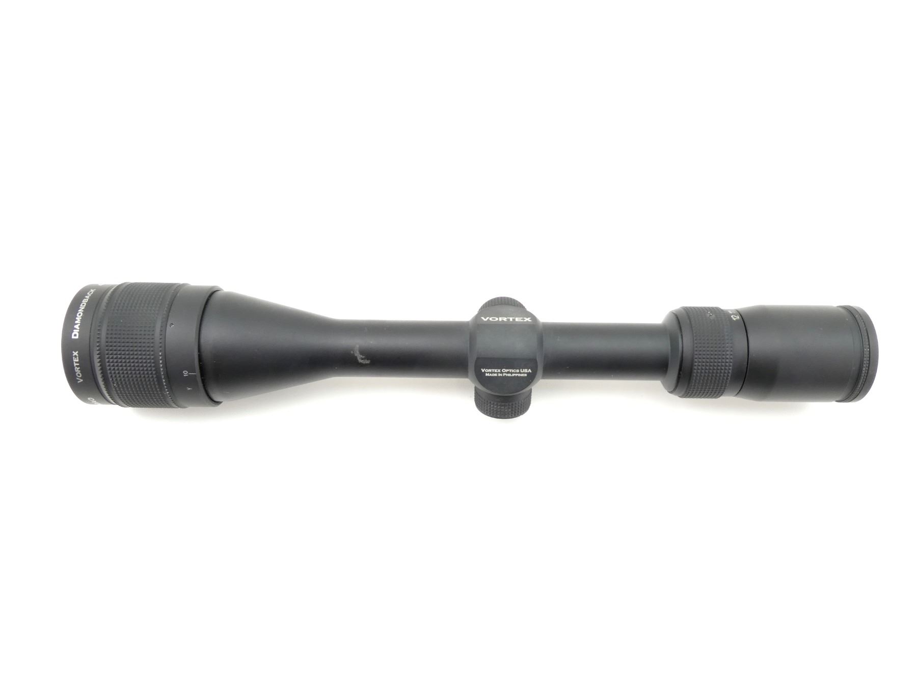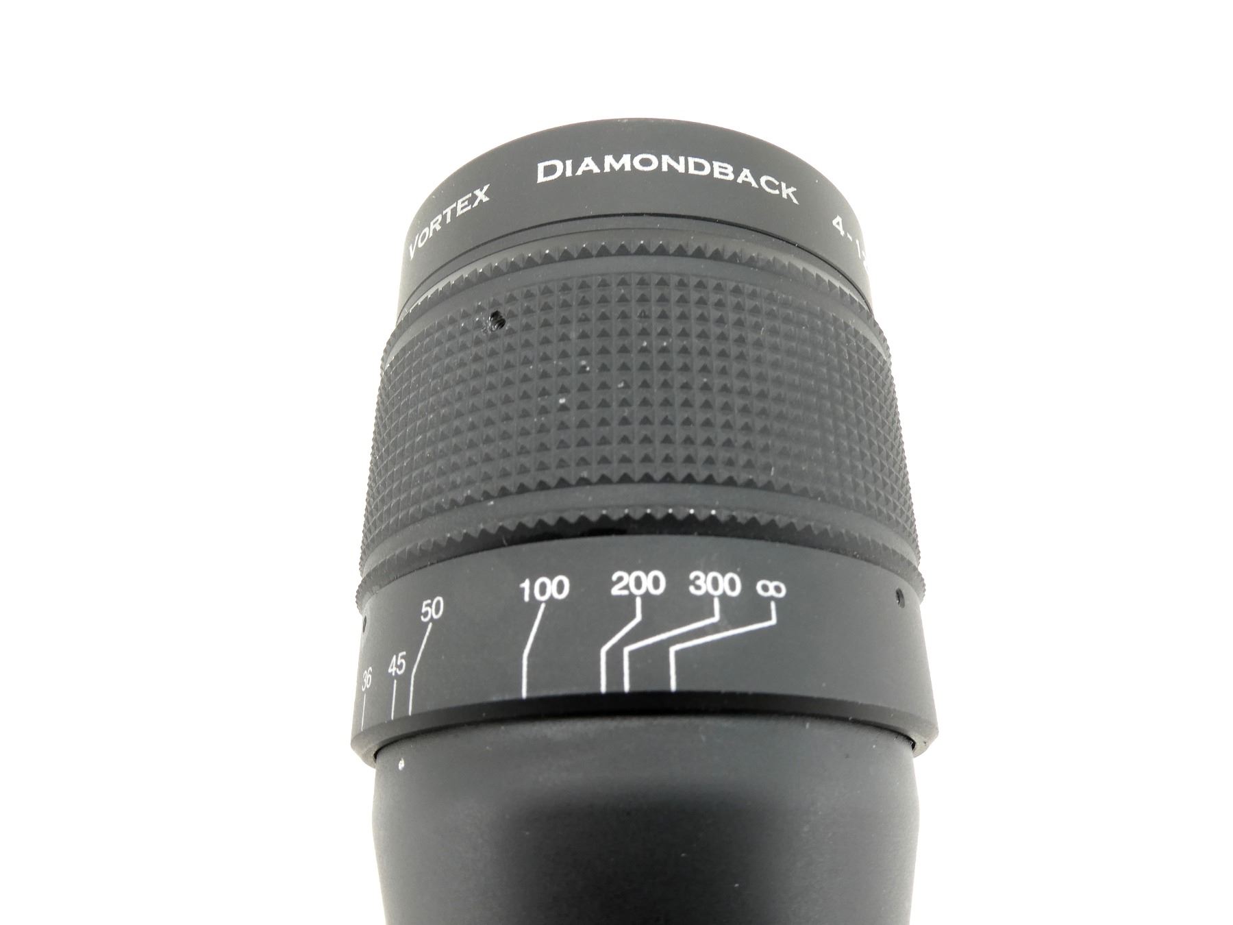 (1) CLEAR OPTICS, DEAD-HOLD BDC RETICLE, 1" TUBE DIAMETER, WORKING MAGNIFICATION RING, WINDAGE & ELEVATION KNOBS TURN, MARKED "VORTEX DIAMONDBACK 4-12X40AO", ETC., WITH INSTRUCTIONS IN ORIGINAL PACKAGING, SHOWS WEAR & TEAR / USE MARKINGS. MAY REQUIRE FITTING. SEE PHOTOS.