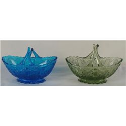 Here are two Fenton baskets in the Daisy Button pattern, one Green and the other Colonial Blue. These are sometimes known as English oval baskets, an