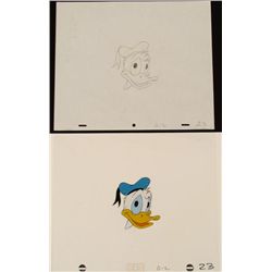 Closed eyed Donald Duck * * * * * Original Animation Cel & DrawingMedium: Hand painted acetate celDetails: Animation notations and peg holes *