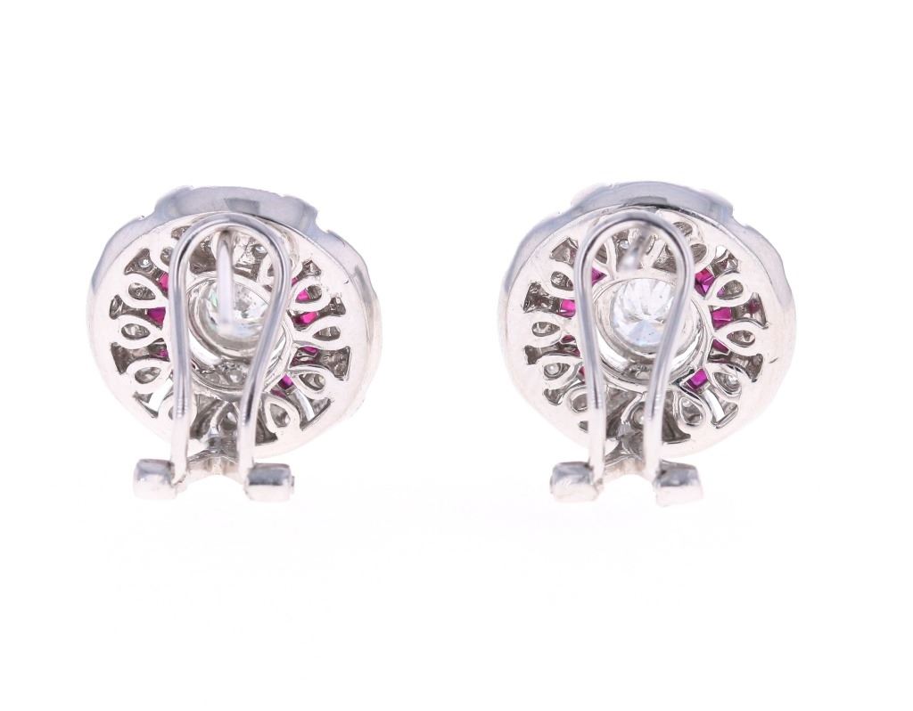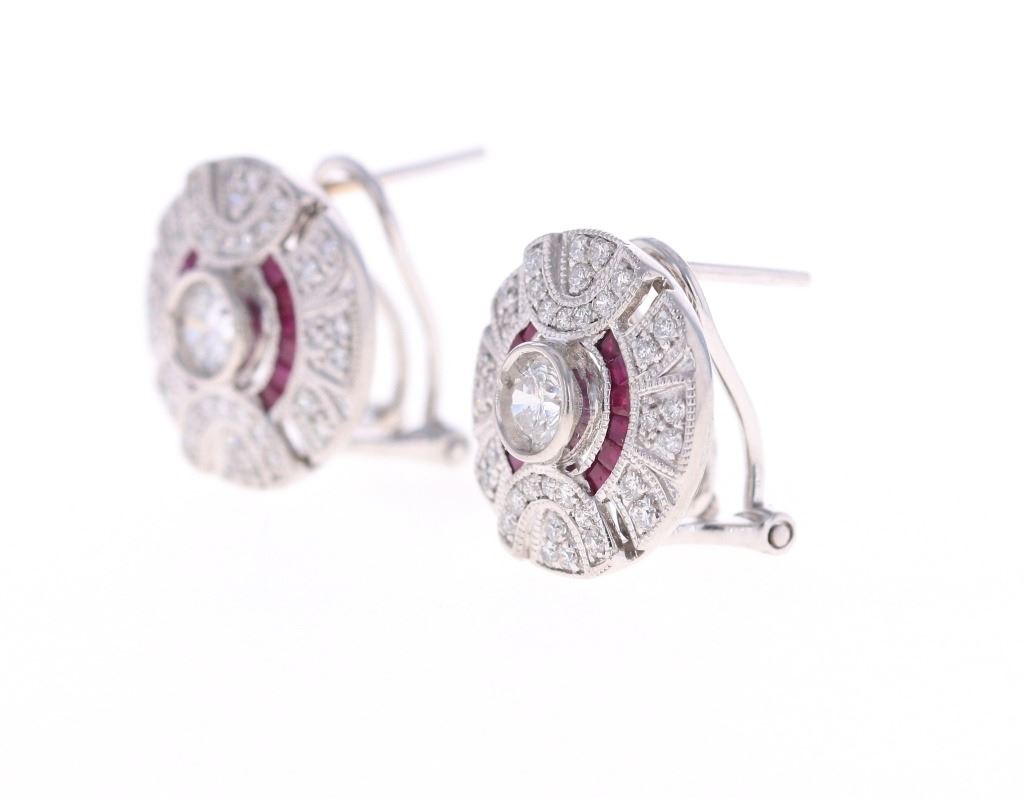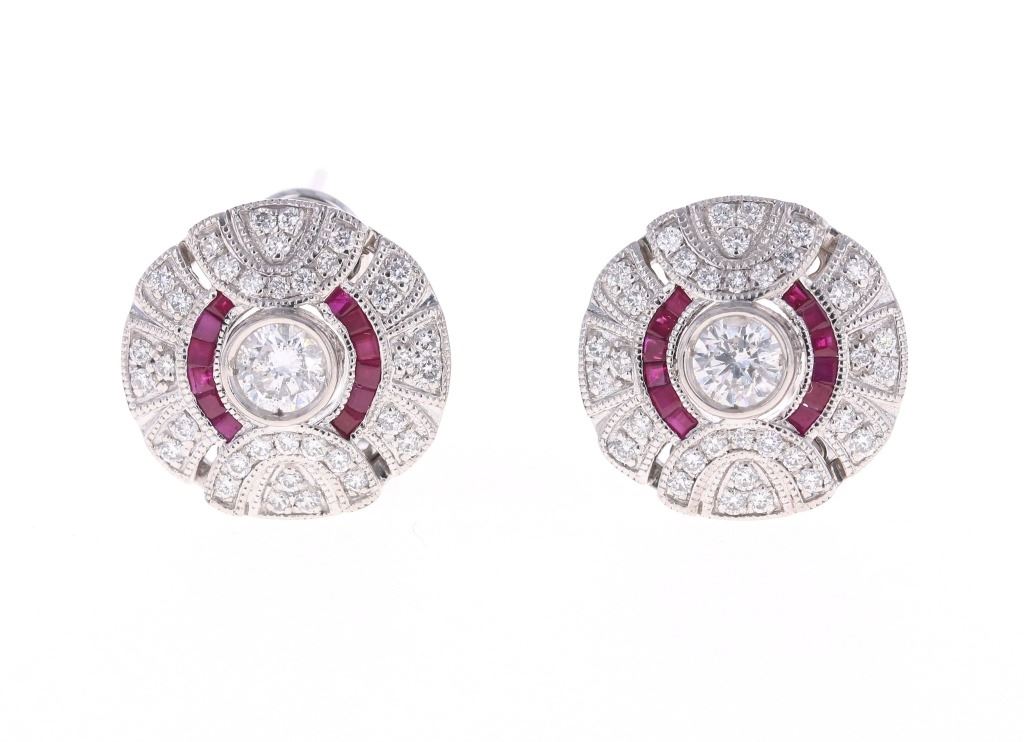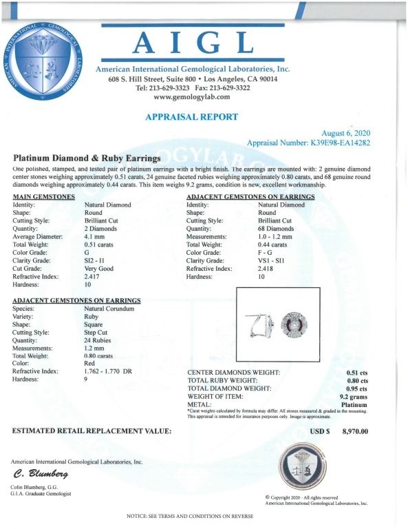 Featured in this lot is this VS1 natural diamond and ruby platinum earrings with AIGL paperwork. The earrings feature one pair of polished, stamped and tested platinum earrings with a bright finish and shows new condition with excellent workmanship and shows a 'orianne' hallmark with a 'PT950' stamp next to the hallmark. The center stones are two natural round brilliant cut diamonds that show an average diameter of 4.1mm and shows a color gradient of G and shows a clarity grade of SI2 - I1 with a very good cut grade. The center stone is decorated with a lengths of a total of 24 natural square step cut rubies with measurements of 1.2mm and a coloration of red while showing a total weight of 0.80 carats. The clover decoration is decorated with a total of 68 natural round brilliant diamonds that measure 1.0 - 1.2mm and a color gradient of F - G and a clarity of VS1 - SI1. The piece comes complete with AIGL Inc.(American International Gemological Laboratories, Inc. a GIA certified lab AIGL#: K39E98-EA14282) report and appraisal confirming the above info and giving a total value of $8,970.00.