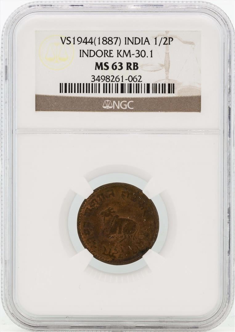 One VS1944 1887 India 1/2 Annas Coin NGC MS63RB. NGC Certified.