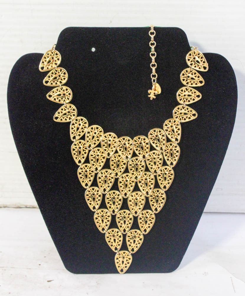 SIGNED ON HOOK CLASP PLUS ON 2 JEWELRY TAGS INCLUDING THE FLEUR DE LIS, BIB PART-4" ACROSS AT MAX & 5" LONG, APPROX 22" LENGTH WHICH INCLUDES A 4-1/2" EXTENDER, DISPLAY INCLUDED