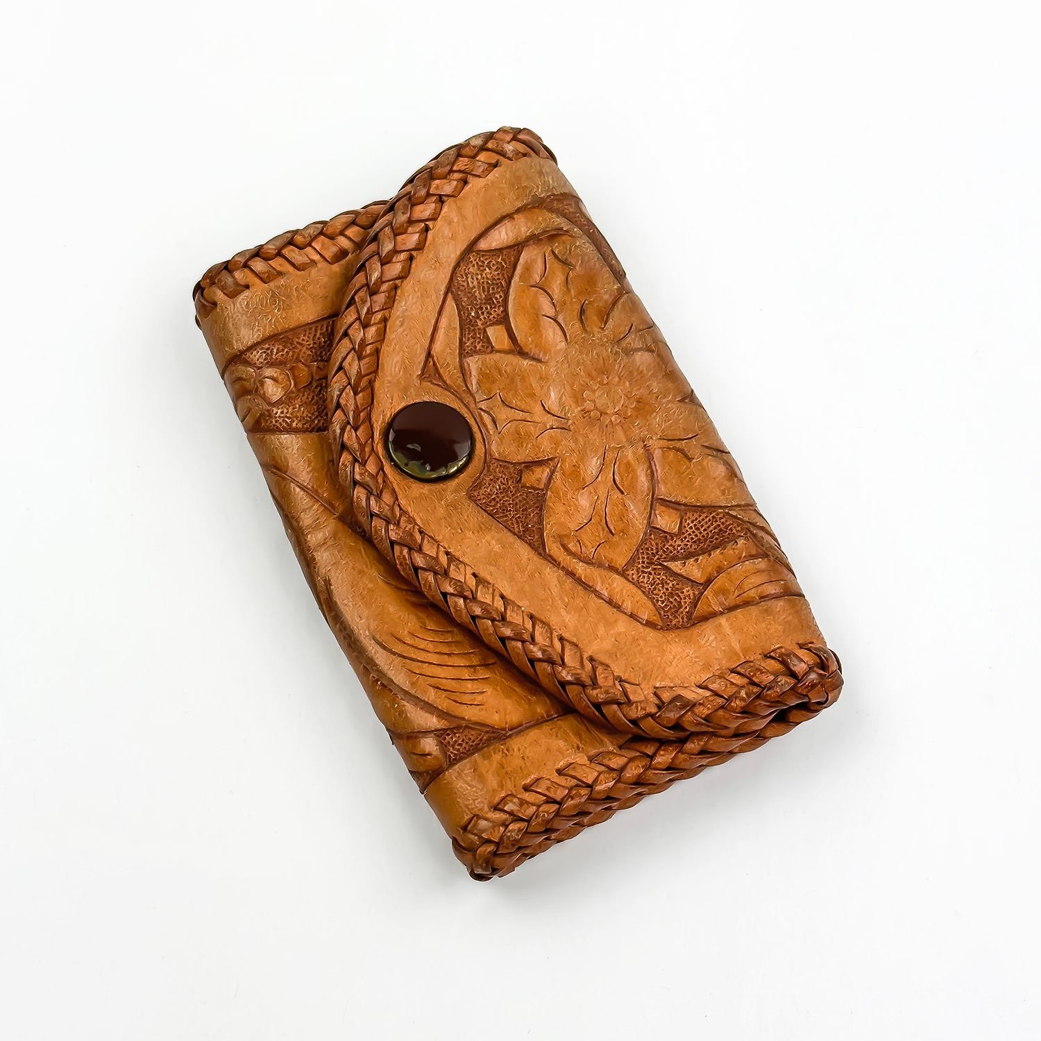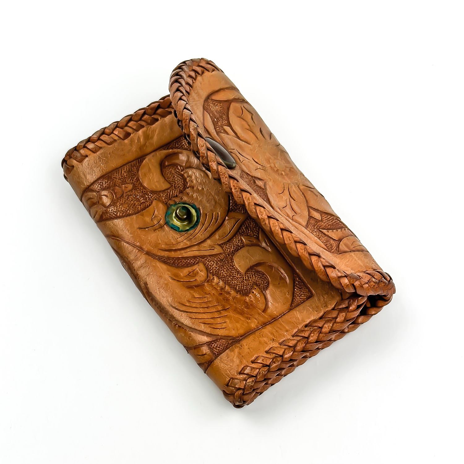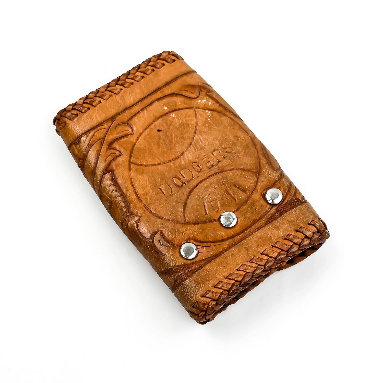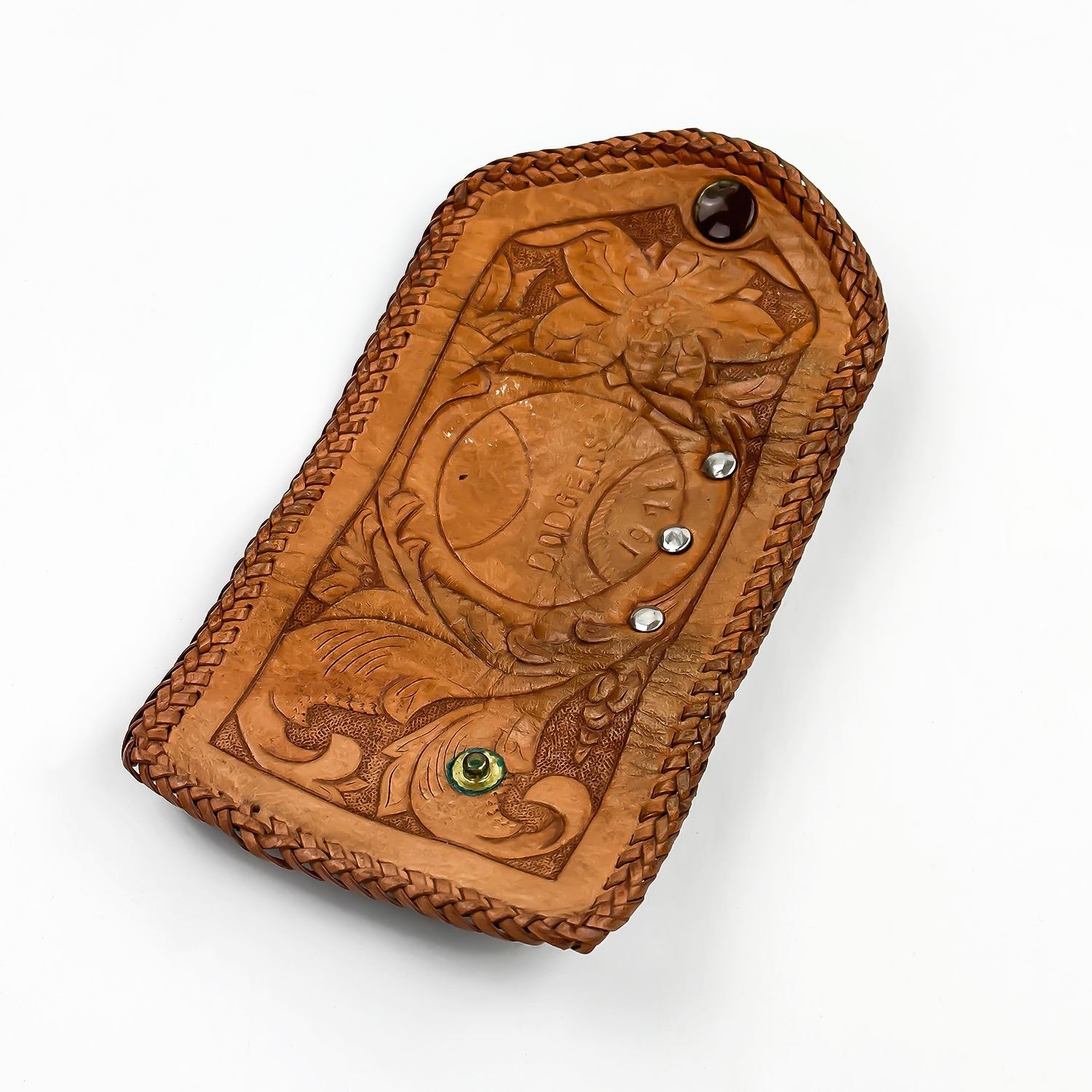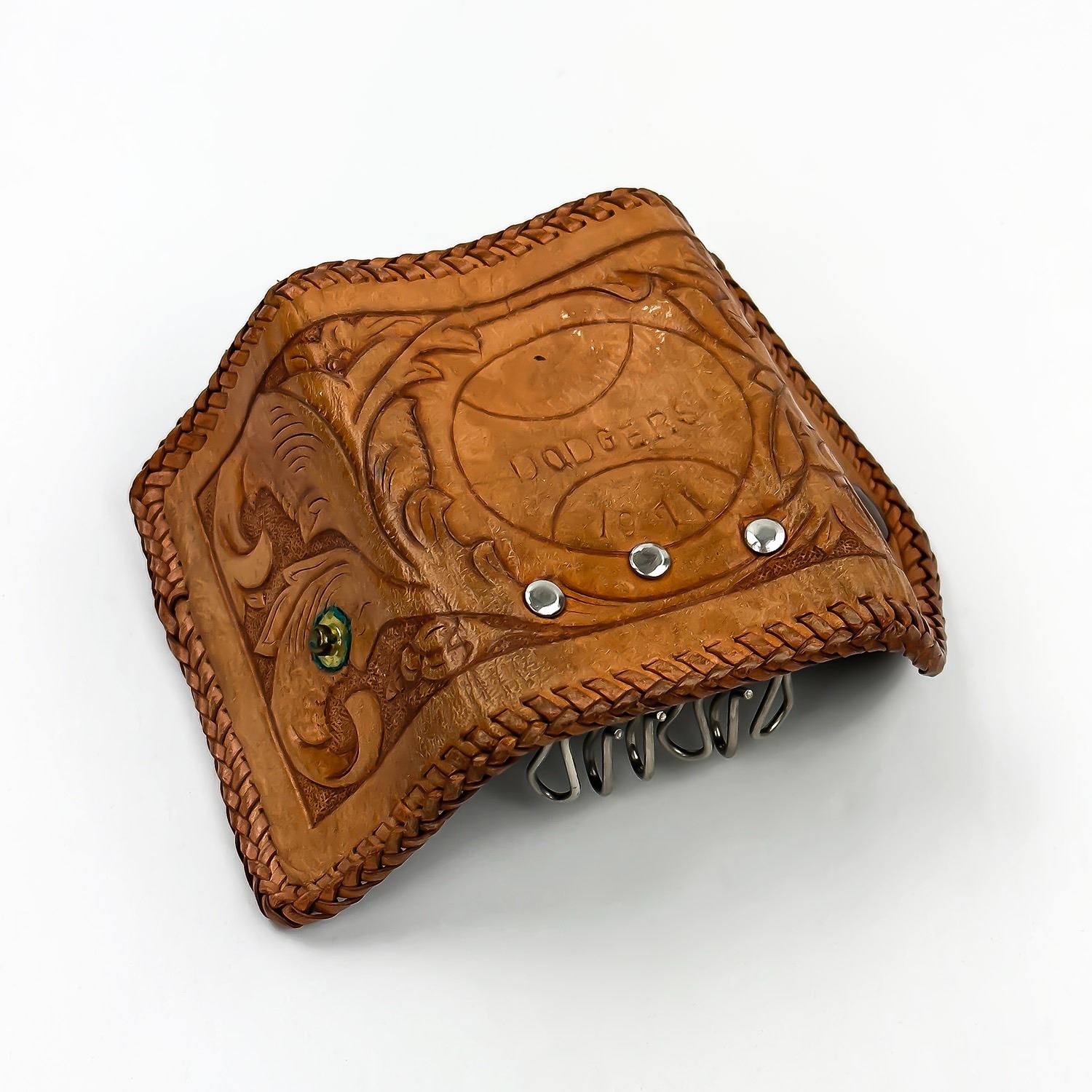 #8306 - VINTAGE HAND CRAFTED TOOLED LEATHER KEY HOLDER - FLORAL THEME WITH BASEBALL AND DODGERS 1971 TOOLED INTO THE LEATHER. WHEN SNAPPED CLOSED IT MEASURES: 3.5” (9 CM) LONG BY 2.25” (6 CM) WIDE***ITEM(S) LOCATED IN LETHBRIDGE ALBERTA. FREE TRANSPORT TO EDMONTON OFFICE AVAILABLE FOR THIS AUCTION. WORLDWIDE SHIPPING IS AVAILABLE FOR ALL ITEMS