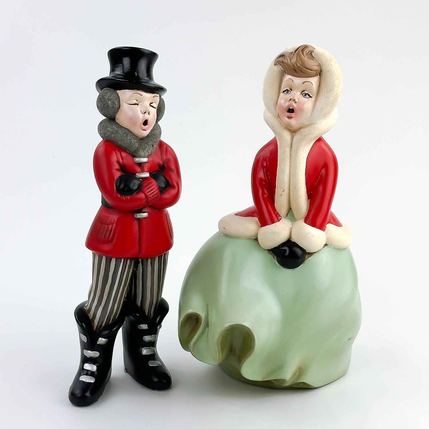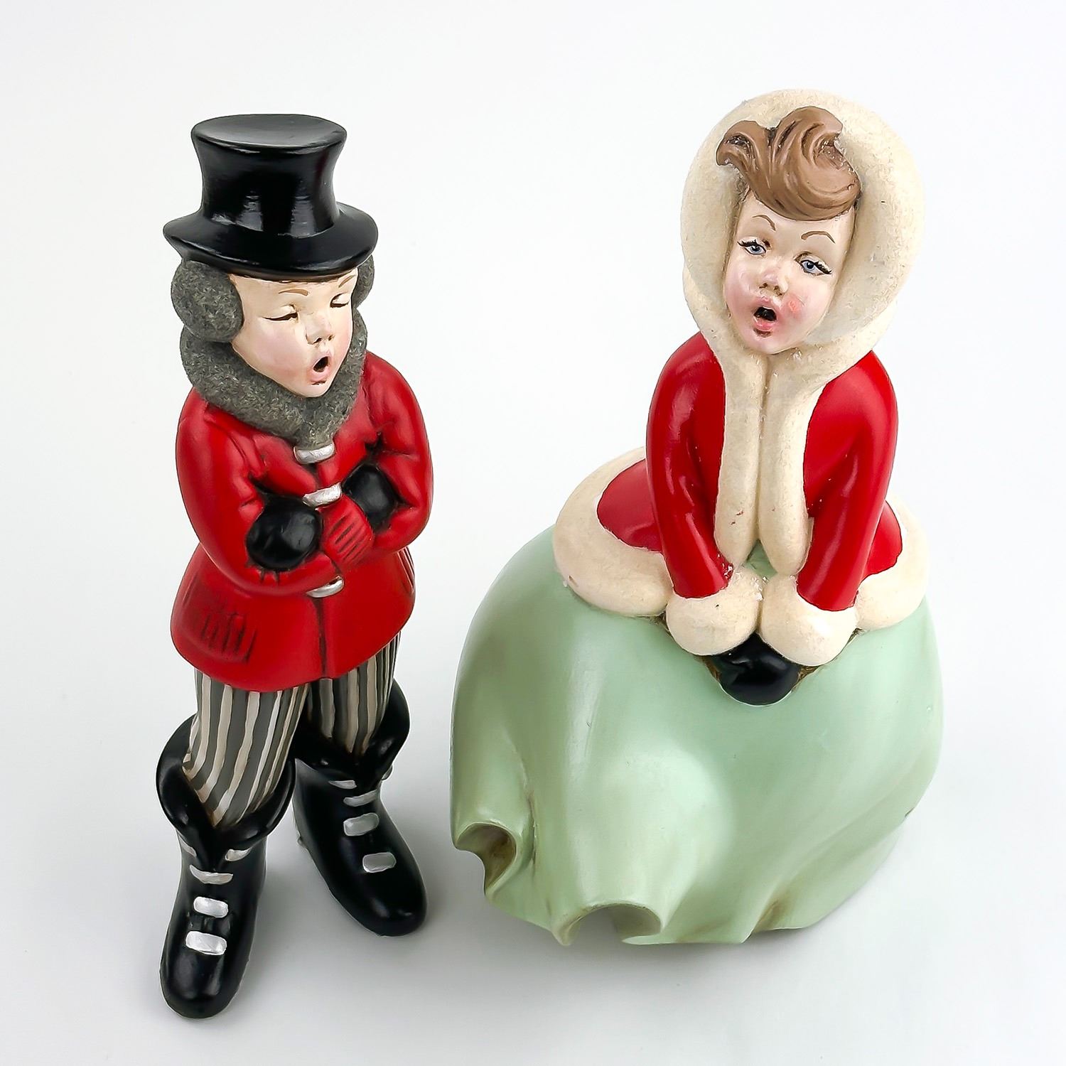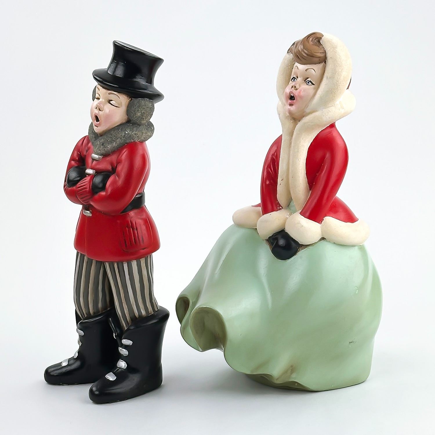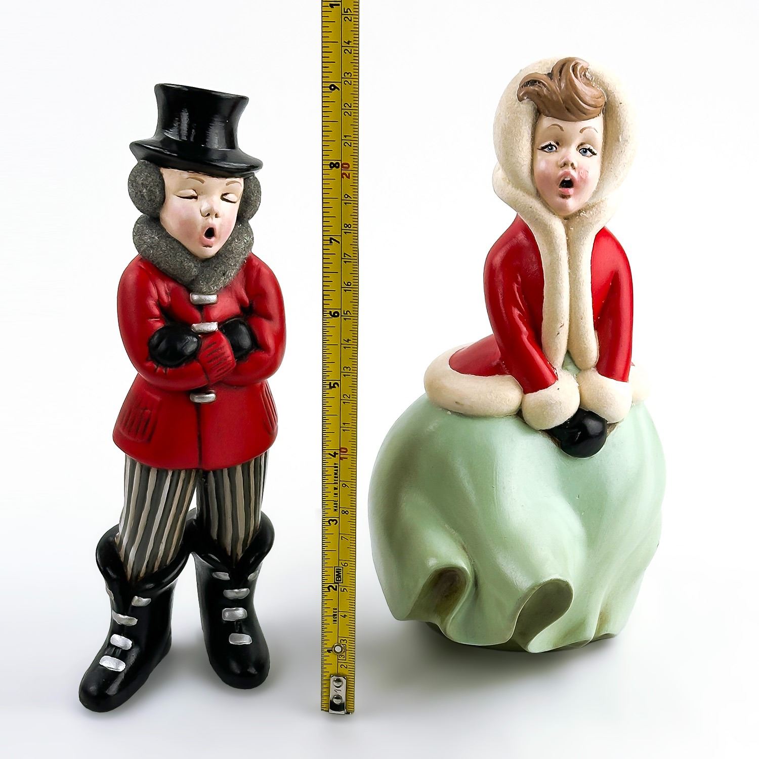 #8360 - VINTAGE HAND CRAFTED AND PAINTED CERAMIC FIGURINES. ATLANTIC MOLD BOY AND GIRL SINGING CHRISTMAS CAROLERS - CHRISTMAS CAROLS. THEY BOTH MEASURE 9” (23 CM) TALL - GIRLS DRESS IS 4.5” (11.5 CM) WIDE FROM THE FRONT