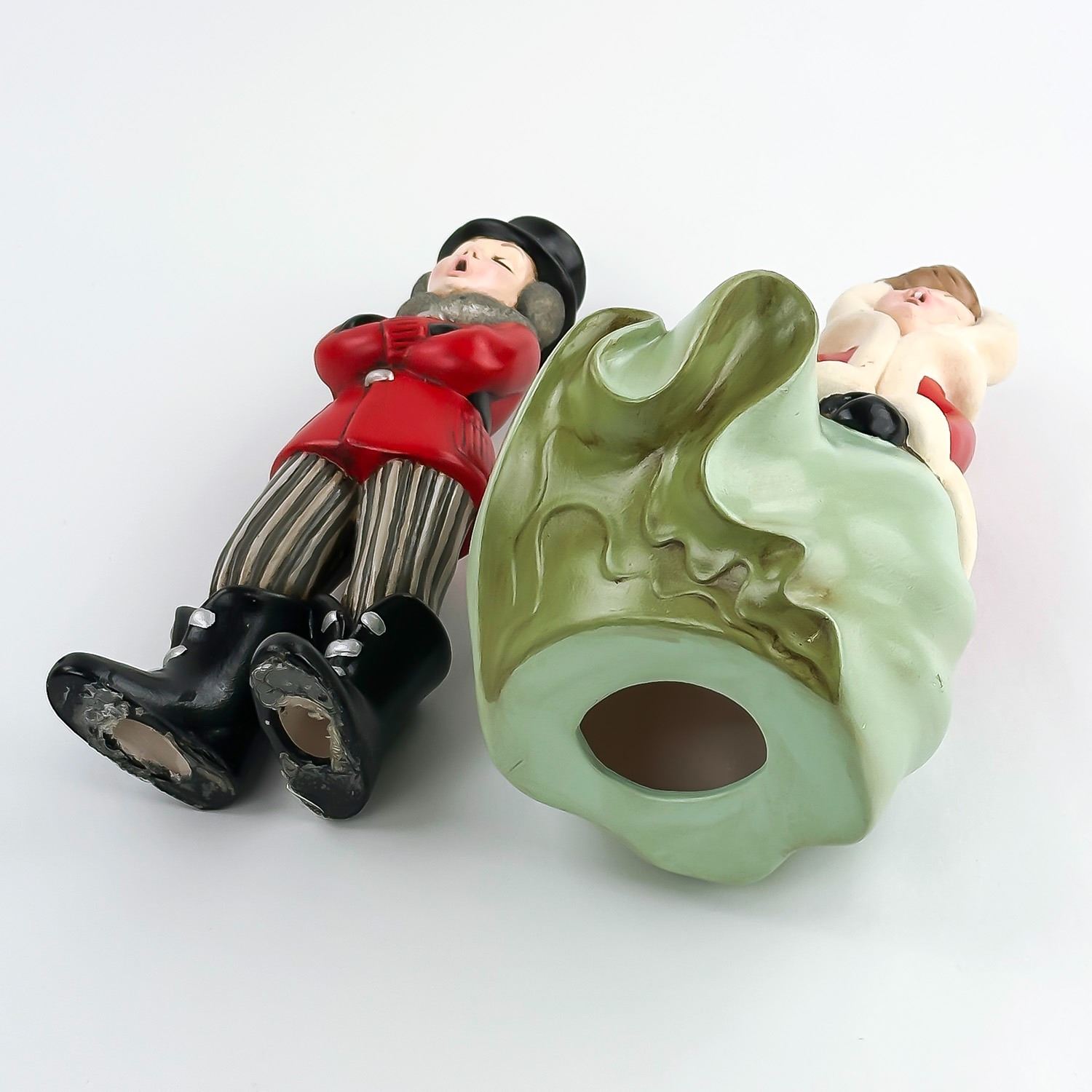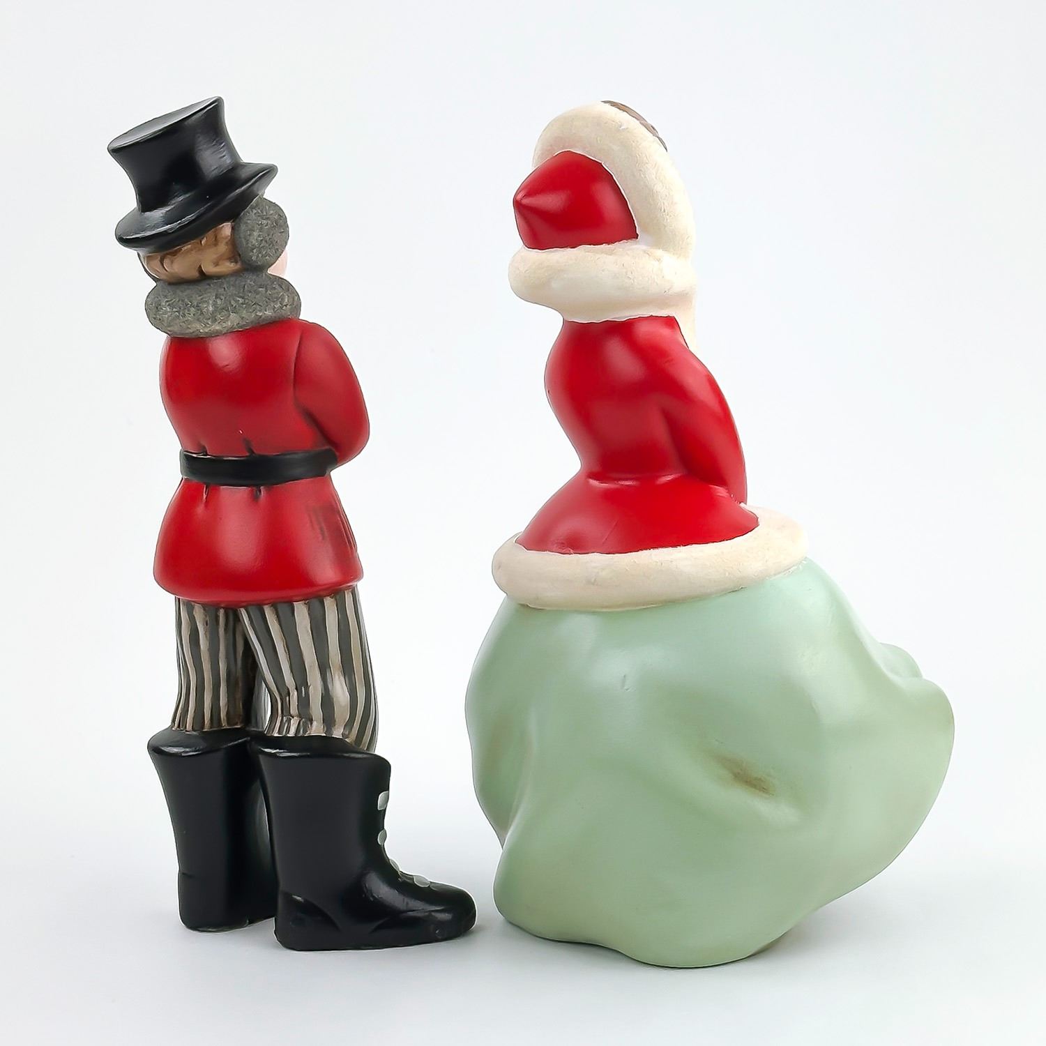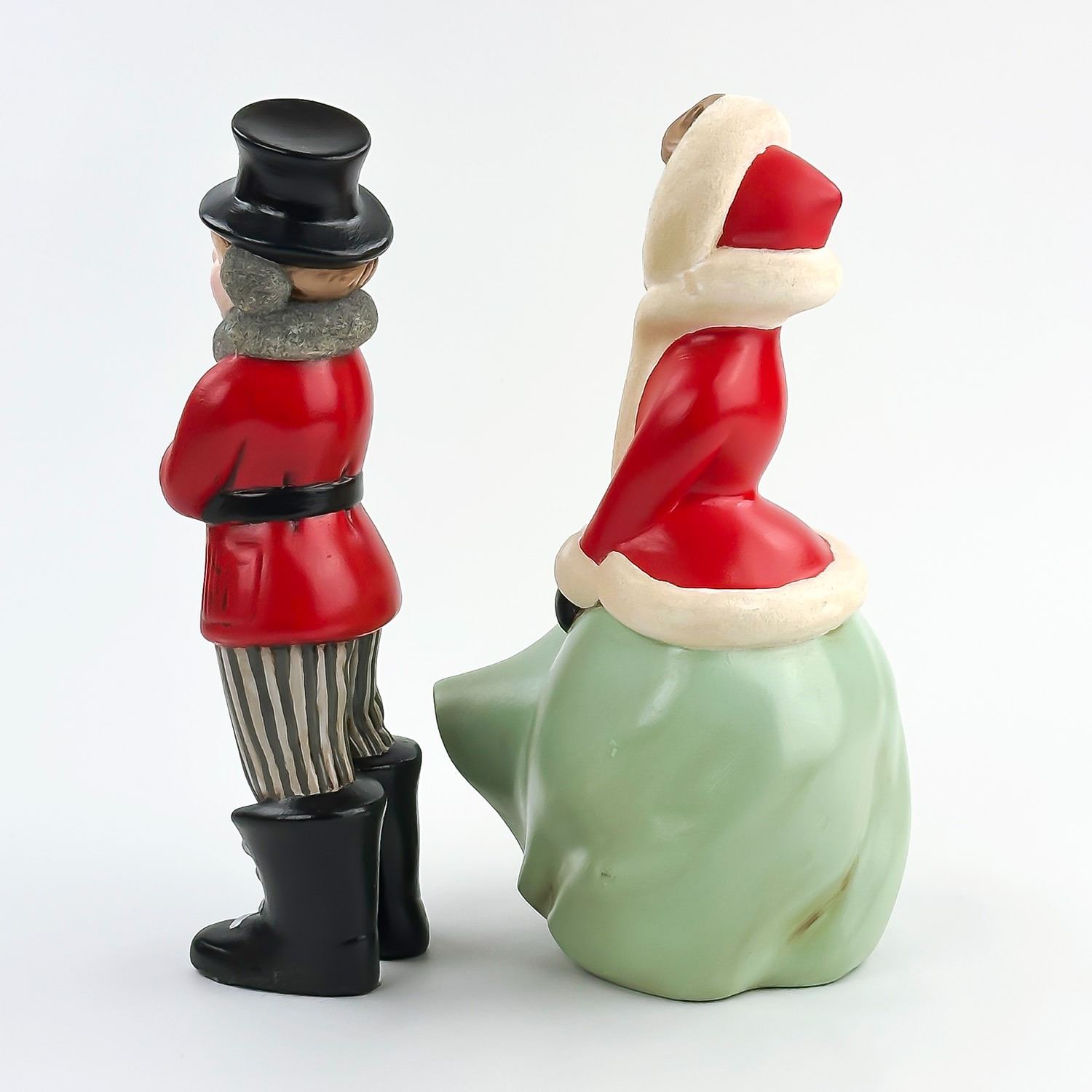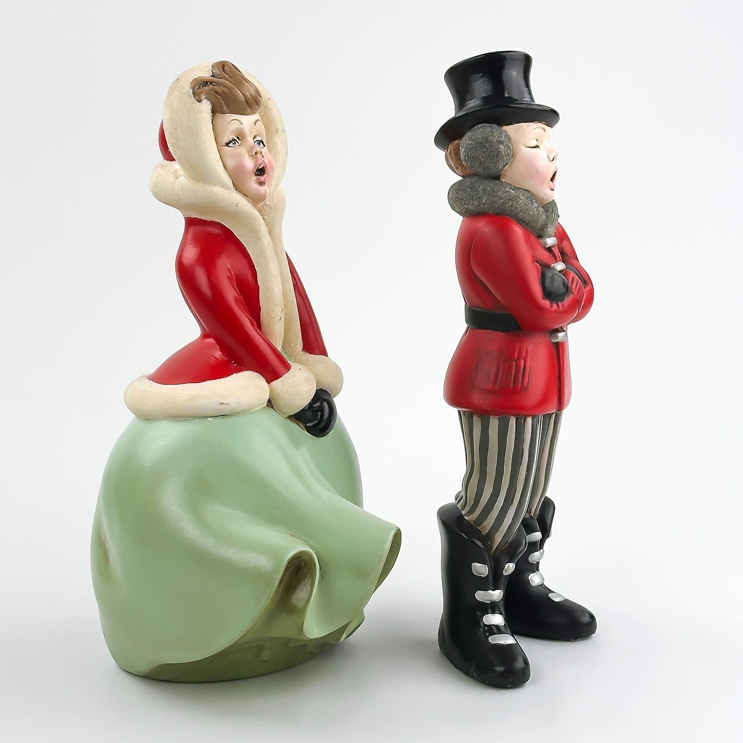 #8360 - VINTAGE HAND CRAFTED AND PAINTED CERAMIC FIGURINES. ATLANTIC MOLD BOY AND GIRL SINGING CHRISTMAS CAROLERS - CHRISTMAS CAROLS. THEY BOTH MEASURE 9” (23 CM) TALL - GIRLS DRESS IS 4.5” (11.5 CM) WIDE FROM THE FRONT