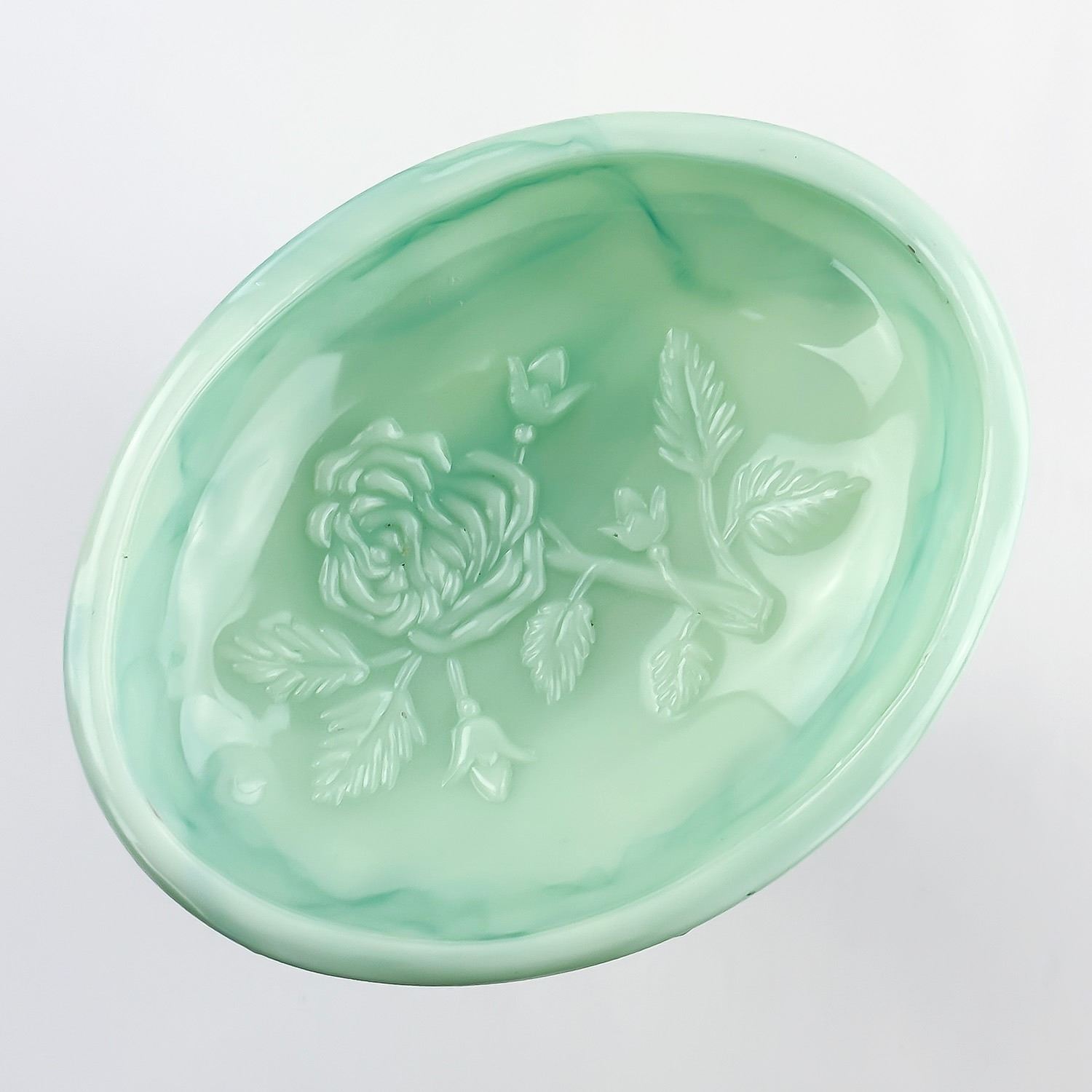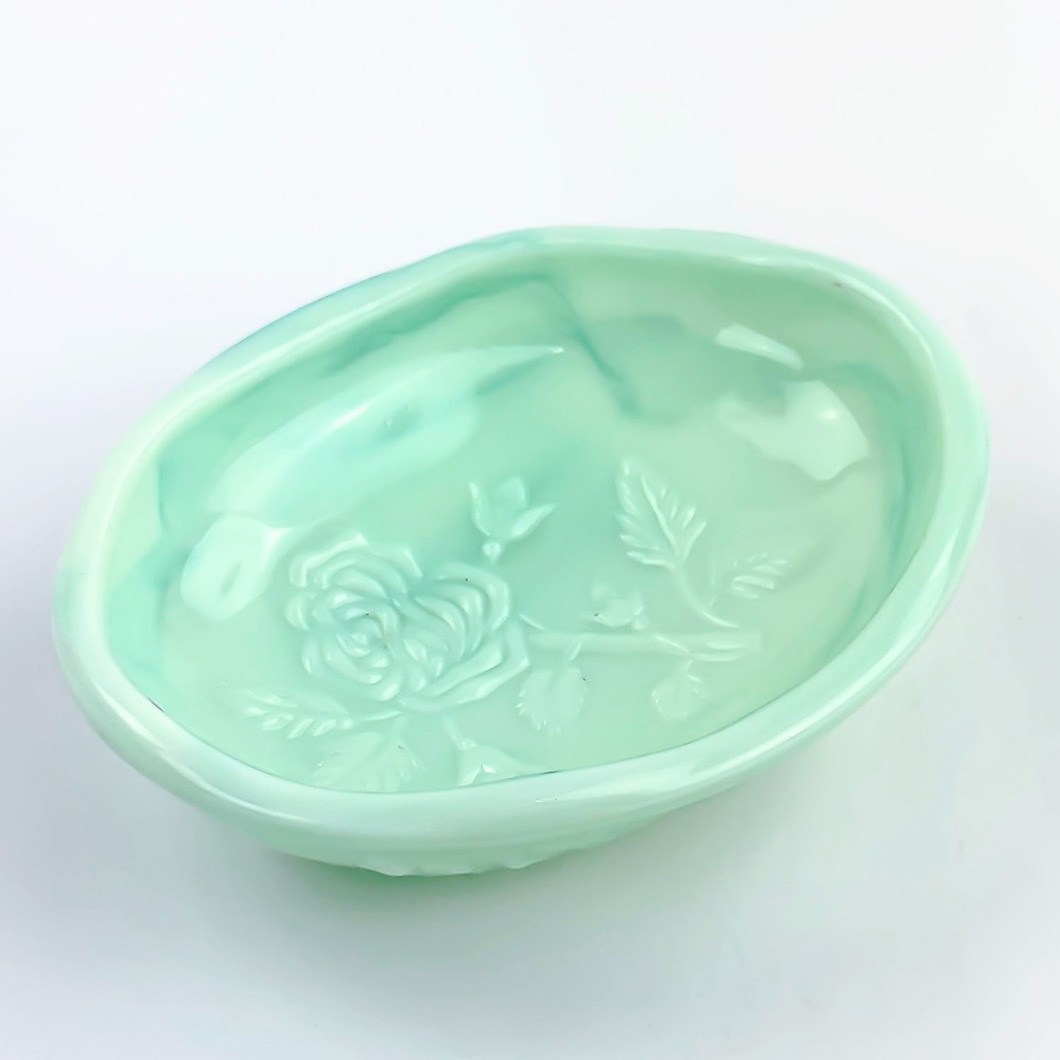 #8799 - VINTAGE MARBLED BLUE GREEN SLAG MILK GLASS SOAP DISH - AVON COLLECTIBLE. FLORAL ROSE DESIGN - HOME BATHROOM DECOR. MEASURES: 5.125” (13 CM) LONG BY 4”(10 CM) WIDE