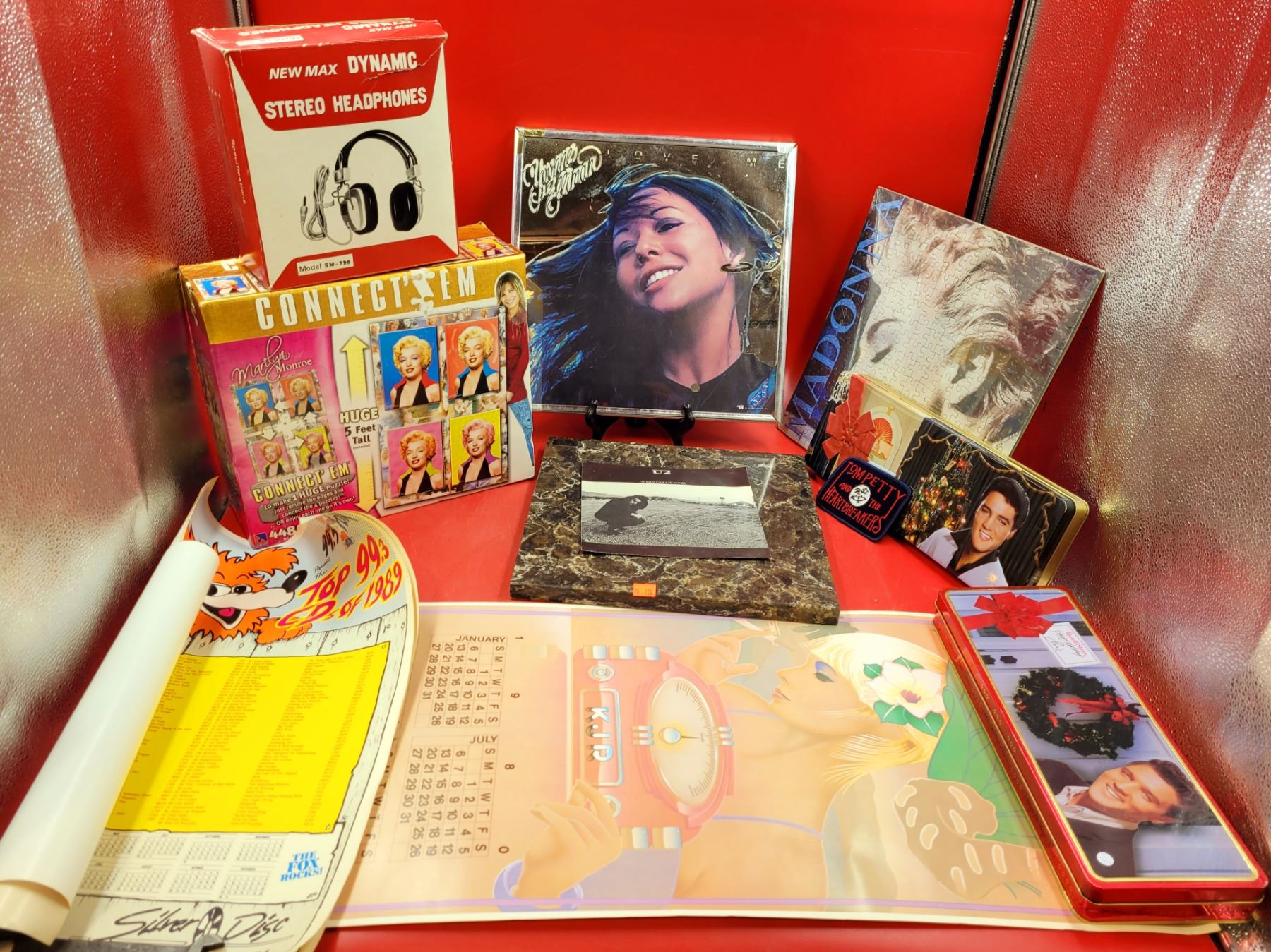 VTG Advertising Calendar, Vinyl Records, Marilyn Monroe Puzzle, Headphones, Elvis Boxes, & More