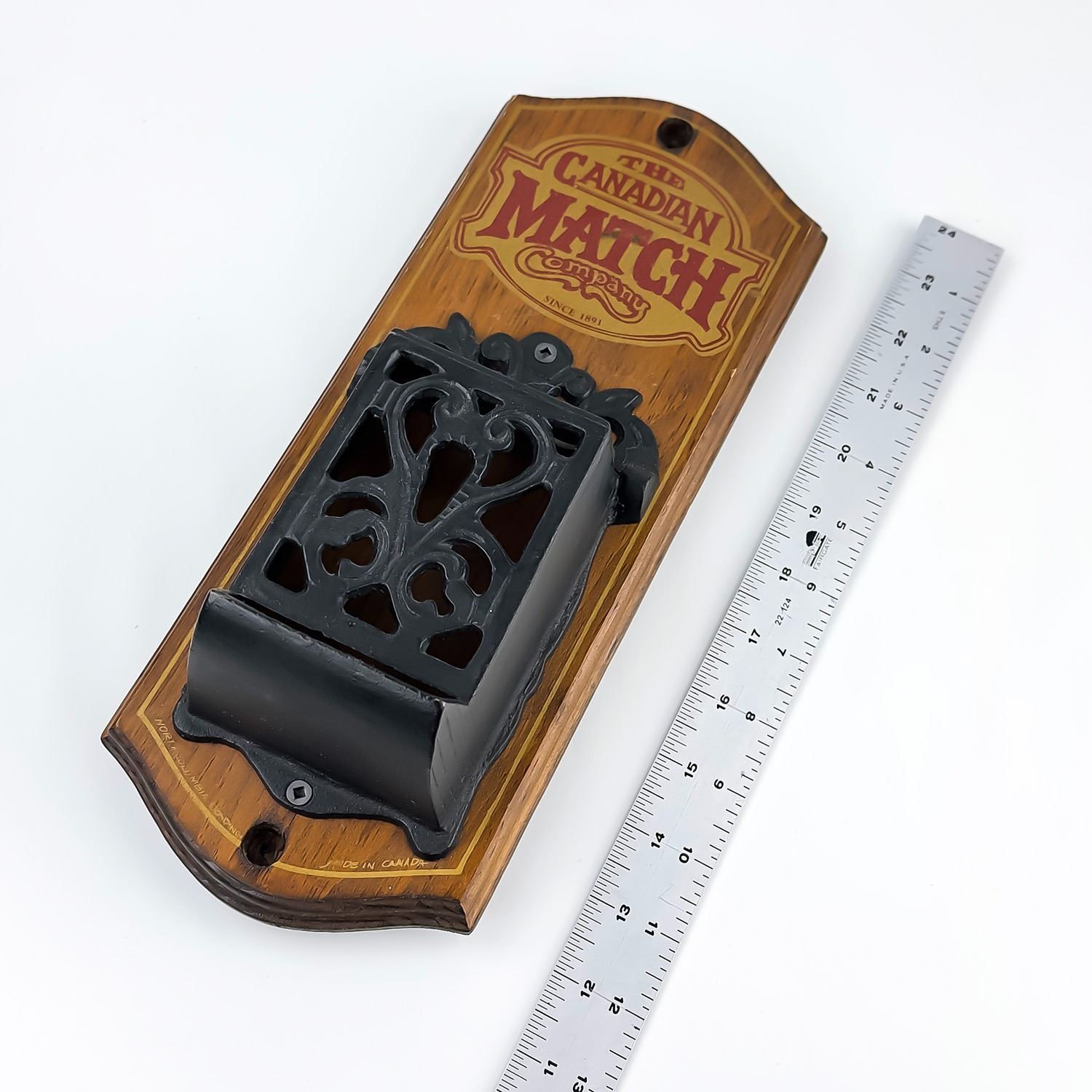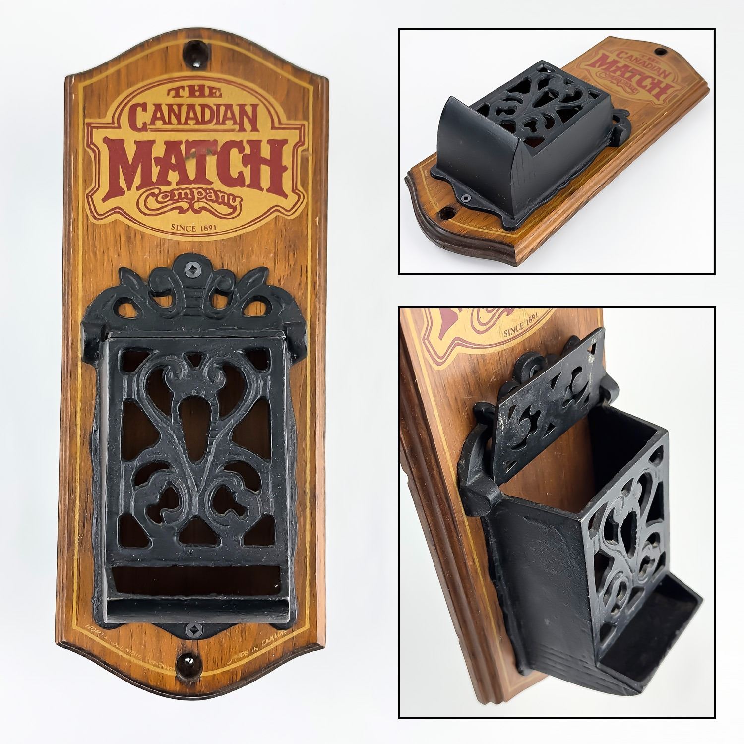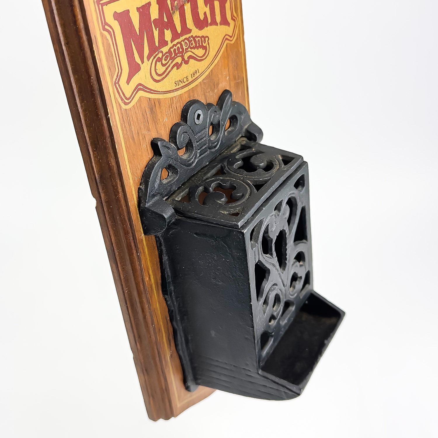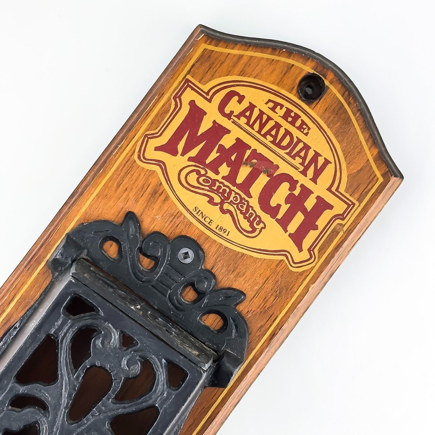 #8529 - VINTAGE NEVER USED CANADIAN MATCH COMPANY MATCH MATCHBOX HOLDER. WOODEN WALL DECOR WITH FLIP-TOP CAST IRON MATCH HOLDER - ORIGINAL SCREW & PLUG HARDWARE ATTACHED. NORTH COLUMBIA TRADING CO., ENDERBY, BRITISH COLUMBIA, CANADA STAMP. RUSTIC LOOKING HOME OR FARMHOUSE WALL DECOR SCULPTURE. GREAT VINTAGE CONDITION. MEASURES 13” (33 CM) TALL BY 5.125” (13 CM) WIDE AND 3.75” (9.5 CM) DEEP.