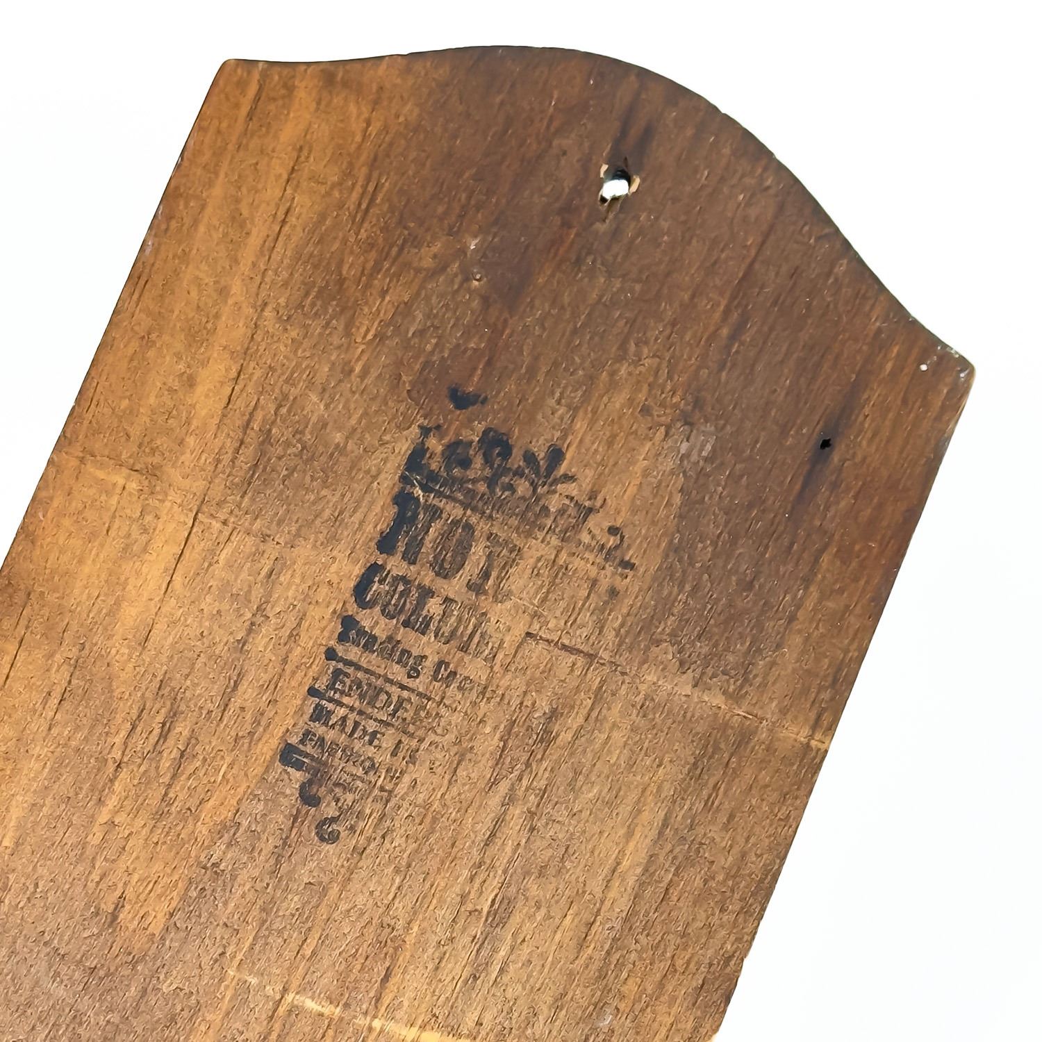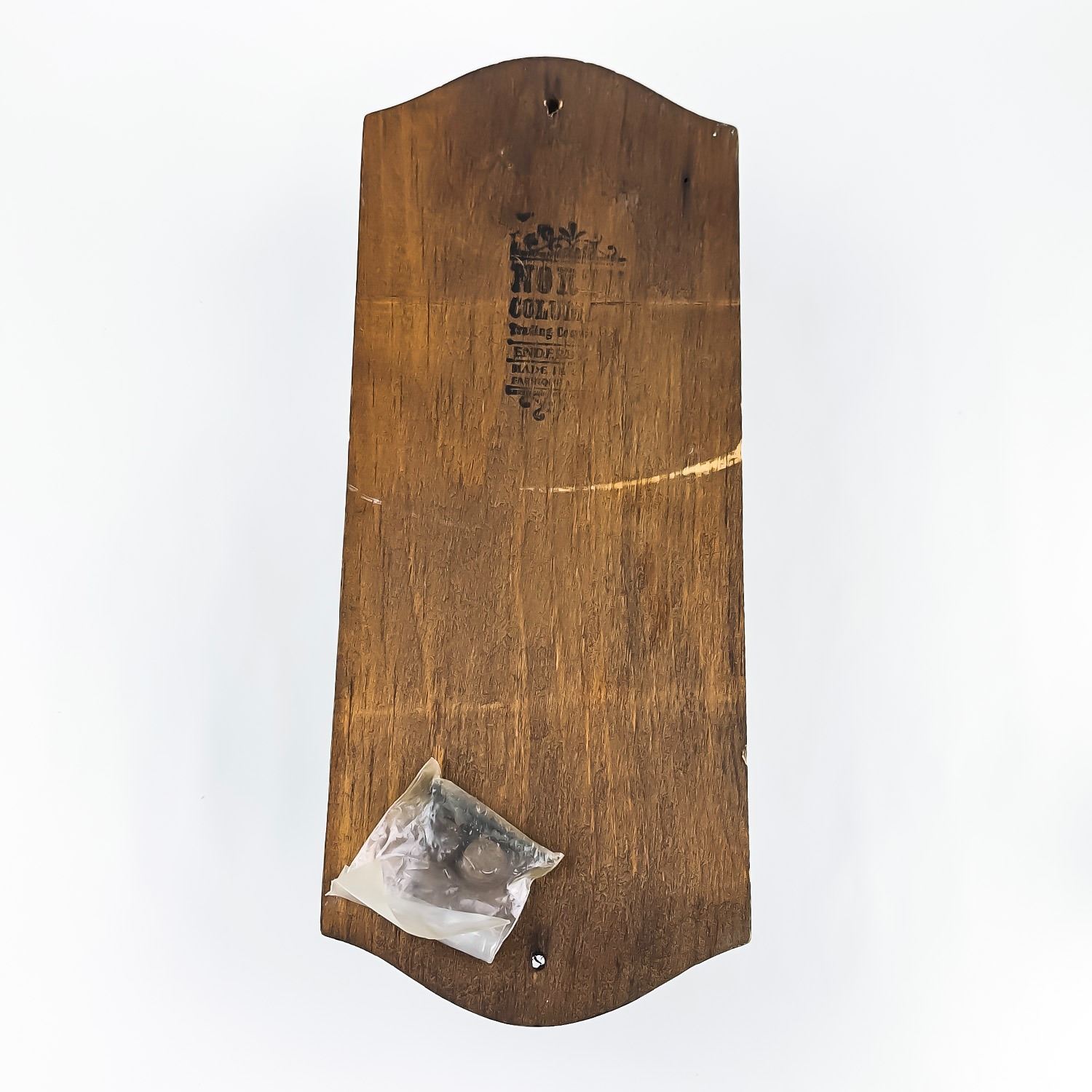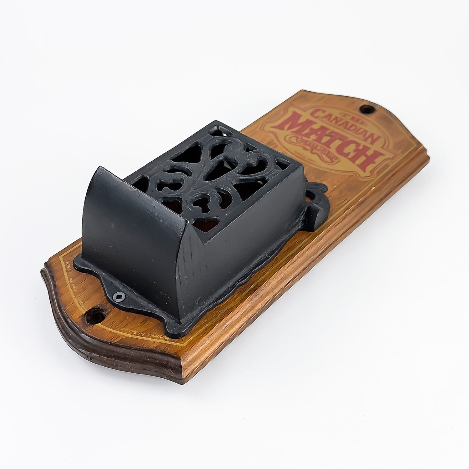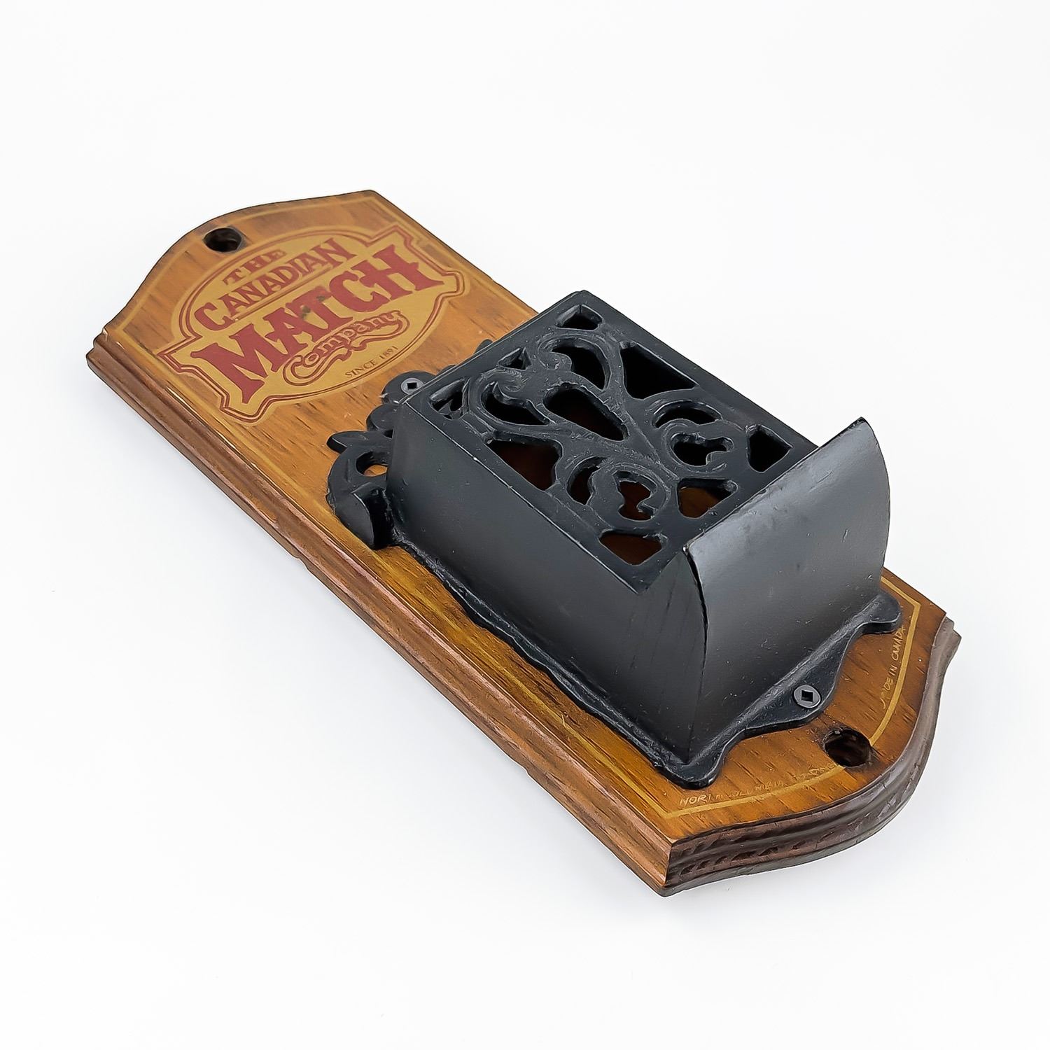 #8529 - VINTAGE NEVER USED CANADIAN MATCH COMPANY MATCH MATCHBOX HOLDER. WOODEN WALL DECOR WITH FLIP-TOP CAST IRON MATCH HOLDER - ORIGINAL SCREW & PLUG HARDWARE ATTACHED. NORTH COLUMBIA TRADING CO., ENDERBY, BRITISH COLUMBIA, CANADA STAMP. RUSTIC LOOKING HOME OR FARMHOUSE WALL DECOR SCULPTURE. GREAT VINTAGE CONDITION. MEASURES 13” (33 CM) TALL BY 5.125” (13 CM) WIDE AND 3.75” (9.5 CM) DEEP.