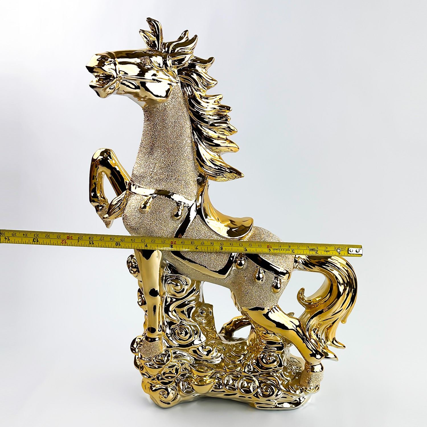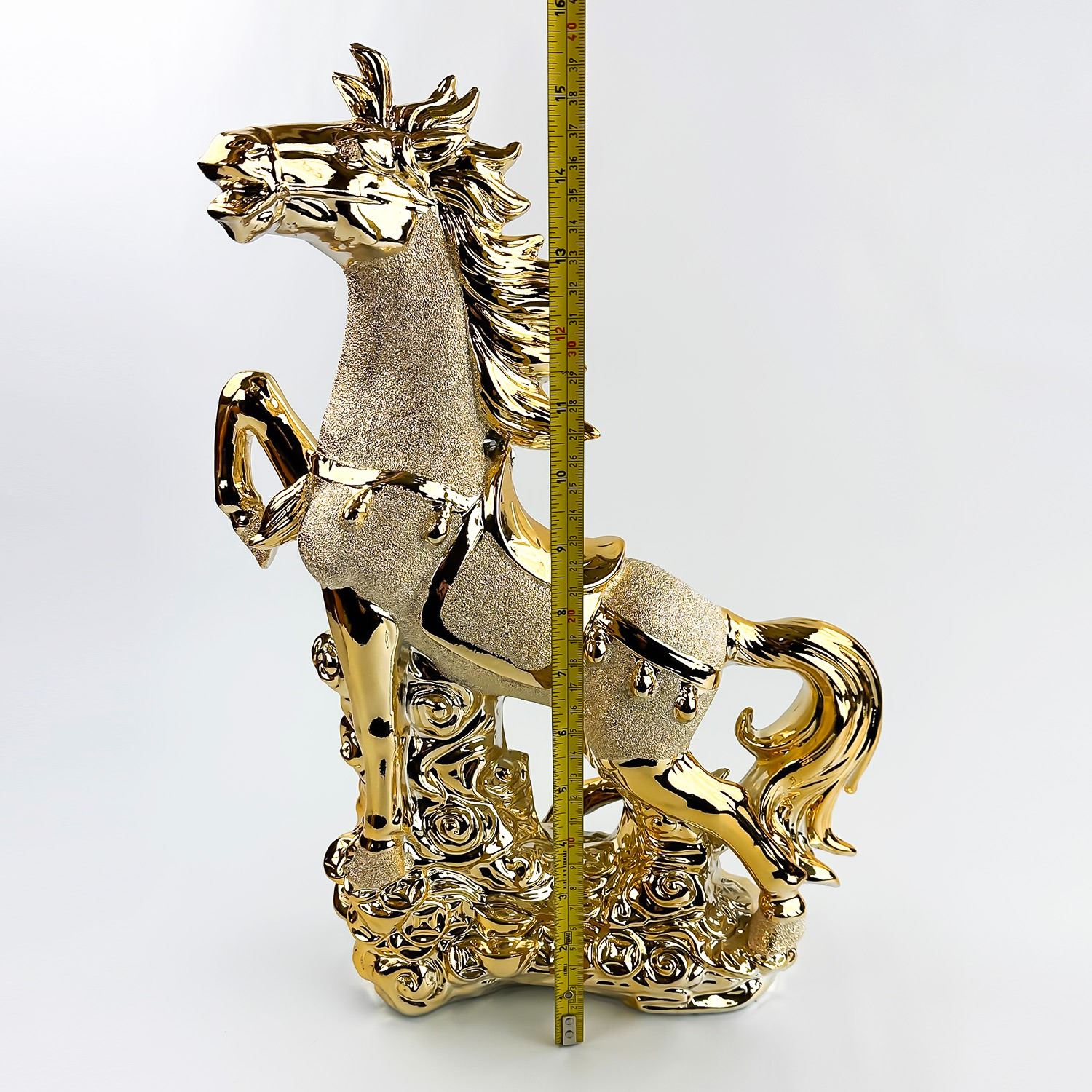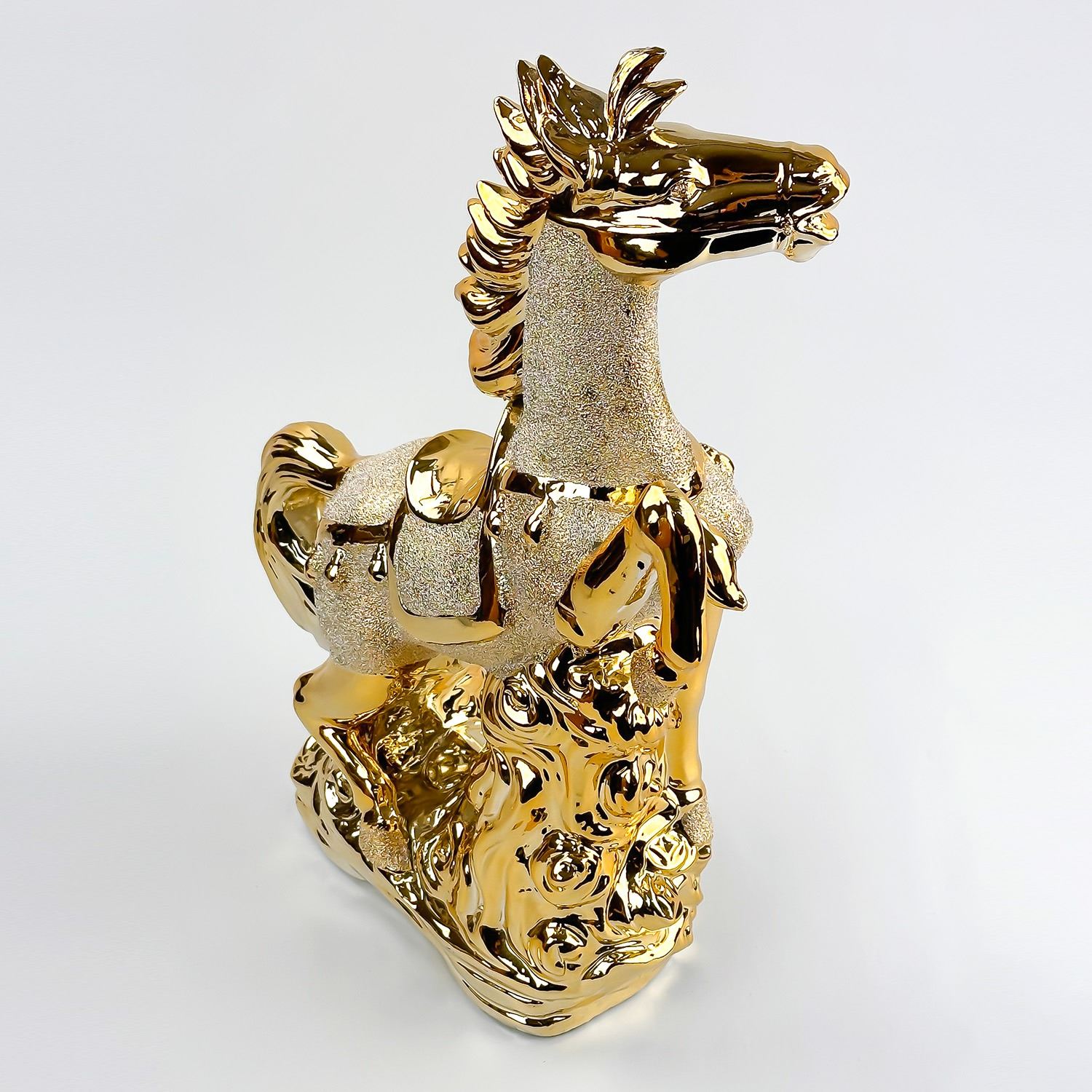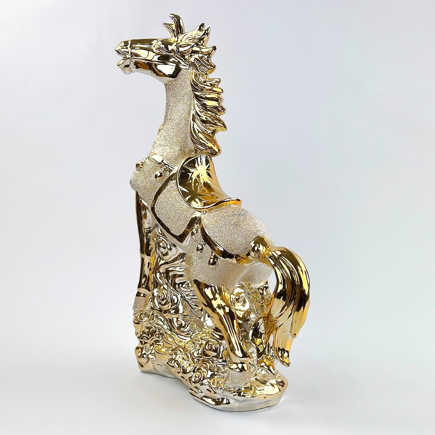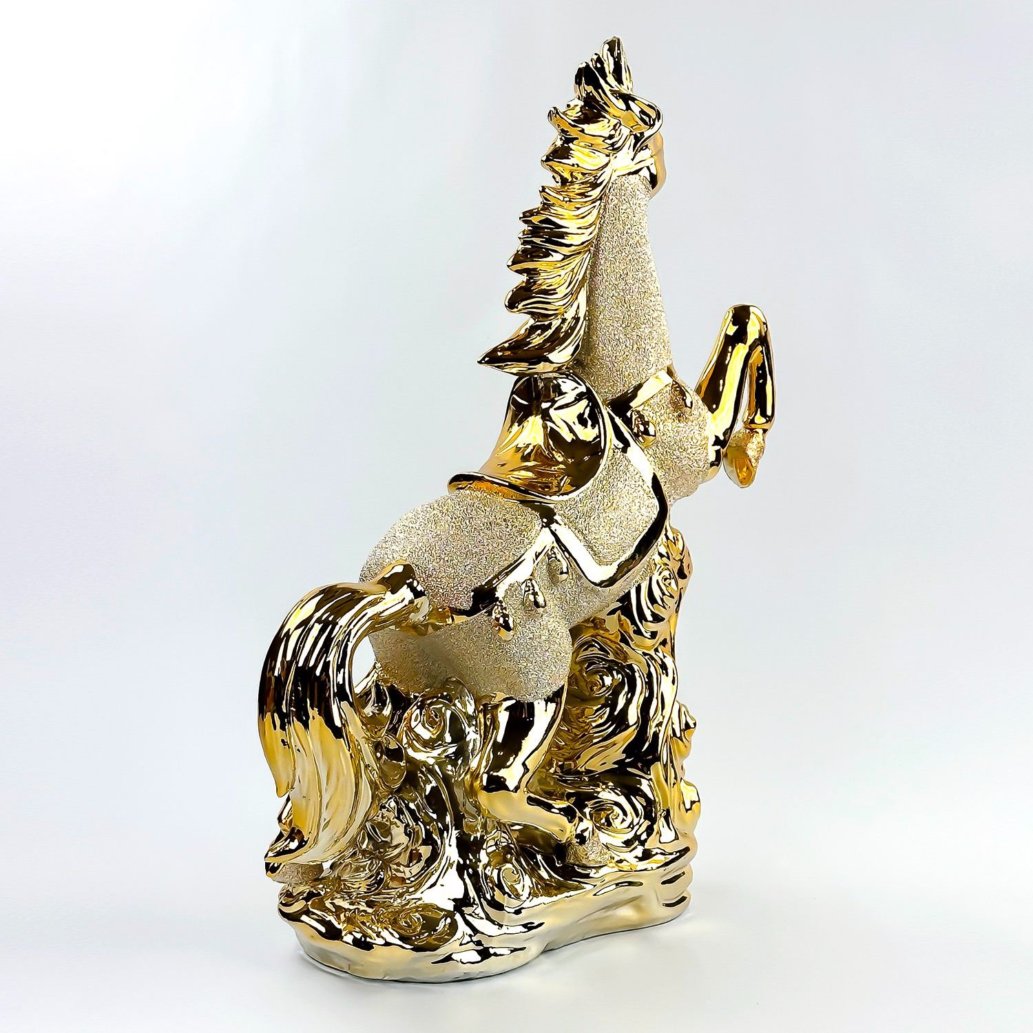 #8014 - VINTAGE CERAMIC GOLD COLOUR HORSE STALLION ANIMAL ART FIGURINE SCULPTURE. MANUFACTURER AND AGE UNKNOWN - MARK ON BOTTOM. HOME OR OFFICE DECOR STATUE - NO CRACKS, CHIPS OR REPAIRS. MEASURES: 16” (41 CM) TALL BY 12” (30.5 CM) WIDE AND 4.5” (11.5 CM) DEEP