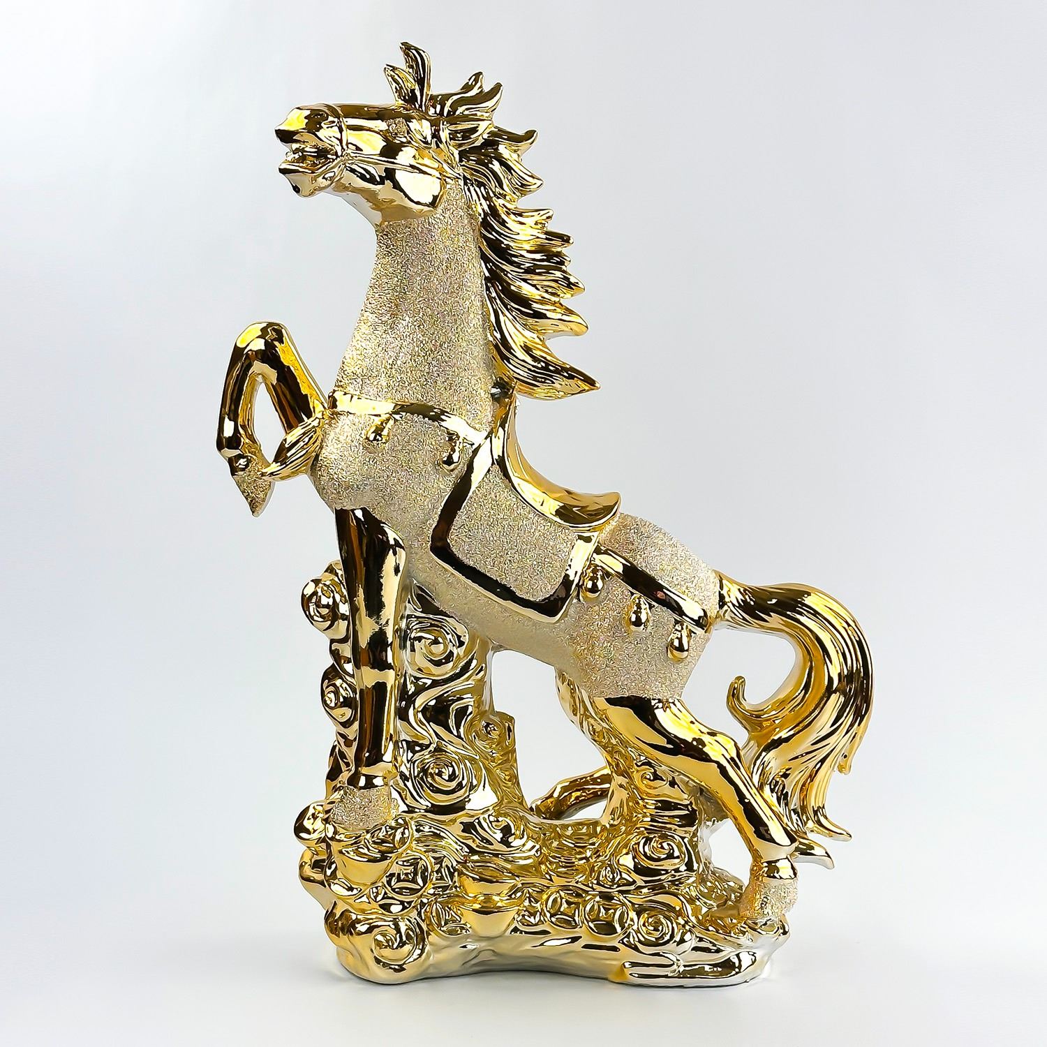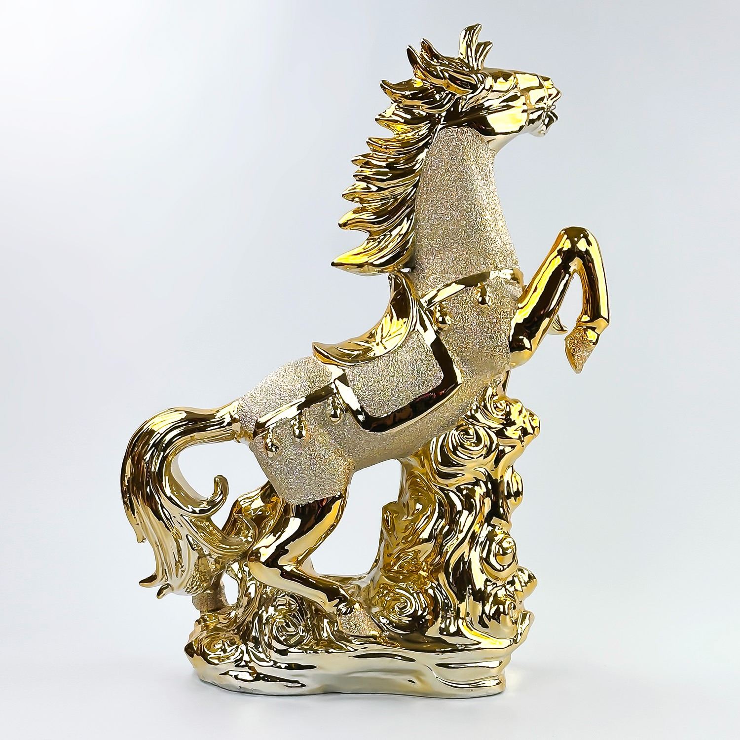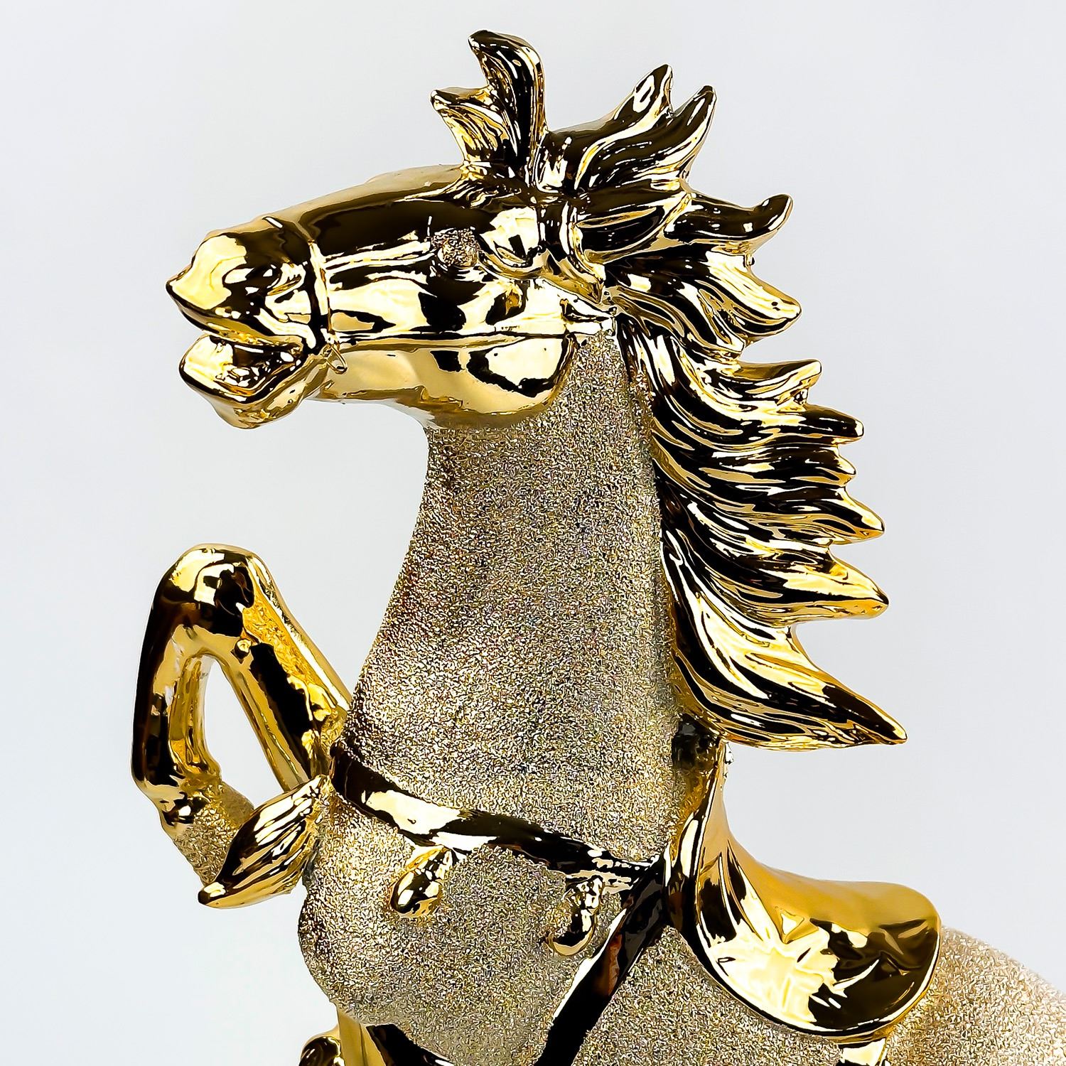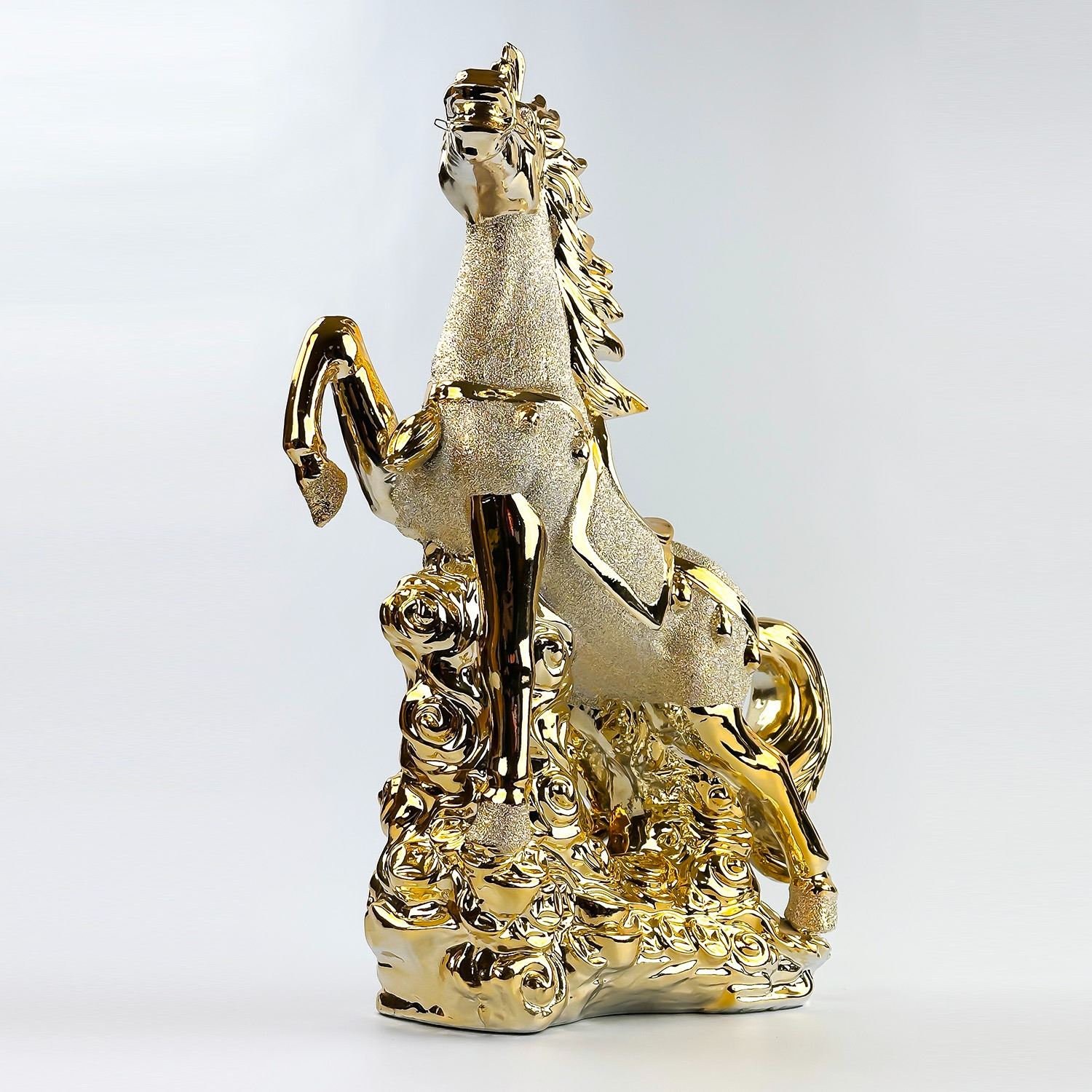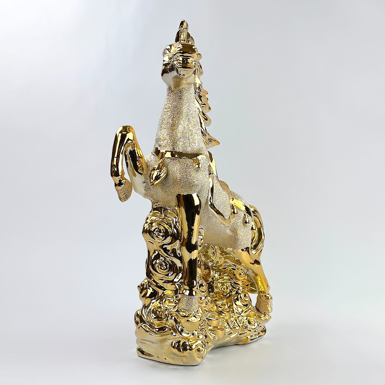 #8014 - VINTAGE CERAMIC GOLD COLOUR HORSE STALLION ANIMAL ART FIGURINE SCULPTURE. MANUFACTURER AND AGE UNKNOWN - MARK ON BOTTOM. HOME OR OFFICE DECOR STATUE - NO CRACKS, CHIPS OR REPAIRS. MEASURES: 16” (41 CM) TALL BY 12” (30.5 CM) WIDE AND 4.5” (11.5 CM) DEEP