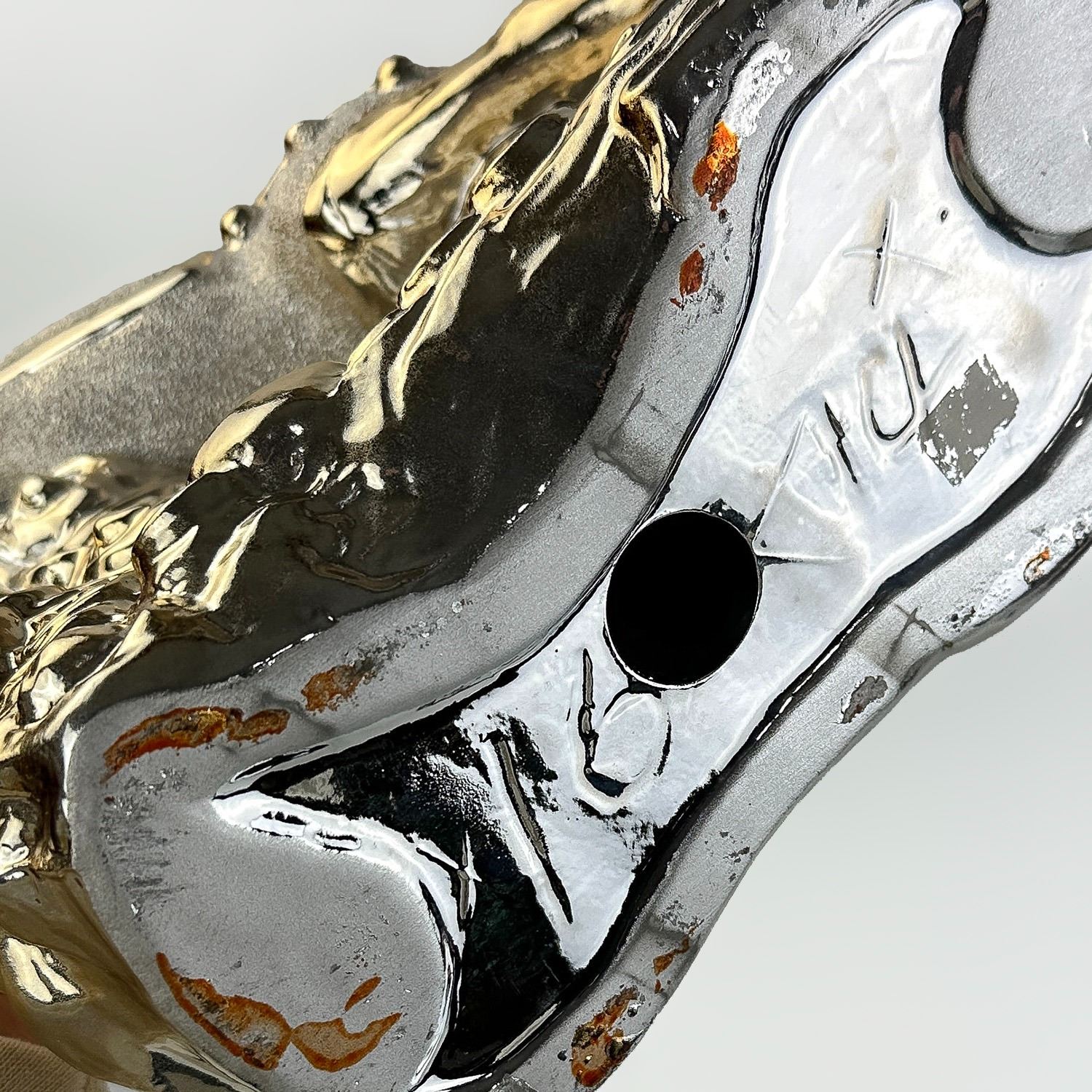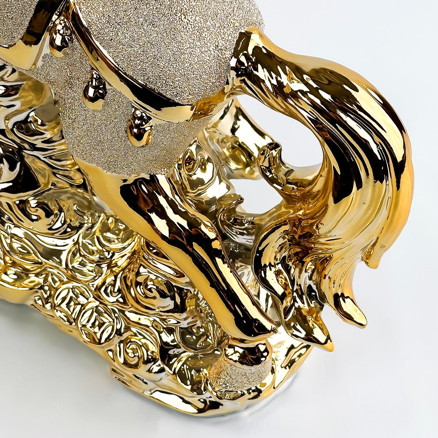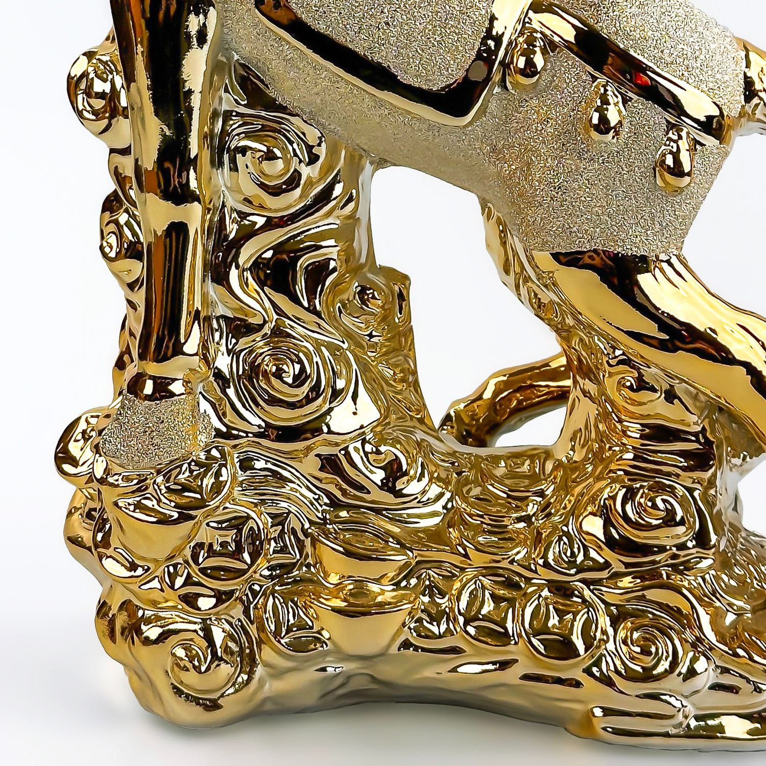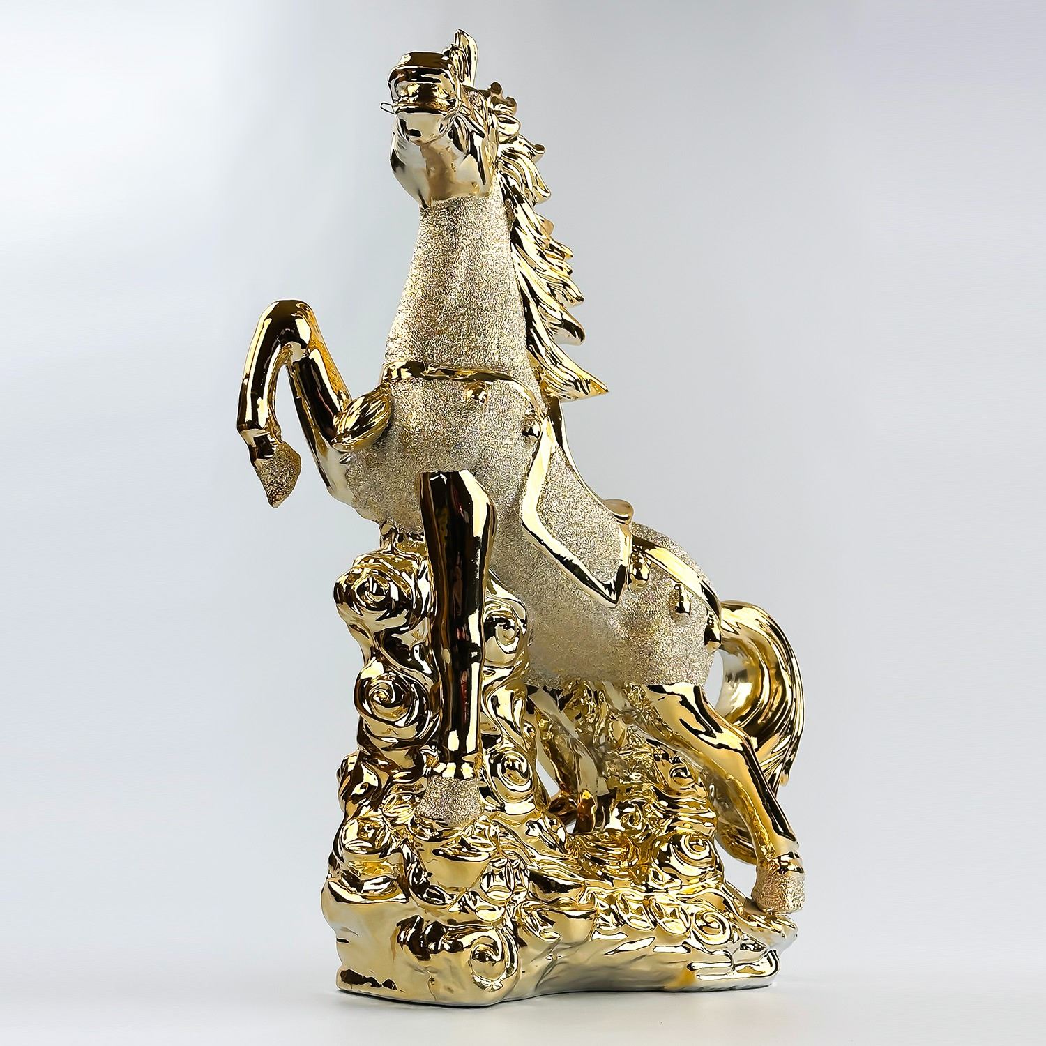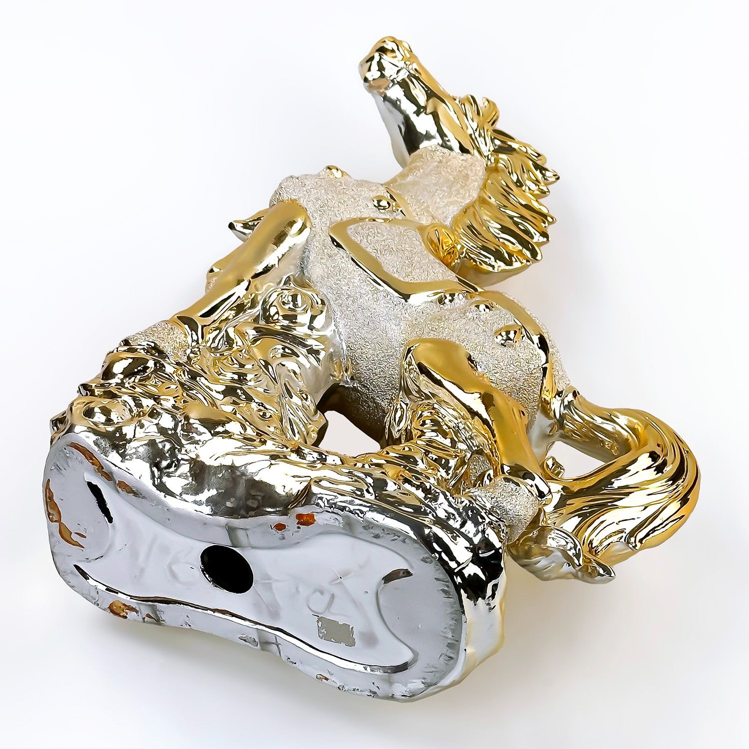 #8014 - VINTAGE CERAMIC GOLD COLOUR HORSE STALLION ANIMAL ART FIGURINE SCULPTURE. MANUFACTURER AND AGE UNKNOWN - MARK ON BOTTOM. HOME OR OFFICE DECOR STATUE - NO CRACKS, CHIPS OR REPAIRS. MEASURES: 16” (41 CM) TALL BY 12” (30.5 CM) WIDE AND 4.5” (11.5 CM) DEEP