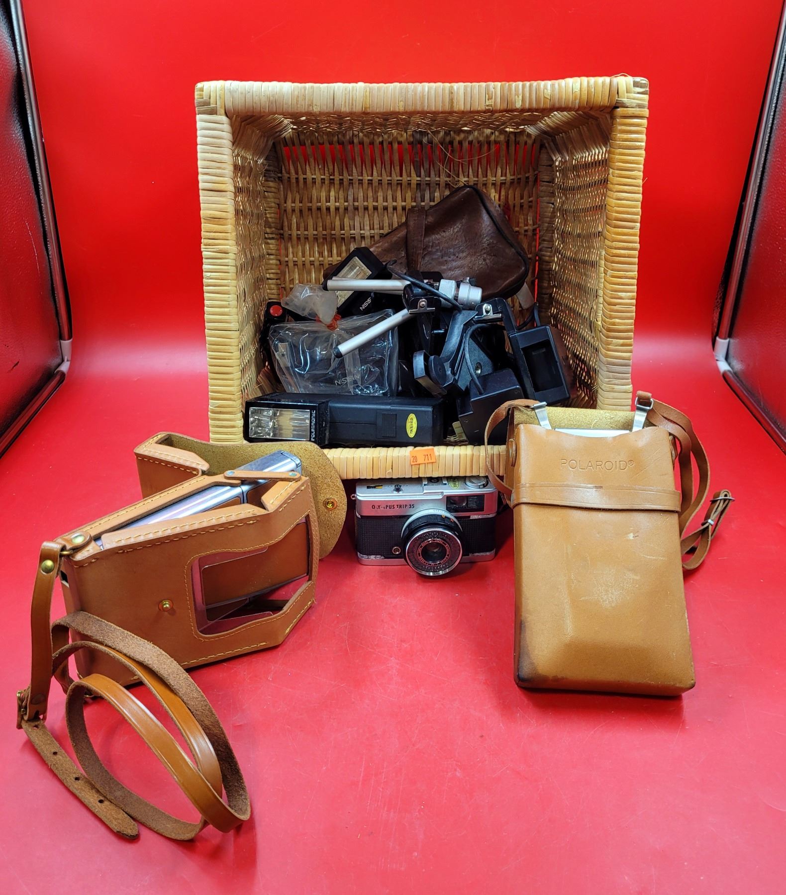 VTG Camera & Accessory Lot w/ Tripod, Olympus Trip Camera, Polaroid Camera, & More