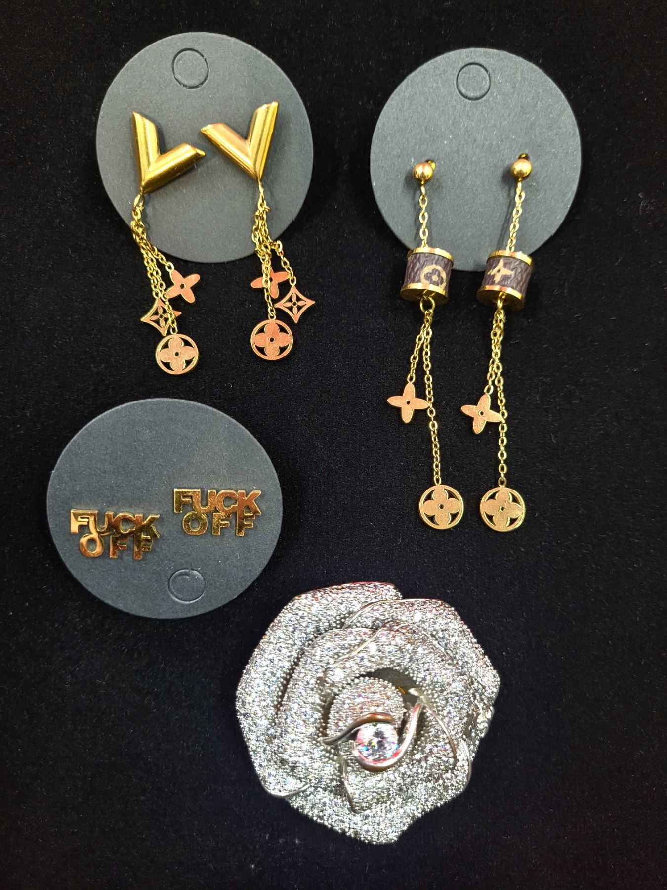 VTG Chanel Brooch, 2 Pairs of Replica Louis Vuitton Earrings, & Fuck Off Earrings w/ Tiffany Box