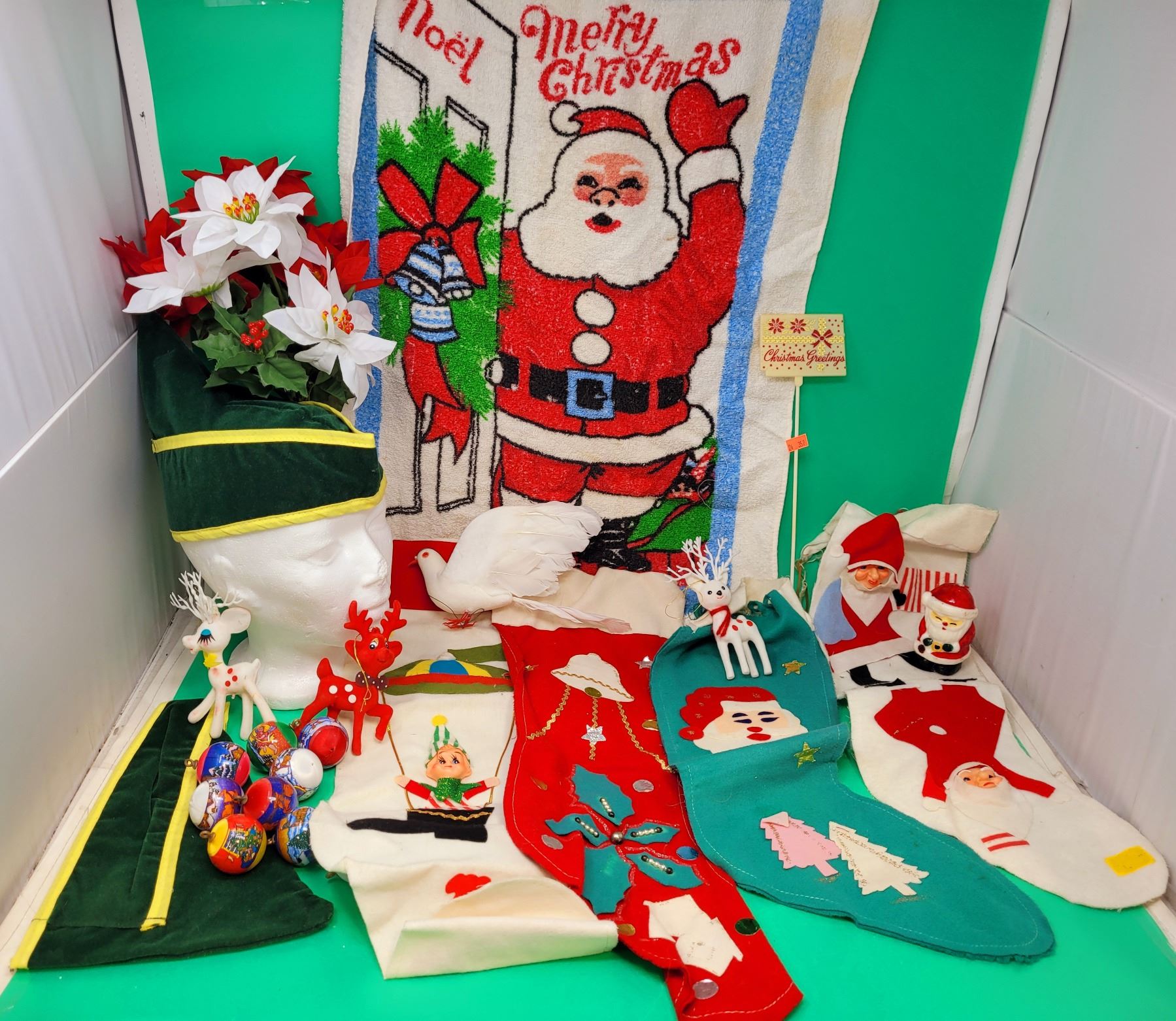 VTG Christmas Decor Lot w/ Stockings, Towel, & More