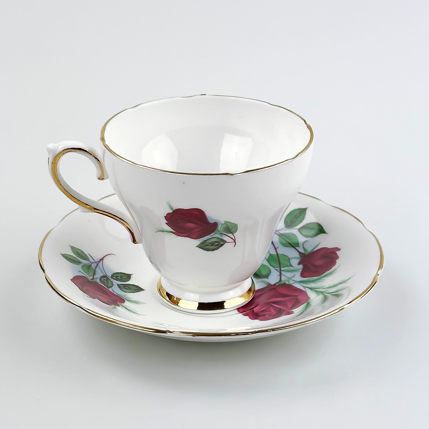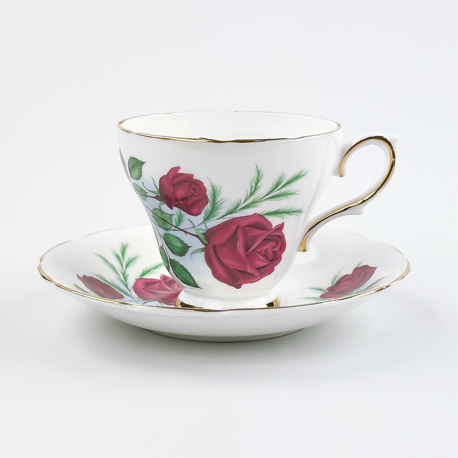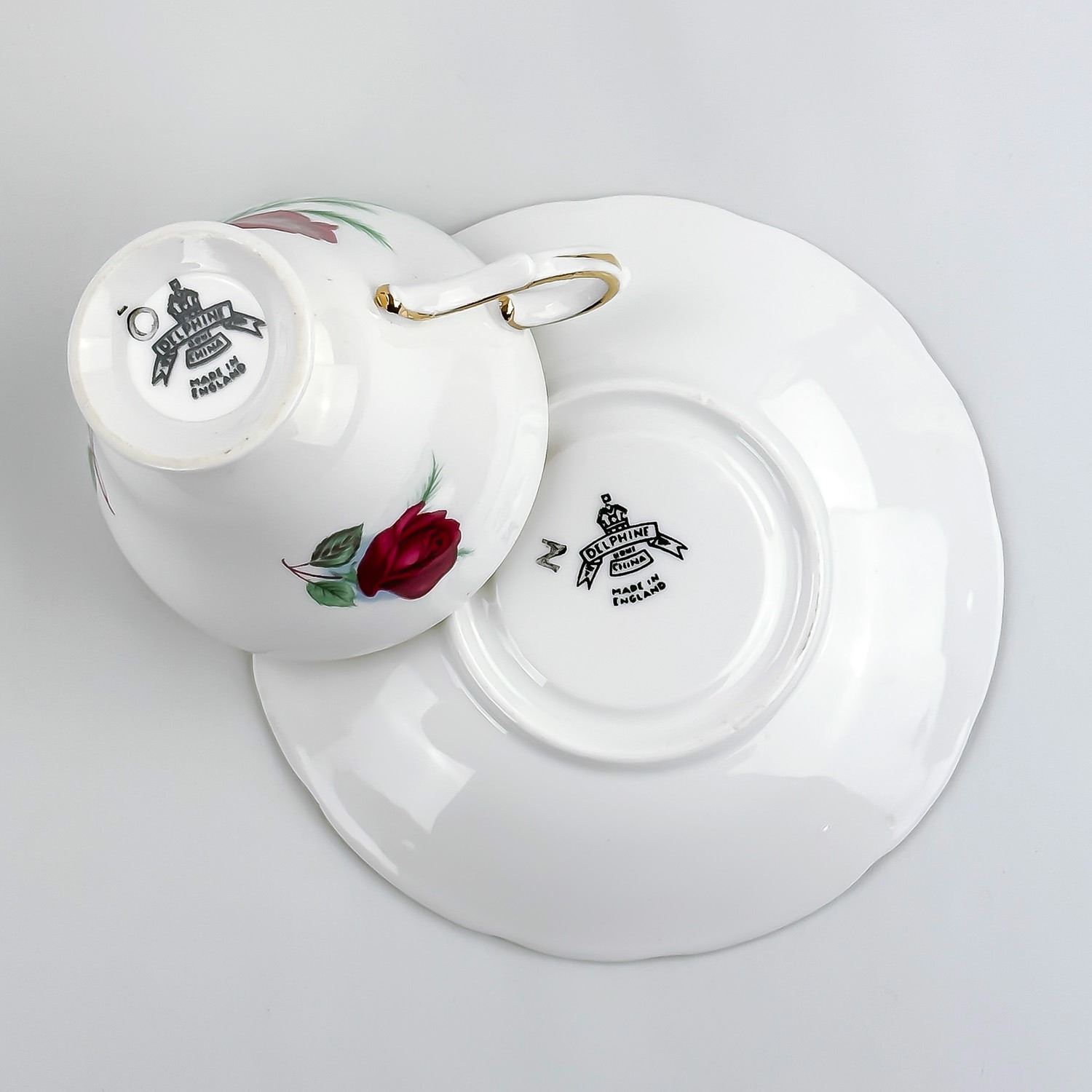 #9298 - VINTAGE COLLECTIBLE DELPHINE TEA CUP & SAUCER SET - FINE BONE CHINA - MADE IN ENGLAND. FLORAL RED ROSES FLOWERS PATTERN WITH GOLD TRIM. KITCHEN KITCHENWARE TEACUP