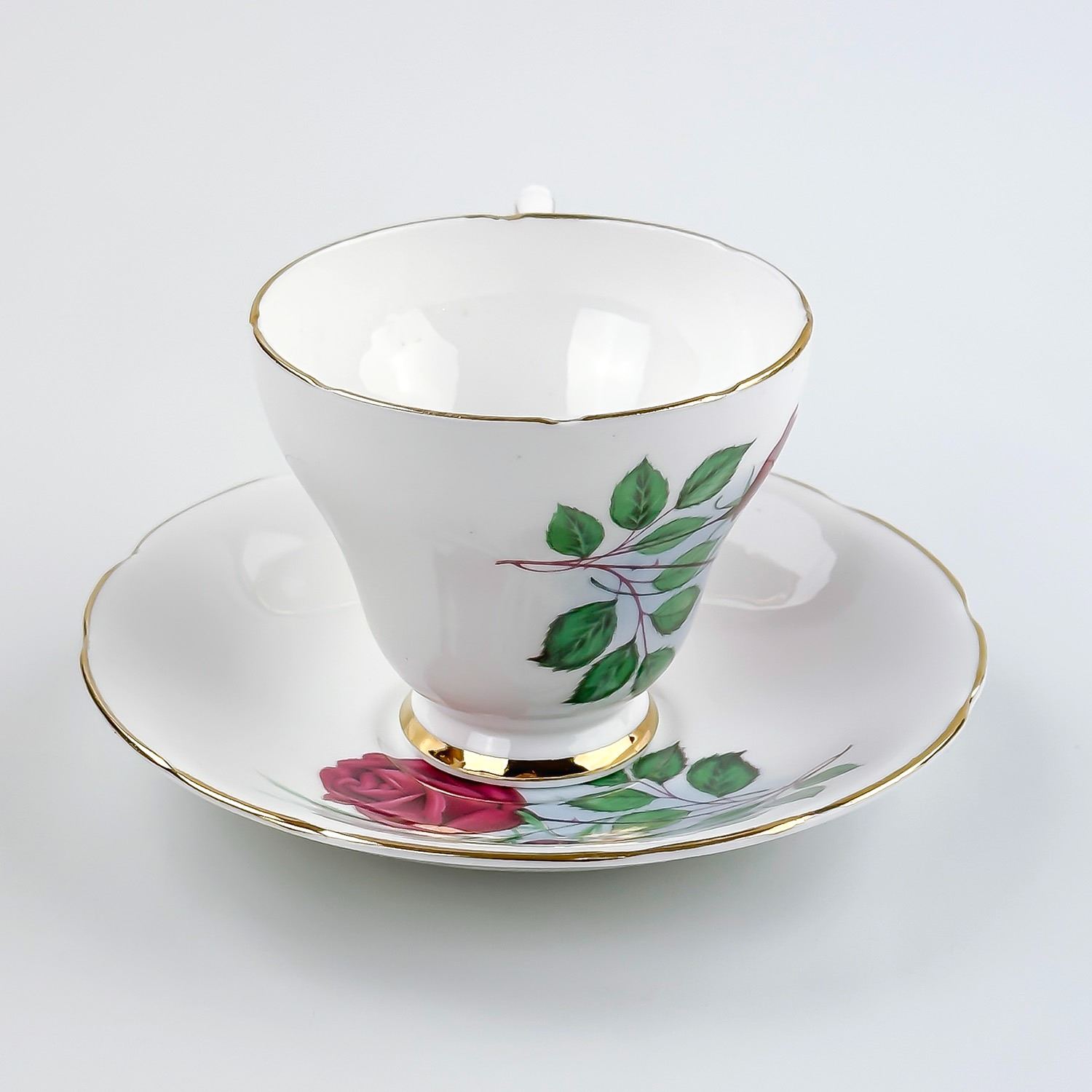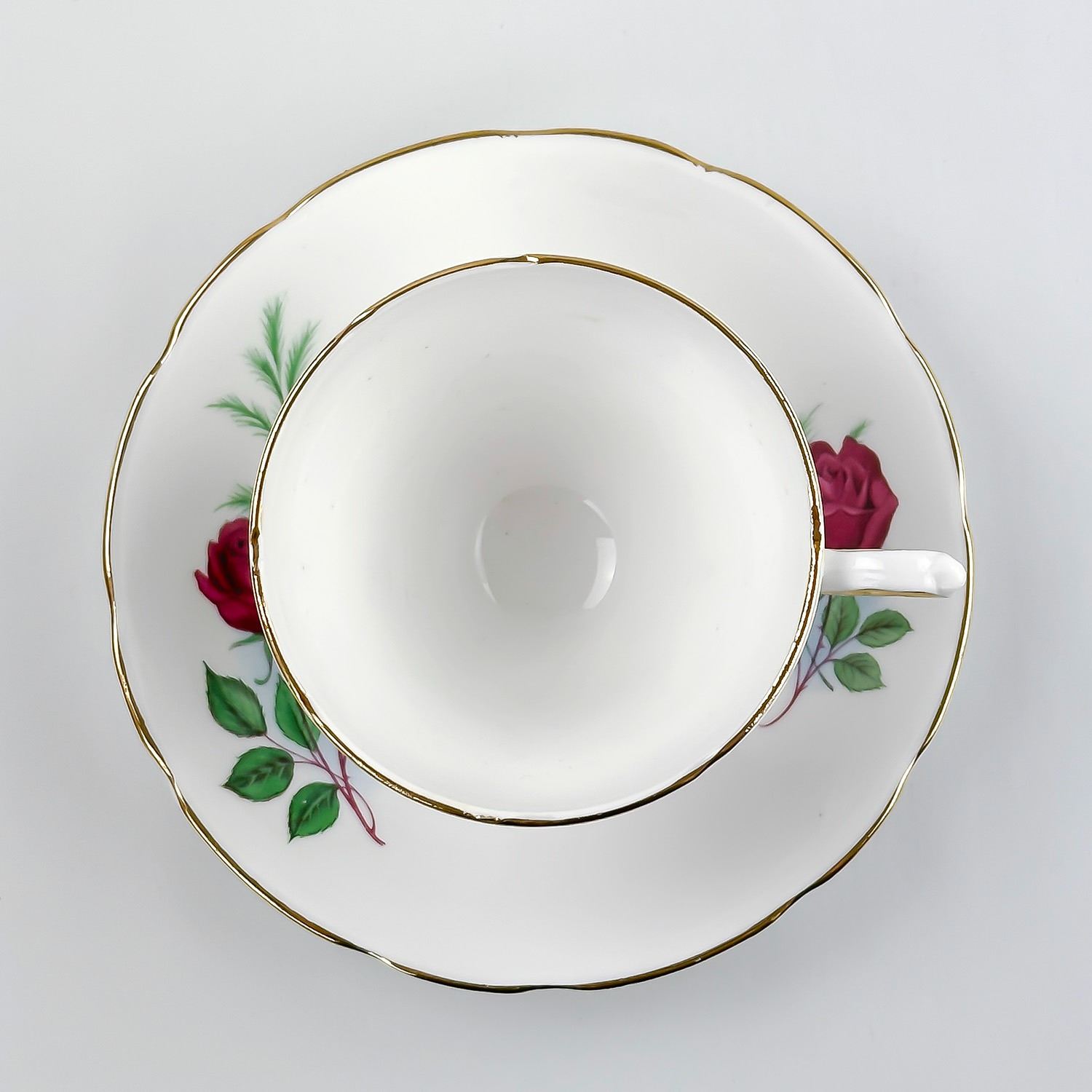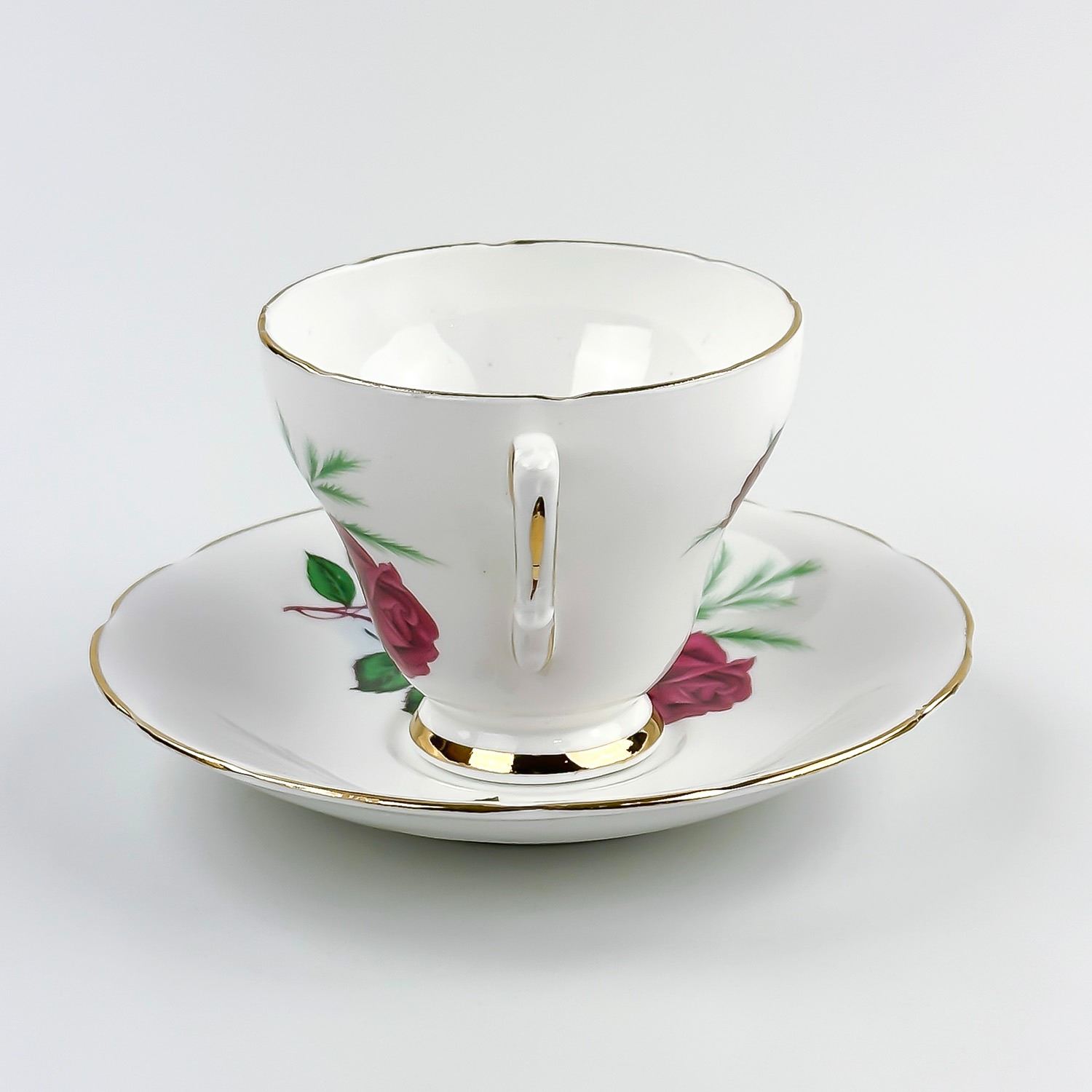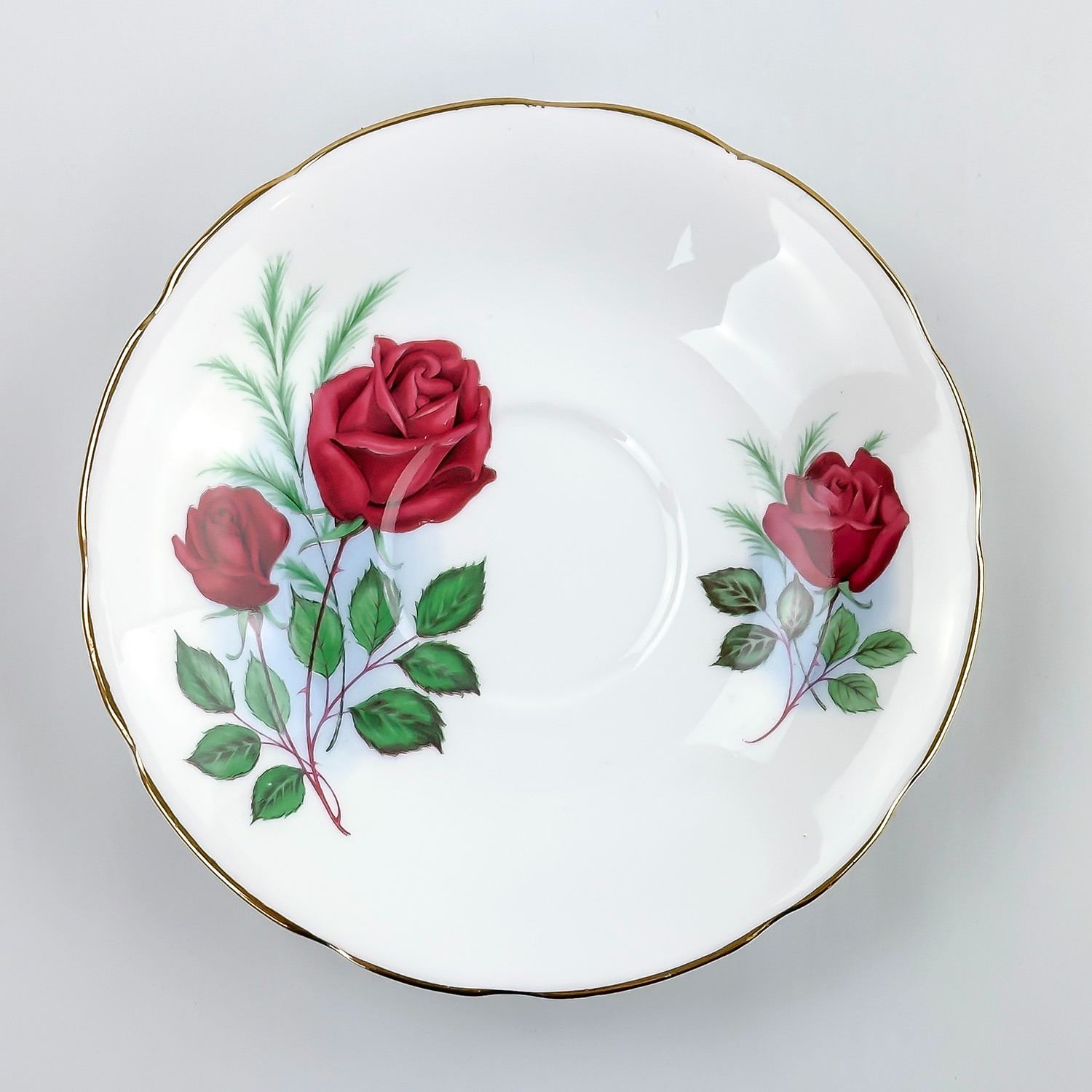 #9298 - VINTAGE COLLECTIBLE DELPHINE TEA CUP & SAUCER SET - FINE BONE CHINA - MADE IN ENGLAND. FLORAL RED ROSES FLOWERS PATTERN WITH GOLD TRIM. KITCHEN KITCHENWARE TEACUP